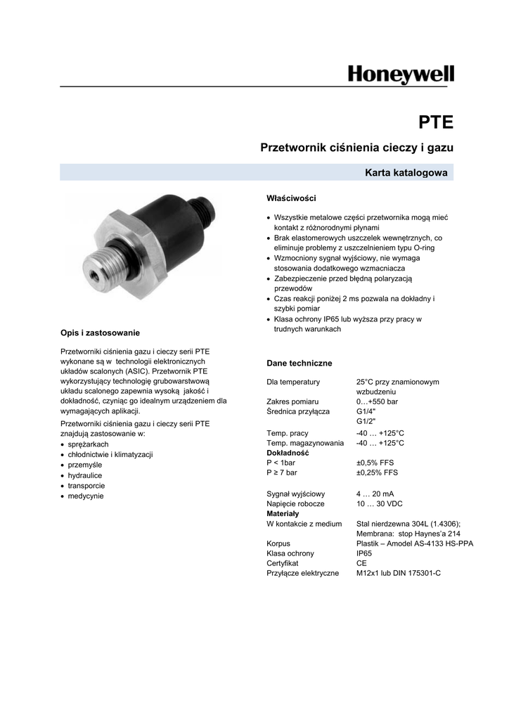 PTE Przetwornik ciśnienia cieczy i gazu Karta katalogowa Właściwości Opis i zastosowanie Wszystkie metalowe części przetwornika mogą mieć kontakt z różnorodnymi płynami Brak elastomerowych uszczelek wewnętrznych, co eliminuje problemy z uszczelnieniem typu O-ring Wzmocniony sygnał wyjściowy, nie wymaga stosowania dodatkowego wzmacniacza Zabezpieczenie przed błędną polaryzacją przewodów Czas reakcji poniżej 2 ms pozwala na dokładny i szybki pomiar Klasa ochrony IP65 lub wyższa przy pracy w trudnych warunkach Przetworniki ciśnienia gazu i cieczy serii PTE wykonane są w technologii elektronicznych układów scalonych (ASIC). Przetwornik PTE wykorzystujący technologię grubowarstwową układu scalonego zapewnia wysoką jakość i dokładność, czyniąc go idealnym urządzeniem dla wymagających aplikacji. Przetworniki ciśnienia gazu i cieczy serii PTE znajdują zastosowanie w: sprężarkach chłodnictwie i klimatyzacji przemyśle hydraulice transporcie medycynie Dane techniczne Dla temperatury Zakres pomiaru Średnica przyłącza Temp. pracy Temp. magazynowania Dokładność P < 1bar P ≥ 7 bar -40 … +125°C -40 … +125°C Sygnał wyjściowy Napięcie robocze Materiały W kontakcie z medium 4 … 20 mA 10 … 30 VDC Korpus Klasa ochrony Certyfikat Przyłącze elektryczne 25°C przy znamionowym wzbudzeniu 0…+550 bar G1/4" G1/2" ±0,5% FFS ±0,25% FFS Stal nierdzewna 304L (1.4306); Membrana: stop Haynes’a 214 Plastik – Amodel AS-4133 HS-PPA IP65 CE M12x1 lub DIN 175301-C Przetwornik ciśnienia cieczy i gazu serii PTE Dane techniczne Tabela 1. Zakresy ciśnień dla temp. 25°C i przy znamionowym wartości wzbudzeniu (o ile nie podano inaczej) bar Ciśnienie 6 10 16 25 40 60 100 160 250 350 500 550 Ciśnienie 18 30 48 75 80 120 200 320 500 700 750 825 próbne Ciśnienie 60 100 160 250 400 600 1000 1600 2068 2068 2068 2068 rozrywające Tabela 2. Dane techniczne i środowiskowe Parametr Materiały w kontakcie z medium Materiał korpusu Waga Wstrząs Wibracje Elektroniczna dystrybucja oprogramowania ESD Odporność na promieniowanie Impulsy przepięciowe Odporność na zaburzenia przewodzenia Emisja promieniowania Temperatura pracy Temperatura magazynowania Certyfikaty Charakterystyka Port: stal nierdzewna 304L (1,4306); membrana: stop Haynes’a 214 Plastik – Amodel AS-4133 HS - PPA 57 g (typowa dla G 1/4") 100 g peak (11 ms) MIL-ST-810C, Figure 514.2-5, k=Krzywa AK, Tabela 514.2-V, Losowy test drgań (ogólna średnia kwadratowa = 20,7 min.) IEC 61000-4-2:2008 lub późniejszy dodatek IEC 61000-4-3:2006 lub późniejszy dodatek IEC 61000-4-4:2004 lub późniejszy dodatek IEC 61000-4-6:2008 lub późniejszy dodatek CISPR 11:2009 lub późniejszy dodatek -40 … +125°C (patrz rys. 1) -40 … +125°C CE Tabela 3. Dokładność w temp. 25°C przy znamionowym wzbudzeniu (o ile nie podano inaczej) Parametr Charakterystyka Czas reakcji < 2 ms Dokładność, BFSL1: ≥ 100 psi ±0.25% FFS < 100 psi ±0,50% FFS Maksymalne pasmo błędu urządzenia ±3% FFS pomiarowego2: <300 psig ±2% FFS ≥300 psig 1 Obejmuje nieliniowość ciśnienia, histerezę oraz niepowtarzalność. Błędy termiczne nie są uwzględnione. błąd rozruchu, błąd rozpiętości, efekt termiczny przy rozruchu, histerezę termiczną, nieliniowość ciśnienia, histerezę ciśnienia oraz niepowtarzalność. 2Obejmuje 2 Przetwornik ciśnienia cieczy i gazu serii PTE Rys. 1. Obszar eksploatacji i kompensacji temperatury dla sygnały wyjściowego 4 … 20 mA UWAGA: Obszar pracy powiększony przy zastosowaniu rezystora 250 Ω. Większe obciążenie powiększa obszar pracy. Linią przerywaną określono obszar pracy z uwzględnieniem kompensacji temperatury przy zasilaniu 24 V i obciążeniu 250 Ω. Rys. 2. Sposoby podłączenia Tabela 4. Wtyki i przewody dla M12X1 Brada Harrisona i DIN 175301 (43650) forma C Wtyk Prąd 1 + prąd wzbudzenia 2 - prąd wzbudzenia 3 N/C 4 N/C 3 Przetwornik ciśnienia cieczy i gazu serii PTE Rys. 3. Wymiary (mm) Rys. 4. Uszczelnienie O-ring OZNACZENIA KATALOGOWE PRZYKŁAD ZAMÓWIENIA PRZETWORNIKA CIŚNIENIA 0…6 bar Z WTYKIEM M12X1 I PRZYŁĄCZEM 1/4": PTE006BGD14B Rys. 5. Numer katalogowy Honeywell sp. z o.o. Ul. Domaniewska 39 B 02‐672 Warszawa Tel.: 22 6060 900 faks; 22 6060 983 www.honeywell.com.pl/automatyka_domow 4 PTE‐k‐pl01rMW0316