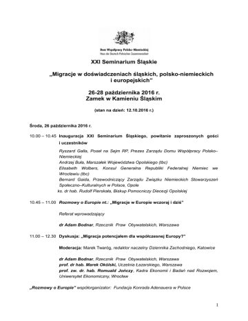 XXI Seminarium Śląskie „Migracje w doświadczeniach śląskich, polsko-niemieckich i europejskich” 26-28 października 2016 r. Zamek w Kamieniu Śląskim (stan na dzień: 12.10.2016 r.) Środa, 26 października 2016 r. 10.00 – 10.45 Inauguracja XXI Seminarium Śląskiego, powitanie zaproszonych gości i uczestników Ryszard Galla, Poseł na Sejm RP, Prezes Zarządu Domu Współpracy Polsko– Niemieckiej Andrzej Buła, Marszałek Województwa Opolskiego (tbc) Elisabeth Wolbers, Konsul Generalna Republiki Federalnej Niemiec we Wrocławiu (tbc) Bernard Gaida, Przewodniczący Zarządu Związku Niemieckich Stowarzyszeń Społeczno–Kulturalnych w Polsce, Opole ks. dr hab. Rudolf Pierskała, Biskup Pomocniczy Diecezji Opolskiej 10.45 – 11.00 Rozmowy o Europie nt.: „Migracje w Europie wczoraj i dziś” Referat wprowadzający dr Adam Bodnar, Rzecznik Praw Obywatelskich, Warszawa 11.00 – 12.30 Dyskusja: „Migracja potencjałem dla współczesnej Europy?” Moderacja: Marek Twaróg, redaktor naczelny Dziennika Zachodniego, Katowice dr Adam Bodnar, Rzecznik Praw Obywatelskich, Warszawa prof. dr hab. Marek Okólski, Uczelnia Łazarskiego, Warszawa prof. zw. dr. hab. Romuald Jończy, Kadra Ekonomii i Badań nad Rozwojem, Uniwersytet Ekonomiczny, Wrocław „Rozmowy o Europie” współorganizator: Fundacja Konrada Adenauera w Polsce 1 12.30 – 13.30 Przerwa obiadowa 13.30 – 14.30 I Sesja plenarna – Główne kierunki i formy migracji we współczesnej Europie a polska polityka migracyjna Moderator: prof. zw., dr hab. Romuald Jończy, Przewodniczący Rady Programowej Domu Współpracy Polsko-Niemieckiej 13.30 – 13.50 Problem i znaczenie migracji w przestrzeni euro-maghrebskiej dr Katarzyna Stachurska-Szczesiak, Zakład Stosunków Międzynarodowych, Wydział Politologii, Uniwersytet Marii Skłodowskiej Curie, Lublin 13.50 – 14.10 Kryzys uchodźczy czy kryzys migracyjny – dlaczego europejska polityka migracyjna się nie sprawdziła? dr hab. Maciej Duszczyk, Kamil Matuszczyk, Instytut Polityki Społecznej, Uniwersytet Warszawski 14.10 – 14.30 Kryzys imigracyjny w Europie a polska polityka imigracyjna dr hab. Anita Adamczyk, prof. UAM, Wydział Nauk Politycznych i Dziennikarstwa, Uniwersytet Adama Mickiewicza, Poznań Dyskusja 15.00 – 15.30 Przerwa kawowa 15.30 – 16.30 II Sesja plenarna – Społeczeństwo i polityka w Polsce wobec problemu uchodźców, imigrantów i mniejszości Moderator: Krzysztof Zyzik, Redaktor Naczelny, Nowa Trybuna Opolska 15.30 – 15.50 Analiza narracji o kryzysie uchodźczym w polskiej debacie publicznej na przykładzie memów internetowych dr Rafał Cekiera, Instytut Socjologii, Uniwersytet Śląski, Katowice 15.50 – 16.10 Ewolucja stosunku społeczeństwa polskiego do „swoich” mniejszości etnicznych i narodowych w kontekście kryzysu migracyjnego. Przypadek Górny Śląsk dr Cezary Trosiak, Wydział Nauk Politycznych i Dziennikarstwa, Uniwersytet Adama Mickiewicza, Poznań Dyskusja Zakończenie 2 Czas do dyspozycji uczestników 17.15 Kolacja 18.00 Spotkanie wieczorne: Spotkanie ze Świadkami Historii pt. „1945 - droga w nieznane” Wernisaż wystawy pt.: „Droga w nieznane. Wypędzenia z i na Śląsk 1945-1947” Czwartek, 27 października 2016 r. 9.00 – 10.30 – I Sesja plenarna - Rola migracji w historii i procesie rozwoju Śląska Moderator: dr Grzegorz Bębnik, Instytut Pamięci Narodowej, Katowice 9.00 – 9.20 9.20 – 9.40 Historii ludności na Śląsku - przekrój dr Gerhard Schiller, historyk, Freelancer, „Kulturwerk Schlesien“, Würzburg Członek Kuratorium Fundacji Migracje okresu Wojen Śląskich (1740-1763) czyli jak zmieniał się Śląsk pod panowaniem pruskim Marta Kaluch-Tabisz, Wydział Nauk Historycznych i Pedagogicznych, Instytut Historii Sztuki, Uniwersytet Wrocławski 9.40 – 10.00 Przemiany w procesach migracji na Śląsku w latach 1989-2016 prof. zw., dr hab. Romuald Jończy, Kadra Ekonomii i Badań nad Rozwojem, Uniwersytet Ekonomiczny, Wrocław Dyskusja 10.30 – 11.00 Przerwa kawowa 11.00 – 12.30 – II Sesja plenarna – Powojenne migracje na Ziemie Zachodnie i Północne, integracja a identyfikacja Moderator: dr Grzegorz Bębnik, Instytut Pamięci Narodowej, Katowice 11.00 – 11.20 Społeczno-kulturowe konsekwencje zasiedlania Ziemi Lubuskiej po II Wojnie Światowej w perspektywie długiego trwania dr hab. Maria Zielińska, prof. UZ, Instytut Socjologii, Uniwersytet Zielonogórski 11.20 – 11.40 Pomorze Gdańskie od nowa. Powojenne procesy migracyjne i ich społecznokulturowe skutki dr Magdalena Lemańczyk, Instytut Kaszubski, Gdańsk 3 11.40 – 12.00 Jeszcze Kresowianie czy już Ślązacy? Pamięć repatriacji a tożsamość i więź ze Śląskiem Opolskim w narracjach Kresowian i ich potomków dr Iwona Sobieraj, Instytut Socjologii, Uniwersytet Opolski Dyskusja 12.30 – 13.30 Obiad Referaty wygłaszane będą równocześnie w grupie I. i II., następnie po przerwie w grupie III. i IV. Grupa IIGrupa I – Integracja uchodźców, migrantów, Migracje, ucieczki i wypędzenie oraz wysiedleńców i imigrantów w wysiedlenia ludności pochodzenia Niemczech i Austrii niemieckiego z perspektywy emigrantów Moderator: dr Gerhard Schiller, historyk, Freelancer, Członek Kuratorium Fundacji „Kulturwerk Schlesien“, Würzburg Moderator: dr Adriana Dawid, Instytut Historii, Uniwersytet Opolski 13.30 – 15.00 13.30 – 15.00 13.30 – 13.50 Problemy z Willkommenskultur w Niemczech – Uchodźcy z Syrii i ich szanse na integrację w jednym ze wschodnioniemieckich krajów związkowych Julia Weigert, Uniwersytet Marcina Lutra , HalleWittenberg 13.30 – 13.50 Migracje w doświadczeniach dolnośląskich Niemców w latach 1945-1956 dr Irena Kurasz, Instytut Studiów Międzynarodowych, Uniwersytet Wrocławski 13.50 – 14.10 Migranci i uchodźcy w Europie: perspektywa austriacka dr hab. Adam Romejko, Instytut Politologii, Uniwersytet Gdański 13.50 – 14.10 „Czas kobiet” – Doświadczenie ucieczki i