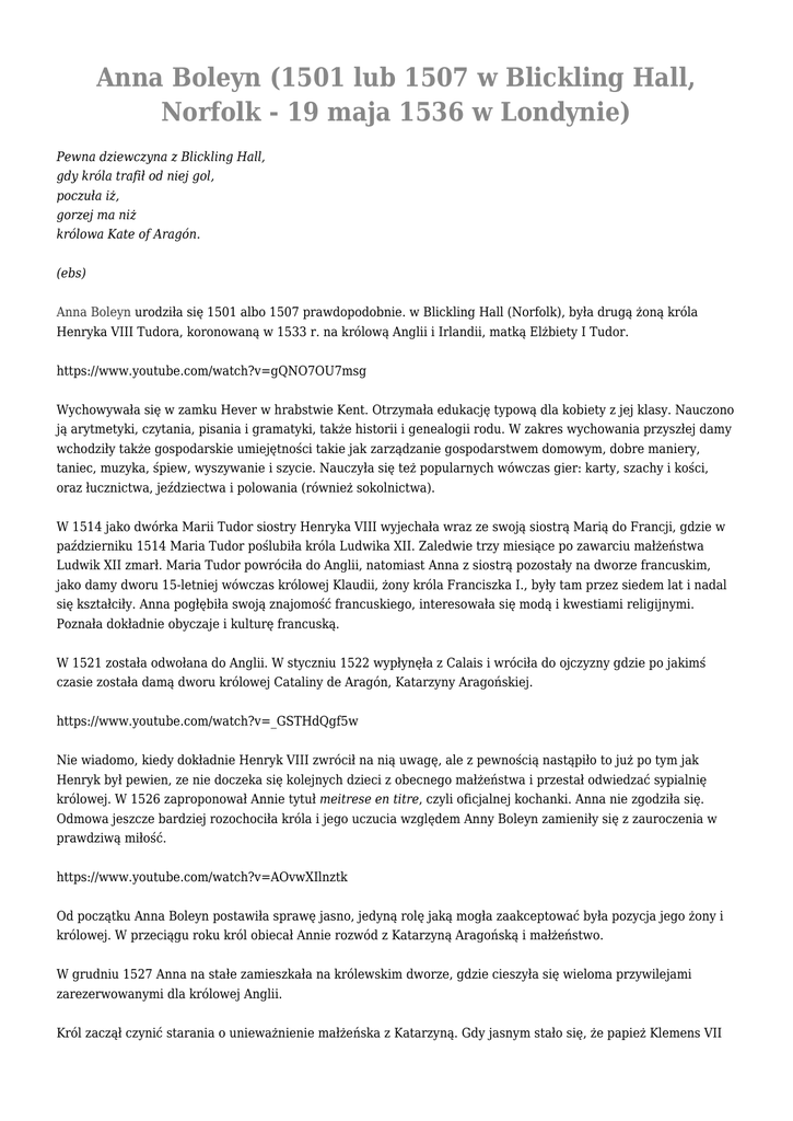 Anna Boleyn (1501 lub 1507 w Blickling Hall, Norfolk - 19 maja 1536 w Londynie) Pewna dziewczyna z Blickling Hall, gdy króla trafił od niej gol, poczuła iż, gorzej ma niż królowa Kate of Aragón. (ebs) Anna Boleyn urodziła się 1501 albo 1507 prawdopodobnie. w Blickling Hall (Norfolk), była drugą żoną króla Henryka VIII Tudora, koronowaną w 1533 r. na królową Anglii i Irlandii, matką Elżbiety I Tudor. https://www.youtube.com/watch?v=gQNO7OU7msg Wychowywała się w zamku Hever w hrabstwie Kent. Otrzymała edukację typową dla kobiety z jej klasy. Nauczono ją arytmetyki, czytania, pisania i gramatyki, także historii i genealogii rodu. W zakres wychowania przyszłej damy wchodziły także gospodarskie umiejętności takie jak zarządzanie gospodarstwem domowym, dobre maniery, taniec, muzyka, śpiew, wyszywanie i szycie. Nauczyła się też popularnych wówczas gier: karty, szachy i kości, oraz łucznictwa, jeździectwa i polowania (również sokolnictwa). W 1514 jako dwórka Marii Tudor siostry Henryka VIII wyjechała wraz ze swoją siostrą Marią do Francji, gdzie w październiku 1514 Maria Tudor poślubiła króla Ludwika XII. Zaledwie trzy miesiące po zawarciu małżeństwa Ludwik XII zmarł. Maria Tudor powróciła do Anglii, natomiast Anna z siostrą pozostały na dworze francuskim, jako damy dworu 15-letniej wówczas królowej Klaudii, żony króla Franciszka I., były tam przez siedem lat i nadal się kształciły. Anna pogłębiła swoją znajomość francuskiego, interesowała się modą i kwestiami religijnymi. Poznała dokładnie obyczaje i kulturę francuską. W 1521 została odwołana do Anglii. W styczniu 1522 wypłynęła z Calais i wróciła do ojczyzny gdzie po jakimś czasie została damą dworu królowej Cataliny de Aragón, Katarzyny Aragońskiej. https://www.youtube.com/watch?v=_GSTHdQgf5w Nie wiadomo, kiedy dokładnie Henryk VIII zwrócił na nią uwagę, ale z pewnością nastąpiło to już po tym jak Henryk był pewien, ze nie doczeka się kolejnych dzieci z obecnego małżeństwa i przestał odwiedzać sypialnię królowej. W 1526 zaproponował Annie tytuł meitrese en titre, czyli oficjalnej kochanki. Anna nie zgodziła się. Odmowa jeszcze bardziej rozochociła króla i jego uczucia względem Anny Boleyn zamieniły się z zauroczenia w prawdziwą miłość. https://www.youtube.com/watch?v=AOvwXIlnztk Od początku Anna Boleyn postawiła sprawę jasno, jedyną rolę jaką mogła zaakceptować była pozycja jego żony i królowej. W przeciągu roku król obiecał Annie rozwód z Katarzyną Aragońską i małżeństwo. W grudniu 1527 Anna na stałe zamieszkała na królewskim dworze, gdzie cieszyła się wieloma przywilejami zarezerwowanymi dla królowej Anglii. Król zaczął czynić starania o unieważnienie małżeńska z Katarzyną. Gdy jasnym stało się, że papież Klemens VII nie pozwoli na uznanie małżeństwa za nieważne, Henryk VIII zaczął szukać innego rozwiązania. Rozwiązanie podsunął mu Tomasz Cranmer twierdząc, że papież może rozstrzygać w sprawach prawa kanonicznego, ale problem ważności małżeństwa z Katarzyną ma charakter biblijny i powinien zostać rozwiązany naukowo przez biblistów uniwersyteckich, których trzeba poprosić o ekspertyzy. Henryk był pod wpływem lektur podsuniętych mu przez Annę, jak np. książka reformatora Williama Tyndale'a pt. "The Obedience of a Christian Man", w której autor twierdził, iż władza spoczywa w rękach króla jako Bożego pomazańca, a nie w rękach papieża, a król jako przedstawiciel Boga na ziemi ma prawo podejmować każdą decyzję. W 1531 Katarzyna Aragońska została wydalona z dworu, a jej komnaty i miejsce na dworze zajęła Anna Boleyn. Kiedy w 1532 zmarł Arcybiskup Canterbury William Warham, Henryk VIII z akceptacją papieża mianował na to stanowisko Tomasza Cranmera, który do tego czasu został kapłanem rodziny Boleynów. W tym samym roku Tomasz Cromwell przedstawił w Parlamencie dwie ważne ustawy "Supplication against the Ordinaries" oraz "Submission of the Clergy", które uznawały Henryka VIII za głowę Kościoła Anglii co było aktem ostatecznego zerwania z Rzymem. Wówczas Tomasz More zrezygnował z urzędu kanclerza, który został powierzony Cromwellowi. Henryk VIII nareszcie był wolny i mógł poślubić Annę Boleyn. 1 września 1532 Anna Boleyn została mianowana Markizą Pembroke, w ten sposób stała się najważniejszą kobietą na dworze. Ślub Henryka VIII Tudor z Anną Boleyn odbył się w tajemnicy 25 stycznia 1533 w Londynie, wkrótce po powrocie z Dover. Anna była już wtedy w ciąży. 23 maja 1533 Tomasz Cranmer uznał poprzednie małżeństwo króla Henryka VIII z Katarzyną Aragońską za nieważne i niebyłe, a pięć dni później 28 maja 1533 małżeństwo króla z Anną Boleyn za legalne i ważne. Wszyscy astrolodzy i medycy królewscy zapewniali iż urodzi się syn. 7 września 1533 r. na świat przyszła księżniczka Elżbieta. Henryk VIII nie krył rozczarowania, był bowiem przekonany, że urodzi się w końcu syn i następca tronu. W 1534 r. królowa Anna była ponownie w ciąży. Wiedziała, że dopóki nie urodzi syna, jej pozycja u boku króla jest zagrożona. Córka Katarzyny Maria chociaż pozbawiona tytułu i uznana za dziecko z nieprawego łoża stanowiła dla niej i Elżbiety zagrożenie. Henryk uspokajał Annę a Marię pozbawił części służby i wysłał do Hatfield House gdzie była wychowywana Elżbieta. 7 stycznia 1536 r. zmarła Katarzyna Aragońska. Wieść o jej śmierci dotarła na dwór angielski następnego dnia i została przyjęta z radością, Następnego dnia Henryk i Anna byli ubrani na żółto, kolor oznaczający radosne święto i uczcili ją uroczystościami (w Hiszpanii kolor żółty w połączeniu z czarnym oznacza żałobę, dlatego kolor ubrania królewskiej pary był różnie interpretowany). Anna w końcu poczuła się pełnoprawną królową Anglii, ale poroniła. Kiedy