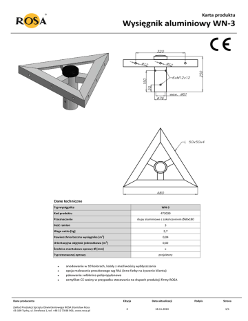 Karta produktu Wysięgnik aluminiowy WN-3 Dane techniczne Typ wysięgnika WN-3 Kod produktu 473030 Przeznaczenie słupy aluminiowe z zakooczeniem Ø60x180 Ilośd ramion 3 Waga netto [kg] 2,7 Powierzchnia boczna wysięgnika [m2] 0,04 Orientacyjna objętośd jednostkowa [m3] 0,02 Średnica montażowa oprawy Ø [mm] x Typ stosowanej oprawy projektory anodowanie w 10 kolorach, każdy z możliwością wybłyszczania opcja malowania proszkowego wg RAL (inne farby na życzenie klienta) pakowanie: włóknina polipropylenowa certyfikat CE ważny w przypadku stosowania na słupach produkcji firmy ROSA Dane producenta Zakład Produkcji Sprzętu Oświetleniowego ROSA Stanisław Rosa 43-109 Tychy, ul. Strefowa 1, tel. +48 32 73 88 901, www.rosa.pl Edycja Data aktualizacji 4 18.11.2014 Podpis Strona 1/1