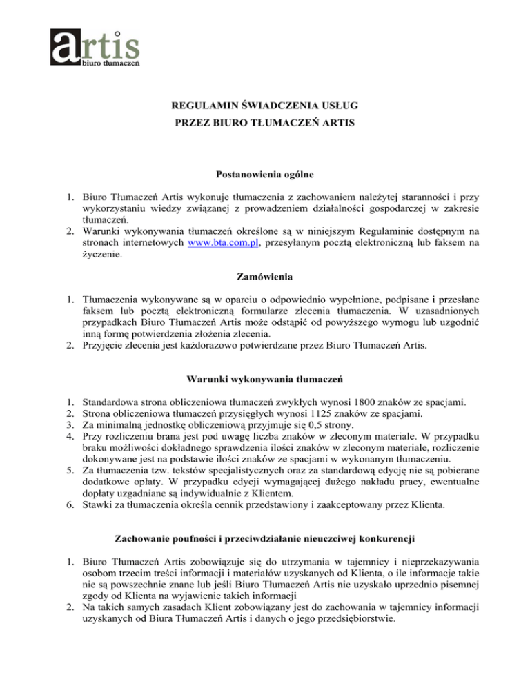 REGULAMIN ŚWIADCZENIA USŁUG PRZEZ BIURO TŁUMACZEŃ ARTIS Postanowienia ogólne 1. Biuro Tłumaczeń Artis wykonuje tłumaczenia z zachowaniem należytej staranności i przy wykorzystaniu wiedzy związanej z prowadzeniem działalności gospodarczej w zakresie tłumaczeń. 2. Warunki wykonywania tłumaczeń określone są w niniejszym Regulaminie dostępnym na stronach internetowych www.bta.com.pl, przesyłanym pocztą elektroniczną lub faksem na życzenie. Zamówienia 1. Tłumaczenia wykonywane są w oparciu o odpowiednio wypełnione, podpisane i przesłane faksem lub pocztą elektroniczną formularze zlecenia tłumaczenia. W uzasadnionych przypadkach Biuro Tłumaczeń Artis może odstąpić od powyższego wymogu lub uzgodnić inną formę potwierdzenia złożenia zlecenia. 2. Przyjęcie zlecenia jest każdorazowo potwierdzane przez Biuro Tłumaczeń Artis. Warunki wykonywania tłumaczeń 1. 2. 3. 4. Standardowa strona obliczeniowa tłumaczeń zwykłych wynosi 1800 znaków ze spacjami. Strona obliczeniowa tłumaczeń przysięgłych wynosi 1125 znaków ze spacjami. Za minimalną jednostkę obliczeniową przyjmuje się 0,5 strony. Przy rozliczeniu brana jest pod uwagę liczba znaków w zleconym materiale. W przypadku braku możliwości dokładnego sprawdzenia ilości znaków w zleconym materiale, rozliczenie dokonywane jest na podstawie ilości znaków ze spacjami w wykonanym tłumaczeniu. 5. Za tłumaczenia tzw. tekstów specjalistycznych oraz za standardową edycję nie są pobierane dodatkowe opłaty. W przypadku edycji wymagającej dużego nakładu pracy, ewentualne dopłaty uzgadniane są indywidualnie z Klientem. 6. Stawki za tłumaczenia określa cennik przedstawiony i zaakceptowany przez Klienta. Zachowanie poufności i przeciwdziałanie nieuczciwej konkurencji 1. Biuro Tłumaczeń Artis zobowiązuje się do utrzymania w tajemnicy i nieprzekazywania osobom trzecim treści informacji i materiałów uzyskanych od Klienta, o ile informacje takie nie są powszechnie znane lub jeśli Biuro Tłumaczeń Artis nie uzyskało uprzednio pisemnej zgody od Klienta na wyjawienie takich informacji 2. Na takich samych zasadach Klient zobowiązany jest do zachowania w tajemnicy informacji uzyskanych od Biura Tłumaczeń Artis i danych o jego przedsiębiorstwie. 3. Klient zobowiązany jest do niepodejmowania żadnych kroków zmierzających do zatrudnienia tłumaczy współpracujących z Biurem Tłumaczeń Artis i wyznaczonych do obsługi jego zleceń, przez okres 12 miesięcy od zakończenia realizacji ostatniego zlecenia bez wiedzy i pisemnej zgody uzyskanej od Biura Tłumaczeń Artis. Wynagrodzenie 1. Ceny podane w cenniku usług świadczonych przez Biuro Tłumaczeń Artis są cenami netto i podlegają podatkowi VAT w wysokości 22%. 2. Płatności dokonywane są na rachunek bankowy wskazany na fakturze wystawionej po zakończeniu realizacji tłumaczenia, w terminie 14 dni od daty wystawienia faktury. 3. W przypadku wstrzymania realizacji zlecenia, Klient zobowiązany jest do uiszczenia zapłaty na rzecz Biura Tłumaczeń Artis w wysokości odpowiadającej faktycznie wykonanej pracy oraz do zwrotu wszelkich innych kosztów związanych z ewentualnymi przygotowaniami poczynionymi przez Biuro Tłumaczeń Artis w celu należytej realizacji zlecenia. Reklamacje 1. Wszelkie reklamacje związane z nienależytym wykonaniem zlecenia winny być zgłoszone w ciągu 7 dni od daty zakończenia i otrzymania tłumaczenia. 2. Reklamacje dotyczące ewentualnych błędów w tłumaczeniach rozpatrywane są na koszt Biura Tłumaczeń Artis. W przypadku złożenia reklamacji i braku zainteresowania Klienta wykonaniem korekty przez Biuro Tłumaczeń Artis, Klientowi przysługuje rabat określany indywidualnie. 3. Wysokość odszkodowania za potencjalne szkody poniesione przez Klienta, związane z realizacją zlecenia przez Biuro Tłumaczeń Artis, ograniczona jest do wysokości wynagrodzenia netto należnego za wykonanie danego zlecenia. 4. Biuro Tłumaczeń Artis nie ponosi odpowiedzialności odszkodowawczej za potencjalne błędy w tłumaczeniach wykonywanych w trybie pilnym i/lub bardzo pilnym. Zgłoszone błędy w tych tłumaczeniach usuwane są bezpłatnie. Postanowienia końcowe 1. Biuro Tłumaczeń Artis i Klient będą starali się rozwiązać wszelkie spory wynikłe z realizacji zleceń w sposób polubowny. 2. W sprawach nieuregulowanych w niniejszym Regulaminie zastosowanie mają powszechnie obowiązujące przepisy prawa, w szczególności kodeksu cywilnego.