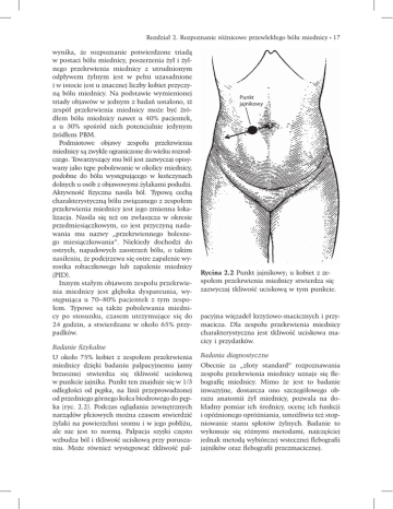 Rozdział 2. Rozpoznanie różnicowe przewlekłego bólu miednicy · 17 wynika, że rozpoznanie potwierdzone triadą w postaci bólu miednicy, poszerzenia żył i żylnego przekrwienia miednicy z utrudnionym odpływem żylnym jest w pełni uzasadnione i w istocie jest u znacznej liczby kobiet przyczyną bólu miednicy. Na podstawie wymienionej triady objawów w jednym z badań ustalono, iż zespół przekrwienia miednicy może być źródłem bólu miednicy nawet u 40% pacjentek, a u 30% spośród nich potencjalnie jedynym źródłem PBM. Podmiotowe objawy zespołu przekrwienia miednicy są zwykle ograniczone do wieku rozrodczego. Towarzyszący mu ból jest zazwyczaj opisywany jako tępe pobolewanie w okolicy miednicy, podobne do bólu występującego w kończynach dolnych u osób z objawowymi żylakami podudzi. Aktywność fizyczna nasila ból. Typową cechą charakterystyczną bólu związanego z zespołem przekrwienia miednicy jest jego zmienna lokalizacja. Nasila się też on zwłaszcza w okresie przedmiesiączkowym, co jest przyczyną nadawania mu nazwy „przekrwiennego bolesnego miesiączkowania”. Niekiedy dochodzi do ostrych, napadowych zaostrzeń bólu, o takim nasileniu, że podejrzewa się ostre zapalenie wyrostka robaczkowego lub zapalenie miednicy (PID). Innym stałym objawem zespołu przekrwienia miednicy jest głęboka dyspareunia, występująca u 70–80% pacjentek z tym zespołem. Typowe są także pobolewania miednicy po stosunku, czasem utrzymujące się do 24 godzin, a stwierdzane w około 65% przypadków. Badanie fizykalne U około 75% kobiet z zespołem przekrwienia miednicy dzięki badaniu palpacyjnemu jamy brzusznej stwierdza się tkliwość uciskową w punkcie jajnika. Punkt ten znajduje się w 1/3 odległości od pępka, na linii przeprowadzonej od przedniego górnego kolca biodrowego do pępka (ryc. 2.2). Podczas oglądania zewnętrznych narządów płciowych można czasem stwierdzić żylaki na powierzchni sromu i w jego pobliżu, ale nie jest to normą. Palpacja szyjki często wzbudza ból i tkliwość uciskową przy poruszaniu. Może również występować tkliwość pal- Punkt jajnikowy Rycina 2.2 Punkt jajnikowy; u kobiet z zespołem przekrwienia miednicy stwierdza się zazwyczaj tkliwość uciskową w tym punkcie. pacyjna więzadeł krzyżowo-macicznych i przymacicza. Dla zespołu przekrwienia miednicy charakterystyczna jest tkliwość uciskowa macicy i przydatków. Badania diagnostyczne Obecnie za „złoty standard” rozpoznawania zespołu przekrwienia miednicy uznaje się flebografię miednicy. Mimo że jest to badanie inwazyjne, dostarcza ono szczegółowego obrazu anatomii żył miednicy, pozwala na dokładny pomiar ich średnicy, ocenę ich funkcji i opóźnionego opróżniania, umożliwia też stopniowanie stanu splotów żylnych. Badanie to wykonuje się różnymi metodami, najczęściej jednak metodą wybiórczej wstecznej flebografii jajników oraz flebografii przezmacicznej.