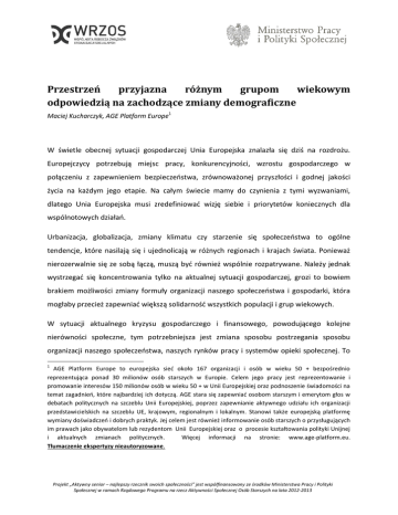 Przestrzeń przyjazna różnym grupom wiekowym odpowiedzią na zachodzące zmiany demograficzne Maciej Kucharczyk, AGE Platform Europe1 W świetle obecnej sytuacji gospodarczej Unia Europejska znalazła się dziś na rozdrożu. Europejczycy potrzebują miejsc pracy, konkurencyjności, wzrostu gospodarczego w połączeniu z zapewnieniem bezpieczeństwa, zrównoważonej przyszłości i godnej jakości życia na każdym jego etapie. Na całym świecie mamy do czynienia z tymi wyzwaniami, dlatego Unia Europejska musi zredefiniować wizję siebie i priorytetów koniecznych dla wspólnotowych działań. Urbanizacja, globalizacja, zmiany klimatu czy starzenie się społeczeństwa to ogólne tendencje, które nasilają się i ujednolicają w różnych regionach i krajach świata. Ponieważ nierozerwalnie się ze sobą łączą, muszą być również wspólnie rozpatrywane. Należy jednak wystrzegać się koncentrowania tylko na aktualnej sytuacji gospodarczej, grozi to bowiem brakiem możliwości zmiany formuły organizacji naszego społeczeństwa i gospodarki, która mogłaby przecież zapewniać większą solidarność wszystkich populacji i grup wiekowych. W sytuacji aktualnego kryzysu gospodarczego i finansowego, powodującego kolejne nierówności społeczne, tym potrzebniejsza jest zmiana sposobu postrzegania sposobu organizacji naszego społeczeństwa, naszych rynków pracy i systemów opieki społecznej. To 1 AGE Platform Europe to europejska sieć około 167 organizacji i osób w wieku 50 + bezpośrednio reprezentująca ponad 30 milionów osób starszych w Europie. Celem jego pracy jest reprezentowanie i promowanie interesów 150 milionów osób w wieku 50 + w Unii Europejskiej oraz podnoszenie świadomości na temat zagadnień, które najbardziej ich dotyczą. AGE stara się zapewniać osobom starszym i emerytom głos w debatach politycznych na szczeblu Unii Europejskiej, poprzez zapewnianie aktywnego udziału ich organizacji przedstawicielskich na szczeblu UE, krajowym, regionalnym i lokalnym. Stanowi także europejską platformę wymiany doświadczeń i dobrych praktyk. Jej celem jest również informowanie osób starszych o przysługujących im prawach jako obywatelom lub rezydentom Unii Europejskiej oraz o procesie kształtowania polityki Unijnej i aktualnych zmianach politycznych. Więcej informacji na stronie: www.age-platform.eu. Tłumaczenie ekspertyzy nieautoryzowane. Projekt „Aktywny senior – najlepszy rzecznik swoich społeczności” jest współfinansowany ze środków Ministerstwa Pracy i Polityki Społecznej w ramach Rządowego Programu na rzecz Aktywności Społecznej Osób Starszych na lata 2012-2013 Strona |2 konieczne dla zapewnienia warunków solidarnej oraz sprawiedliwej współpracy wewnątrz i między pokoleniowej, jak również ekonomicznej i społecznej stabilności wszystkich pokoleń. Europejski Rok Aktywności Osób Starszych i Solidarności Międzypokoleniowej 2012 dał możliwość wzmocnienia świadomości społecznej dotyczącej potrzeb osób starszych, jak również stał się okazją do dyskusji na temat sposobów, w jakie można na nie bardziej efektywnie odpowiadać. Zachęcając i mobilizując osoby starsze do życia w dobrym zdrowiu fizycznym i psychicznym, a także do bardziej aktywnego uczestniczenia nie tylko na rynkach pracy, ale również w życiu swoich społeczności, pomożemy naszemu społeczeństwu lepiej radzić sobie ze zmianami demograficznymi. Poprawa jakości i dostępności otaczającej nas przestrzeni, to główne wyzwania w procesie tworzenia społeczeństwa dla wszystkich grup wiekowych. Musimy zapewnić by nasze krótko, średnio- i długoterminowe strategie polityczne obok dostrzegania kwestii starzenia się społeczeństwa, były dostosowane do jego wyzwań. Jeżeli jednak w dalszym ciągu dostosowaniem otoczenia i ochrony zdrowia naszych seniorów, zapewnianiem im dobrobytu i uczestnictwa w życiu publicznym będziemy obciążać tylko pokolenia aktywne zawodowo, zgubimy właściwą drogę. Osoby starsze dysponują ogromnym zasobem ekonomicznych i społecznych możliwości, których obszar ciągle się powiększa – a może przecież wzrastać w jakości. Najpierw jednak, musimy zapewnić miejsce dla inteligentnego, zrównoważonego i integrującego rozwoju, zapewniającego wszystkim warunki do angażowania się i wnoszenia wkładu. Najlepiej, można to osiągnąć poprzez kompleksowe i innowacyjne podejście do sposobu organizacji i zarządzania naszym społeczeństwem, tworząc otoczenie przyjazne wszystkim grupom wiekowym. Innymi słowy, wiek chronologiczny nie powinien być wyznacznikiem zdolności ludzi do udziału w życiu społecznym. Przecież na każdym etapie życia wszyscy się starzejemy, więc wszyscy powinniśmy mieć takie same możliwości by uczestniczyć w życiu społecznym naszych regionów, miast, społeczności lokalnych, sąsiedztw i rodzin jako równi obywatele. Jak otoczenie przyjazne wszystkim grupom wiekowym może pomóc Europie sprostać wyzwaniom demografii Projekt „Aktywny senior – najlepszy rzecznik swoich społeczności” jest współfinansowany ze środków Ministerstwa Pracy i Polityki Społecznej w ramach Rządowego Programu na rzecz Aktywności Społecznej Osób Starszych na lata 2012-2013 Strona |3 Według Światowej Organizacji Zdrowia (WHO), kluczowymi wyznacznikami tego, czy ludzie pozostają zdrowi, niezależni i autonomiczni w trakcie starzenia się jest ich fizyczne i społeczne otoczenie. Promowanie Otoczenia Przyjaznego Starzeniu się (AFE) jest jedną z najbardziej skutecznych metod reagowania na zmiany demograficzne, a także wzrostu liczby lat spędzonych w dobrym zdrowiu (na przykład wedle wskaźnika "lat zdrowego życia" HLY, zaproponowanego przez Unię Europejską, który mierzy długość życia w sprawności). AFE wspiera osoby starsze w procesie wchodzenia w wiek w lepszym zdrowiu fizycznym i psychicznym, poprzez promowanie ich integracji społecznej oraz aktywn