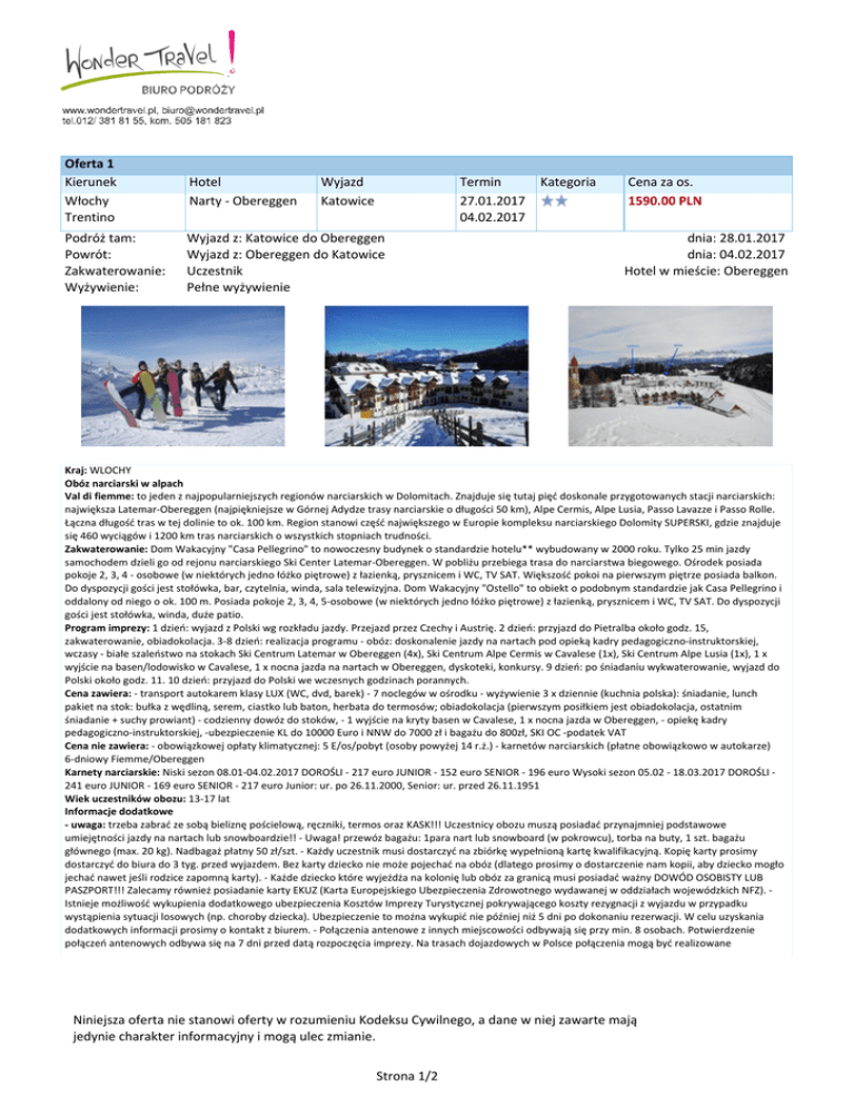 Oferta 1 Kierunek Włochy Trentino Hotel Narty - Obereggen Podróż tam: Powrót: Zakwaterowanie: Wyżywienie: Wyjazd z: Katowice do Obereggen Wyjazd z: Obereggen do Katowice Uczestnik Pełne wyżywienie Wyjazd Katowice Termin 27.01.2017 04.02.2017 Kategoria Cena za os. 1590.00 PLN dnia: 28.01.2017 dnia: 04.02.2017 Hotel w mieście: Obereggen Kraj: WLOCHY Obóz narciarski w alpach Val di fiemme: to jeden z najpopularniejszych regionów narciarskich w Dolomitach. Znajduje się tutaj pięć doskonale przygotowanych stacji narciarskich: największa Latemar-Obereggen (najpiękniejsze w Górnej Adydze trasy narciarskie o długości 50 km), Alpe Cermis, Alpe Lusia, Passo Lavazze i Passo Rolle. Łączna długość tras w tej dolinie to ok. 100 km. Region stanowi część największego w Europie kompleksu narciarskiego Dolomity SUPERSKI, gdzie znajduje się 460 wyciągów i 1200 km tras narciarskich o wszystkich stopniach trudności. Zakwaterowanie: Dom Wakacyjny "Casa Pellegrino" to nowoczesny budynek o standardzie hotelu** wybudowany w 2000 roku. Tylko 25 min jazdy samochodem dzieli go od rejonu narciarskiego Ski Center Latemar-Obereggen. W pobliżu przebiega trasa do narciarstwa biegowego. Ośrodek posiada pokoje 2, 3, 4 - osobowe (w niektórych jedno łóżko piętrowe) z łazienką, prysznicem i WC, TV SAT. Większość pokoi na pierwszym piętrze posiada balkon. Do dyspozycji gości jest stołówka, bar, czytelnia, winda, sala telewizyjna. Dom Wakacyjny "Ostello" to obiekt o podobnym standardzie jak Casa Pellegrino i oddalony od niego o ok. 100 m. Posiada pokoje 2, 3, 4, 5-osobowe (w niektórych jedno łóżko piętrowe) z łazienką, prysznicem i WC, TV SAT. Do dyspozycji gości jest stołówka, winda, duże patio. Program imprezy: 1 dzień: wyjazd z Polski wg rozkładu jazdy. Przejazd przez Czechy i Austrię. 2 dzień: przyjazd do Pietralba około godz. 15, zakwaterowanie, obiadokolacja. 3-8 dzień: realizacja programu - obóz: doskonalenie jazdy na nartach pod opieką kadry pedagogiczno-instruktorskiej, wczasy - białe szaleństwo na stokach Ski Centrum Latemar w Obereggen (4x), Ski Centrum Alpe Cermis w Cavalese (1x), Ski Centrum Alpe Lusia (1x), 1 x wyjście na basen/lodowisko w Cavalese, 1 x nocna jazda na nartach w Obereggen, dyskoteki, konkursy. 9 dzień: po śniadaniu wykwaterowanie, wyjazd do Polski około godz. 11. 10 dzień: przyjazd do Polski we wczesnych godzinach porannych. Cena zawiera: - transport autokarem klasy LUX (WC, dvd, barek) - 7 noclegów w ośrodku - wyżywienie 3 x dziennie (kuchnia polska): śniadanie, lunch pakiet na stok: bułka z wędliną, serem, ciastko lub baton, herbata do termosów; obiadokolacja (pierwszym posiłkiem jest obiadokolacja, ostatnim śniadanie + suchy prowiant) - codzienny dowóz do stoków, - 1 wyjście na kryty basen w Cavalese, 1 x nocna jazda w Obereggen, - opiekę kadry pedagogiczno-instruktorskiej, -ubezpieczenie KL do 10000 Euro i NNW do 7000 zł i bagażu do 800zł, SKI OC -podatek VAT Cena nie zawiera: - obowiązkowej opłaty klimatycznej: 5 E/os/pobyt (osoby powyżej 14 r.ż.) - karnetów narciarskich (płatne obowiązkowo w autokarze) 6-dniowy Fiemme/Obereggen Karnety narciarskie: Niski sezon 08.01-04.02.2017 DOROŚLI - 217 euro JUNIOR - 152 euro SENIOR - 196 euro Wysoki sezon 05.02 - 18.03.2017 DOROŚLI 241 euro JUNIOR - 169 euro SENIOR - 217 euro Junior: ur. po 26.11.2000, Senior: ur. przed 26.11.1951 Wiek uczestników obozu: 13-17 lat Informacje dodatkowe - uwaga: trzeba zabrać ze sobą bieliznę pościelową, ręczniki, termos oraz KASK!!! Uczestnicy obozu muszą posiadać przynajmniej podstawowe umiejętności jazdy na nartach lub snowboardzie!! - Uwaga! przewóz bagażu: 1para nart lub snowboard (w pokrowcu), torba na buty, 1 szt. bagażu głównego (max. 20 kg). Nadbagaż płatny 50 zł/szt. - Każdy uczestnik musi dostarczyć na zbiórkę wypełnioną kartę kwalifikacyjną. Kopię karty prosimy dostarczyć do biura do 3 tyg. przed wyjazdem. Bez karty dziecko nie może pojechać na obóz (dlatego prosimy o dostarczenie nam kopii, aby dziecko mogło jechać nawet jeśli rodzice zapomną karty). - Każde dziecko które wyjeżdża na kolonię lub obóz za granicą musi posiadać ważny DOWÓD OSOBISTY LUB PASZPORT!!! Zalecamy również posiadanie karty EKUZ (Karta Europejskiego Ubezpieczenia Zdrowotnego wydawanej w oddziałach wojewódzkich NFZ). Istnieje możliwość wykupienia dodatkowego ubezpieczenia Kosztów Imprezy Turystycznej pokrywającego koszty rezygnacji z wyjazdu w przypadku wystąpienia sytuacji losowych (np. choroby dziecka). Ubezpieczenie to można wykupić nie później niż 5 dni po dokonaniu rezerwacji. W celu uzyskania dodatkowych informacji prosimy o kontakt z biurem. - Połączenia antenowe z innych miejscowości odbywają się przy min. 8 osobach. Potwierdzenie połączeń antenowych odbywa się na 7 dni przed datą rozpoczęcia imprezy. Na trasach dojazdowych w Polsce połączenia mogą być realizowane Niniejsza oferta nie stanowi oferty w rozumieniu Kodeksu Cywilnego, a dane w niej zawarte mają jedynie charakter informacyjny i mogą ulec zmianie. Strona 1/2 mikrobusami lub transportem publicznym pod opieką osoby dorosłej i po wcześniejszej rezerwacji miejsc przez Organizatora imprezy. - Faktury za pobyt wystawiamy nie wcześniej niż 30 dni przed wyjazdem na prośbę klienta, w celu otrzymania faktury prosimy o wypełnienie formularza na stronie: http://www.indexpolska.com.pl/faktury Transport autokarem klasy lux (wc, dvd, barek), 7 noclegów w ośrodku, wyżywienie 3 x dziennie (kuchnia polska): śniadanie, lunch pakiet na stok: bułka z wędliną, serem, ciastko lub baton, herbata do termosów; obiadokolacja (pierwszym posiłkiem jest obiadokolacja, ostatnim śniadanie + suchy prowiant), codzienny dowóz do stoków, 1 wyjście na kryty basen w Cavalese, 1 x nocna jazda w Obereggen, opiekę kadry pedagogiczno-instruktorskiej, ubezpieczenie KL do 10000 Euro i NNW do 7000 zł i bagażu do 800z