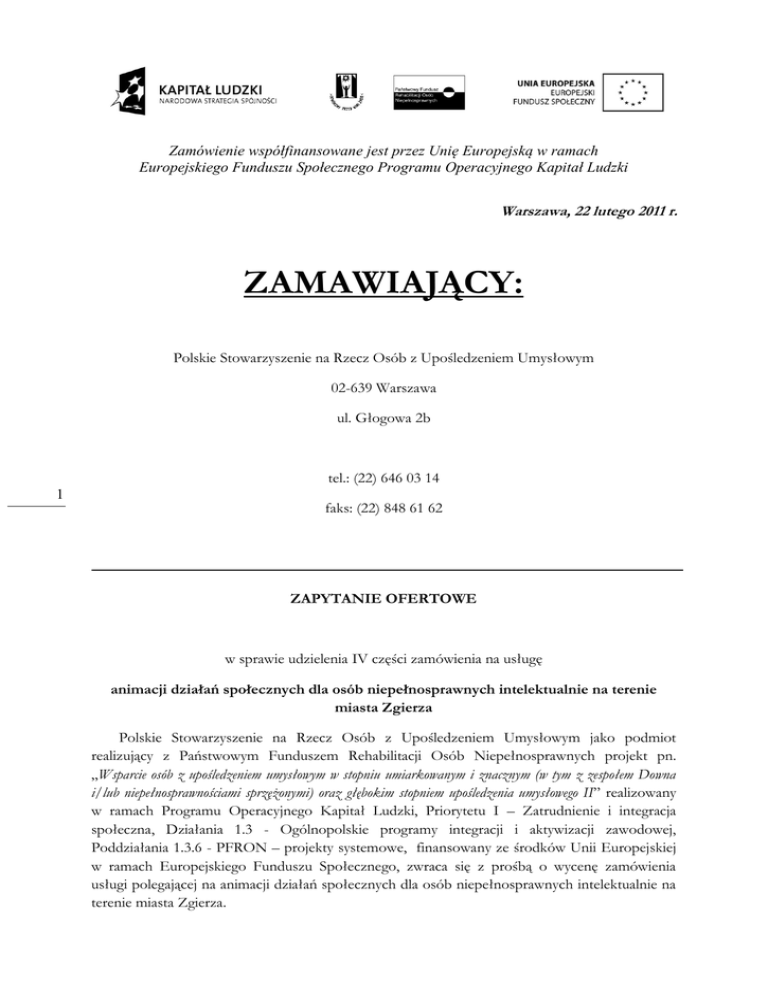 Zamówienie współfinansowane jest przez Unię Europejską w ramach Europejskiego Funduszu Społecznego Programu Operacyjnego Kapitał Ludzki Warszawa, 22 lutego 2011 r. ZAMAWIAJĄCY: Polskie Stowarzyszenie na Rzecz Osób z Upośledzeniem Umysłowym 02-639 Warszawa ul. Głogowa 2b 1 tel.: (22) 646 03 14 faks: (22) 848 61 62 ZAPYTANIE OFERTOWE w sprawie udzielenia IV części zamówienia na usługę animacji działań społecznych dla osób niepełnosprawnych intelektualnie na terenie miasta Zgierza Polskie Stowarzyszenie na Rzecz Osób z Upośledzeniem Umysłowym jako podmiot realizujący z Państwowym Funduszem Rehabilitacji Osób Niepełnosprawnych projekt pn. „Wsparcie osób z upośledzeniem umysłowym w stopniu umiarkowanym i znacznym (w tym z zespołem Downa i/lub niepełnosprawnościami sprzężonymi) oraz głębokim stopniem upośledzenia umysłowego II” realizowany w ramach Programu Operacyjnego Kapitał Ludzki, Priorytetu I – Zatrudnienie i integracja społeczna, Działania 1.3 - Ogólnopolskie programy integracji i aktywizacji zawodowej, Poddziałania 1.3.6 - PFRON – projekty systemowe, finansowany ze środków Unii Europejskiej w ramach Europejskiego Funduszu Społecznego, zwraca się z prośbą o wycenę zamówienia usługi polegającej na animacji działań społecznych dla osób niepełnosprawnych intelektualnie na terenie miasta Zgierza. Zamówienie współfinansowane jest przez Unię Europejską w ramach Europejskiego Funduszu Społecznego Programu Operacyjnego Kapitał Ludzki I. Wymagania dotyczące Wykonawcy: Wykształcenie minimum średnie oraz minimum roczny staż pracy z dorosłymi osobami z niepełnosprawnością intelektualną. Ponadto musi legitymować się potwierdzonym doświadczeniem prowadzenia zajęć/działań społecznych dla dorosłych osób z niepełnosprawnością intelektualną. II. Opis przedmiotu zamówienia Przedmiotem zamówienia jest usługa animacji działań społecznych dla osób niepełnosprawnych intelektualnie. Do zakresu zadań Wykonawcy należeć będzie: 2 1. 2. 3. 4. 5. pozyskanie i zorganizowanie współpracy z wolontariuszem, stała współpraca z trenerami pracy, powołanie grupy samopomocowej, rozpoznanie sytuacji członków grupy, zbadanie ich potrzeb społecznych, przygotowanie wspólnie z osobami niepełnosprawnymi intelektualnie miesięcznych planów działań społecznych dla grup samopomocowych zgodnie z potrzebami i preferencjami osób niepełnosprawnych intelektualnie, wytycznymi specjalisty ds. rozwoju społecznego osób z niepełnosprawnością intelektualną oraz lokalnymi warunkami, 6. prowadzenie regularnych spotkań grupy oraz udział we wszystkich zaplanowanych działaniach (średnio 4 spotkania w każdym miesiącu, trwające średnio 2,5 godz.), 7. prowadzenie i przesyłanie do biura projektu dokumentacji potwierdzającej realizowane działania (dziennik). 8. Na wykonanie usługi zostanie zawarta umowa cywilnoprawna. Wykonawca zobowiązany będzie, przez okres obowiązywania umowy, do wykonywania działań objętych jej zakresem w wymiarze 10 godzin miesięcznie dla każdej grupy. W przypadku większej liczby grup nastąpi odpowiednie zwiększenie liczby godzin usługi. Miejsce i sposób realizacji zadań będzie ustalane z Wykonawcą przez Zamawiającego bezpośrednio przed rozpoczęciem wykonywania zlecenia. Wszelkie przekazane przez Wykonawcę informacje i dokumenty Wykonawca ma obowiązek traktować jako poufne w trakcie realizacji zlecenia oraz po jego zrealizowaniu. Wykonawca zobowiązuje się do podpisania oświadczenia o poufności na formularzu otrzymanym od Wykonawcę. III. Klasyfikacja Wspólnego Słownika Zamówień (CPV): 85311200-4 Usługi opieki społecznej dla osób niepełnosprawnych Zamówienie współfinansowane jest przez Unię Europejską w ramach Europejskiego Funduszu Społecznego Programu Operacyjnego Kapitał Ludzki IV. Termin wykonania usługi: Termin wykonania usługi: od dnia 14 marca 2011 r. do dnia 31 października 2012 r. V. Kryterium oceny ofert: W celu wyboru najkorzystniejszej oferty Zamawiający dokona oceny i wyboru ofert spośród Wykonawców spełniających kryteria określone w punkcie I. w oparciu o poniższe kryteria: Cena – 80 %, Wykształcenie – 10 % Doświadczenie w pracy z dorosłymi osobami z niepełnosprawnością intelektualną – 10 % 3 Punkty za kryterium cena zostaną obliczone na podstawie wzoru: Cena brutto oferty najtańszej x 80 = ilość punktów Cena brutto oferty badanej Punkty za kryterium wykształcenie zostaną przyznane następująco: Wykształcenie średnie – 5 punktów, Wykształcenie wyższe – 10 punktów. Punkty za kryterium doświadczenie w pracy z dorosłymi osobami z niepełnosprawnością intelektualną zostaną obliczone na podstawie wzoru: Doświadczenie w latach oferty badanej Najdłuższe doświadczenie w latach spośród złożonych ofert x 10 = ilość punktów Zamówienie współfinansowane jest przez Unię Europejską w ramach Europejskiego Funduszu Społecznego Programu Operacyjnego Kapitał Ludzki Punkty za poszczególne kryteria przyznane dla danej oferty zostaną zsumowane, zaokrąglone do dwóch miejsc po przecinku i będą stanowić końcową ocenę oferty. Za najkorzystniejszą zostanie uznana oferta, która łącznie uzyska najwyższą liczbę punktów. VI. Termin i sposób złożenia ofert. Ofertę należy złożyć w formie elektronicznej, na formularzu dołączonym do niniejszego zapytania, w terminie 14 dni od daty ogłoszenia zapytania ofertowego tj. do dnia 8 marca 2011 r.., na adres: [email protected]. VII. 4 Uwagi końcowe. Niniejsze ogłoszenie nie jest ogłoszeniem w rozumieniu ustawy prawo zamówień publicznych, a propozycje składane przez zainteresowane podmioty nie są ofertami w rozumieniu kodeksu cywilnego. Niniejsze zapytanie ofertowe nie stanowi zobowiązania Polskiego Stowarzyszenia na Rzecz Osób z Upośledzeniem Umysłowym, do zawarcia umowy. PSOUU może odstąpić od podpisania umowy bez podani