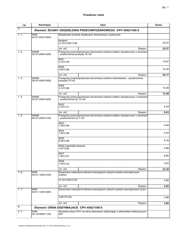 Str. 1 Przedmiar robót Lp 1. 1. 1. Normatyw Opis Suma Element: ŚCIANY ODDZIELENIA PRZECIWPOśAROWEGO CPV 45421100-5 KNR 04-01-0427-0500 Rozebranie ścianek działowych drewnianych oszklonych kredens (3.10+2.60)*3.96 1. 2. 1. 3. KNNR 00-07-0505-0300 KNNR 00-07-0505-0500 22.57 Jm. m2 Razem: Przegrody przeciwpoŜarowe aluminiowe szklone szkłem bezpiecznym z drzwiami - powierzchnia powyŜej 10 m2 SW1 3.16*4.39 13.87 SW9 2.60*3.96 10.30 Jm. m2 Razem: Przegrody przeciwpoŜarowe aluminiowe szklone nieotwierane - powierzchnia powyŜej 10 m2 SW9 3.10*3.96 1. 4. KNNR 00-07-0505-0200 1. 6. 1. 7. KNNR 00-07-0505-0100 KNR 04-01-1204-0100 KNR 04-01-1204-0200 Jm. m2 Razem: Przegrody przeciwpoŜarowe aluminiowe szklone szkłem bezpiecznym z drzwiami - powierzchnia do 10 m2 2. 1. 9.23 SW3 1.58*2.90 4.58 SW4 1.50*2.89 4.34 SW5 2.96*2.96 8.76 SW6 (naświetle łukowe) 1.87*2.60 4.86 SW7 1.85*3.57 6.60 SW8 1.40*2.32 3.25 Jm. m2 Razem: Dwukrotne malowanie farbami emulsyjnymi starych tynków wewnętrznych sufitów 32.39 (3.10+2.60)*0.50 2.85 Jm. m2 Razem: Dwukrotne malowanie farbami emulsyjnymi starych tynków wewnętrznych ścian 2.85 3.96*2*0.50 3.96 Razem: Element: OKNA ODDYMIAJACE CPV 45421100-5 KNR 00-19-0929-1100 12.28 9.23 Jm. m2 Razem: Przegrody przeciwpoŜarowe aluminiowe szklone szkłem bezpiecznym z drzwiami - powierzchnia do 7 m2 Jm. m2 2. 24.17 12.28 SW2 2.79*3.31 1. 5. 22.57 Wymiana okien PCV na okna drewniane oddymiając z siłownikiem elektrycznym 24V System kosztorysowania Strix wer. 4.15 (c) Athenasoft Sp. z o.o. 3.96 Str. 2 Przedmiar robót Lp 2. 2. Normatyw KNR 04-01-1204-0200 Opis okno oddymijace rys. 6 1.53*2.24 3.43 okno oddymijace rys. 7 1.54*2.34 3.60 Jm. m2 Razem: Dwukrotne malowanie farbami emulsyjnymi starych tynków wewnętrznych ścian 7.03 (2.10*2+1.30)*0.50*2 5.50 Jm. m2 3. 3. 1. Suma Razem: Element: OBUDOWA STROPU DREWNIANEGO CPV 4541000-4 KNR 04-01-1202-0900 Zerwanie okładziny stropu z płytek PCV (imitacji kasetonów) pom. socjalne na poddaszu 5.92*3.97+3.23*1.94 3. 2. KNR 02-02-2006-0400 29.77 Jm. m2 Razem: Okładziny z płyt gipsowo-kartonowych DF 12,5 mm pojedyńcze na stropach obmiar jw. 29.77 3. 3. KNR 02-02-2006-0800 KNR 02-02-1505-0501 Jm. m2 Razem: Okładziny z płyt gipsowo-kartonowych DF 12,5 mm - dodatek za drugą warstwę 4. 1. 4. 2. 4. 3. 4. 4. 29.77 29.77 Jm. m2 Razem: Dwukrotne malowanie farbami emulsyjnymi powierzchni wewnętrznych - płyt gipsowych spoinowanych uprzednio szpachlowanych z gruntowaniem 29.77 29.77 29.77 Jm. m2 4. 29.77 29.77 obmiar jw. 29.77 3. 4. 5.50 Razem: 29.77 Element: DRZWI PRZECIWPOśAROWE CPV 45421000-4 KNR 04-01-0354-0700 KNR 04-01-0354-0400 KNR 04-01-0347-0900 KNR 02-02-1204-0300 Wykucie z muru drzwi stalowych o powierzchni do 2 m2 strych 0.84*1.91 1.60 0.90*2.00 +0.70*2.13 3.29 Jm. szt. Wykucie z muru drzwi drewnianych o powierzchni do 2 m2 Razem: 4.89 strych 0.85*2.07 1.76 kotłownia - pom. palaczy 1.0*2.0 2.00 Jm. szt. Skucie nierówności 4 cm na ścianach z cegieł na zaprawie cementowo-wapiennej Razem: 3.76 2.0*0.40*2*6 9.60 Jm. m2 Razem: Drzwi stalowe przeciwpoŜarowe o powierzchni do 2 m2 (w świetle ościeŜy) 9.60 System kosztorysowania Strix wer. 4.15 (c) Athenasoft Sp. z o.o. Str. 3 Przedmiar robót Lp 4. 5. 4. 6. Normatyw KNR 04-01-0708-0100 KNR 04-01-1204-0200 Opis strych 1.00*2.0 2.00 1.00*2.0 +0.90*2.0 3.80 1.00*2.0 2.00 piwnica 1.0*2.0 2.00 kotłownia - pom. palaczy 1.0*2.0 2.00 Jm. m2 Uzupełnienie tynków zwykłych wewnętrznych kat. III z zaprawy cementowo-wapiennej na ościeŜach szerokości do 15 cm 5. 1. 5. 2. 5. 3. 5. 4. Razem: 60.00 Jm. m Razem: Dwukrotne malowanie farbami emulsyjnymi starych tynków wewnętrznych ścian 60.00 29.20*0.15*2.5 10.95 Razem: 10.95 Element: OBUDOWA KLATKI SCHODOWEJ CPV 45421100-5 KNNR 00-07-0208-0600 KNNR 00-07-0902-0100 KNNR 00-07-0902-0100 KNNR 00-07-0505-0100 Wykonanie na budowie i montaŜ konstrukcji spawanych - konstrukcja obudowy z oczyszczoniem i pomalowaniem farbą gruntującą epoksydową, grubość suchej powłoki 60 µm, oraz zamocowanie do podłoŜa dyblami rozporowymi M12 Słupy S1, S2, S3 (4.93+5.18*2)*0.01532 0.23 rygle R1, R2, R3 (4.00+1.77+1.42)*0.01532 0.11 stopy [(0.10*0.15+0.15*0.15*2)*0.766] 0.005 0.01 Jm. t Razem: Malowanie zmontowanej konstrukcji stalowej farba pęczniejąca FLAME STAL do odporności ogniowej R30 0.35 0.35 0.35 Jm. t Malowanie zmontowanej konstrukcji stalowej farbą poliuretanową, nawierzchniową - grubość powłoki na sucho 60 µm Razem: KNNR 00-07-0505-0400 0.35 0.35 0.35 Jm. t Razem: Przegrody przeciwpoŜarowe aluminiowe szklone szkłem bezpiecznym z drzwiami - powierzchnia do 7 m2 0.35 drzwi EI30, ścianki EI60 1.77*3.20 5. 5. 11.80 (1.00+2.0*2)*2*6 Jm. m2 5. Suma Jm. m2 Przegrody przeciwpoŜarowe aluminiowe nieotwierane szklone szkłem bezpiecznym, EI60 - powierzchnia do 7 m2 5.66 Razem: (1.65+1.25)*1.88+4.10*0.90+(4.10*2.26)/2 13.77 1.32*(3.20+1.88) Jm. m2 System kosztorysowania Strix wer. 4.15 (c) Athenasoft Sp. z o.o. 5.66 6.71 Razem: 20.49 Str. 4 Przedmiar robót Lp 5. 6. 5. 7. Normatyw KNNR 00-07-0505-0400 KNR 00-39-0117-0202 Opis Suma Przegrody przeciwpoŜarowe aluminiowe nieotwierane z wypełnieniem płycinami, EI60 - powierzchnia do 7 m2 (4.10*2.26)/2 4.63 Jm. m2 Razem: Analogia. Uszczelnienie styków pomiędzy obudową windy a podciągiem i słupów ze ścianami poiluretanową masą ogniochronną do uszczelniania przejść instalacyjnych i szczelin 4.63 (1.20+1.80)*0.05 0.15 5.20*0.005*2 0.05 Jm. m2 System kosztorysowania Strix wer. 4.15 (c) Athenasoft Sp. z o.o. Razem: 0.20
