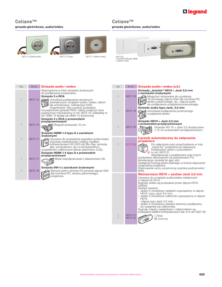 Celiane™ Celiane™ gniazda głośnikowe, audio/wideo gniazda głośnikowe, audio/wideo 0673 13 Szkło kaolin Pak. 1 1 Nr ref. 0673 73 Tytan 0673 17 Szkło mokka Gniazda audio i wideo Pak. Wyposażone w blok zacisków śrubowych do podłączenia przewodów. Gniazdo 3 x RCA 0673 13 Umożliwia podłączenie dowolnych zewnętrznych urządzeń audio i wideo, takich jak wzmacniacz, odtwarzacz DVD, magnetowid. Aby uzyskać podwójne trzywejściowe gniazdo RCA, należy połączyć dwa pojedyncze mechanizmy nr ref. 0673 13 i plakietkę nr ref. 0682 14 (biała) lub 0685 14 (tytanowa). Gniazdo 3 x RCA z przewodami przyłączeniowymi 0673 73 Długość przewodu 15 cm. 1 Gniazdo HDMI 1.3 typu A z zaciskami śrubowymi 0673 17 Używane do przesyłania sygnałów audio/wideo wysokiej rozdzielczości między źródłem (odtwarzaczem HD-DVD lub Blu-Ray, konsolą gier, komputerem, itp.) a kompatybilnym urządzeniem odbiorczym (ekran plazmowy, LCD). Gniazdo HDMI 1.4 typu A z przewodem przyłączeniowym 0673 77 Może współpracować z telewizorami 3D. 1 0673 16 1 0673 32 z ramkami Mosaic Białe i Celiane Tytan 1 1 1 Nr ref. Gniazda audio i wideo (cd.) Gniazda „żeńskie” HD15 + Jack 3,5 mm z zaciskami śrubowymi 0673 19 Mogą być stosowane do uzyskania 15-pinowego złącza VGA dla monitora PC, ekranu plazmowego, itp. i złącza audio do podłączenia urządzenia przenośnego. Gniazdo audio typu Jack, 3,5 mm 0673 18 Umożliwia podłączenie przenośnego urządzenia stereo. Gniazdo HD15 + Jack 3,5 mm z przewodem przyłączeniowym 0673 76 Gniazdo HD 15 + Jack 3,5 dostarczane z 15 cm przewodem przyłączeniowym.. Łącznik automatyczny do załączania projektora 1 0673 69 Gniazdo DVI-I z zaciskami śrubowymi Stanowi pełno-pinowe (15-pinowe) złącze VGA dla monitora PC, ekranu plazmowego, projektora. Do załączania oraz przechodzenia w tryb „stand by” projektora lub telewizora. Instalowany razem z przyciskiem nr ref. 0670 31. Współpracuje z projektorami oraz innymi produktami sterowanymi na podczerwień (TV, klimatyzacja, konsole do gier, etc). Zastępuje funkcję pilota zdalnego w funkcji włączania/ wyłączania projektora. Wykrywanie ruchu za pomocą czujnika podczerwieni (PIR). Wzmacniacz HD15 + zestaw Jack 3,5 mm Używany do urządzeń audio/wideo oddalonych o więcej niż 20 m. Sygnały wideo są przesyłane przez złącze HD15 (UXGA). Zestaw zawiera: – Jeden 4-modułowy nadajnik wyposażony w złącze HD15 i typu Jack 3,5 mm; – Jeden 4-modułowy odbiornik wyposażony w złącze HD15 i złącze typu Jack 3,5 mm; – Jeden 4-modułowy zasilacz sieciowy podłączany do nadajnika lub odbiornika. Sygnały między nadajnikiem i odbiornikiem są przesyłane kablem komputerowym kat. 6 nr ref. 0327 56 1 1 0673 31 0673 32 Nowe produkty oznaczone są czerwonym numerem referencyjnym Biały Tytanowy 625