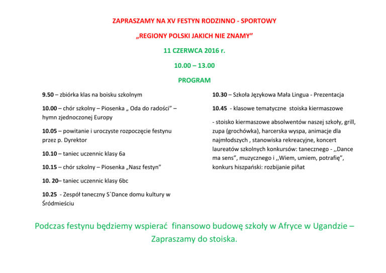 ZAPRASZAMY NA XV FESTYN RODZINNO - SPORTOWY „REGIONY POLSKI JAKICH NIE ZNAMY” 11 CZERWCA 2016 r. 10.00 – 13.00 PROGRAM 9.50 – zbiórka klas na boisku szkolnym 10.30 – Szkoła Językowa Mała Lingua - Prezentacja 10.00 – chór szkolny – Piosenka „ Oda do radości” – hymn zjednoczonej Europy 10.45 - klasowe tematyczne stoiska kiermaszowe 10.05 – powitanie i uroczyste rozpoczęcie festynu przez p. Dyrektor 10.10 – taniec uczennic klasy 6a 10.15 – chór szkolny – Piosenka „Nasz festyn” - stoisko kiermaszowe absolwentów naszej szkoły, grill, zupa (grochówka), harcerska wyspa, animacje dla najmłodszych , stanowiska rekreacyjne, koncert laureatów szkolnych konkursów: tanecznego - ,,Dance ma sens”, muzycznego i ,,Wiem, umiem, potrafię”, konkurs hiszpański: rozbijanie piñat 10. 20– taniec uczennic klasy 6bc 10.25 - Zespół taneczny S`Dance domu kultury w Śródmieściu Podczas festynu będziemy wspierać finansowo budowę szkoły w Afryce w Ugandzie – Zapraszamy do stoiska. ZAPRASZAMY NA XV FESTYN RODZINNO - SPORTOWY „REGIONY POLSKI JAKICH NIE ZNAMY” 11 CZERWCA 2016 r. 10.00 – 13.00 PROGRAM 10.45 – rodzinne wyścigi rzędów klasy pierwsze 11.00 – pokaz Judo 11.15 - rodzinne wyścigi rzędów klasy drugie 11.30 – pokaz karate 11.45 - rodzinne wyścigi rzędów klasy trzecie 12.00 – koncert laureatów szkolnych konkursów: tanecznego - ,,Dance ma sens”, muzycznego i ,,Wiem, umiem, potrafię” 12.00 – turniej ringo klas czwartych 12.15 - turniej ringo klas piątych (reprezentacja 3 chłopców, 3 dziewczynki, 4 rodziców) 12.30 – AUKCJA 12.30 – mecz piłki nożnej: Uczniowie klas VI vs Rodzice 13.00 – Zakończenie festynu. Podczas festynu będziemy wspierać finansowo budowę szkoły w Afryce w Ugandzie – Zapraszamy do stoiska.