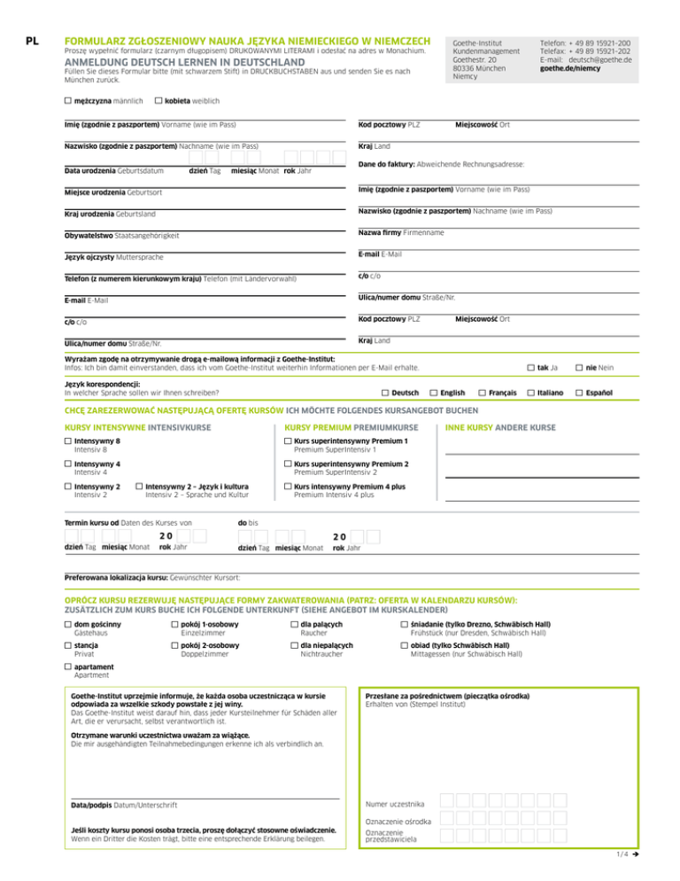 PL FORMULARZ ZGŁOSZENIOWY NAUKA JĘZYKA NIEMIECKIEGO W NIEMCZECH Goethe-Institut Kundenmanagement Goethestr. 20 80336 München Niemcy Proszę wypełnić formularz (czarnym długopisem) DRUKOWANYMI LITERAMI i odesłać na adres w Monachium. ANMELDUNG DEUTSCH LERNEN IN DEUTSCHLAND Füllen Sie dieses Formular bitte (mit schwarzem Stift) in DRUCKBUCHSTABEN aus und senden Sie es nach München zurück. mężczyzna männlich Telefon:+ 49 89 15921–200 Telefax: + 49 89 15921–202 E-mail:[email protected] goethe.de/niemcy kobieta weiblich Imię (zgodnie z paszportem) Vorname (wie im Pass) Kod pocztowy PLZ Nazwisko (zgodnie z paszportem) Nachname (wie im Pass) Kraj Land Data urodzenia Geburtsdatum dzień Tag Miejscowość Ort Dane do faktury: Abweichende Rechnungsadresse: miesiąc Monatrok Jahr Miejsce urodzenia Geburtsort Imię (zgodnie z paszportem) Vorname (wie im Pass) Kraj urodzenia Geburtsland Nazwisko (zgodnie z paszportem) Nachname (wie im Pass) Obywatelstwo Staatsangehörigkeit Nazwa firmy Firmenname Język ojczysty Muttersprache E-mail E-Mail Telefon (z numerem kierunkowym kraju) Telefon (mit Ländervorwahl) c/o c/o E-mail E-Mail Ulica/numer domu Straße/Nr. c/o c/o Kod pocztowy PLZ Ulica/numer domu Straße/Nr. Kraj Land Miejscowość Ort Wyrażam zgodę na otrzymywanie drogą e-mailową informacji z Goethe-Institut: Infos: Ich bin damit einverstanden, dass ich vom Goethe-Institut weiterhin Informationen per E-Mail erhalte. Język korespondencji: In welcher Sprache sollen wir Ihnen schreiben? Deutsch English Français tak Ja nie Nein Italiano Español CHCĘ ZAREZERWOWAĆ NASTĘPUJĄCĄ OFERTĘ KURSÓW ICH MÖCHTE FOLGENDES KURSANGEBOT BUCHEN KURSY INTENSYWNE INTENSIVKURSE KURSY PREMIUM PREMIUMKURSE Intensywny 8 Intensiv 8 Intensywny 4 Intensiv 4 Intensywny 2 Intensywny 2 – Język i kultura Intensiv 2 Intensiv 2 – Sprache und Kultur Kurs superintensywny Premium 1 Premium SuperIntensiv 1 Kurs superintensywny Premium 2 Premium SuperIntensiv 2 Termin kursu od Daten des Kurses von Kurs intensywny Premium 4 plus Premium Intensiv 4 plus do bis 20 dzień Tag miesiąc Monatrok Jahr INNE KURSY ANDERE KURSE 20 dzień Tag miesiąc Monatrok Jahr Preferowana lokalizacja kursu: Gewünschter Kursort: OPRÓCZ KURSU REZERWUJĘ NASTĘPUJĄCE FORMY ZAKWATEROWANIA (PATRZ: OFERTA W KALENDARZU KURSÓW): ZUSÄTZLICH ZUM KURS BUCHE ICH FOLGENDE UNTERKUNFT (SIEHE ANGEBOT IM KURSKALENDER) dom gościnny pokój 1-osobowy dla palących śniadanie (tylko Drezno, Schwäbisch Hall) Gästehaus Einzelzimmer Raucher Frühstück (nur Dresden, Schwäbisch Hall) stancja pokój 2-osobowy dla niepalących obiad (tylko Schwäbisch Hall) Privat Doppelzimmer Nichtraucher Mittagessen (nur Schwäbisch Hall) apartament Apartment Goethe-Institut uprzejmie informuje, że każda osoba uczestnicząca w kursie odpowiada za wszelkie szkody powstałe z jej winy. Das Goethe-Institut weist darauf hin, dass jeder Kursteilnehmer für Schäden aller Art, die er verursacht, selbst verantwortlich ist. Przesłane za pośrednictwem (pieczątka ośrodka) Erhalten von (Stempel Institut) Otrzymane warunki uczestnictwa uważam za wiążące. Die mir ausgehändigten Teilnahmebedingungen erkenne ich als verbindlich an. Data/podpis Datum/Unterschrift Numer uczestnika Oznaczenie ośrodka Jeśli koszty kursu ponosi osoba trzecia, proszę dołączyć stosowne oświadczenie. Wenn ein Dritter die Kosten trägt, bitte eine entsprechende Erklärung beilegen. Oznaczenie przedstawiciela 1 / 4 è PL OKREŚLENIE ZNAJOMOŚCI JĘZYKA NIEMIECKIEGO Ponieważ chcemy skierować Cię na właściwy kurs, prosimy o udzielenie odpowiedzi na następujace pytania: EINSCHÄTZUNG DEUTSCHKENNTNISSE Damit wir Sie in den für Sie geeigneten Kurs einschreiben können, bitten wir Sie, die folgenden Fragen vollständig zu beantworten: Czy w jakimkolwiek stopniu znasz język niemiecki? Haben Sie Vorkenntnisse? tak Ja nie Nein Jeśli Twoja odpowiedź to „tak”, przejdź do dalszych pytań. Fahren Sie bitte fort, wenn Sie „Ja“ angekreuzt haben. Wie lange haben Sie Deutsch gelernt? Monate Jahre Stunde/n pro Woche durchschnittlich Haben Sie eine der folgenden Prüfungen abgelegt? Goethe-Zertifikat A1: Start Deutsch 1 Goethe-Zertifikat B1 Goethe-Zertifikat A2: Goethe-Zertifikat B2 Goethe-Zertifikat C2: Start Deutsch 2 Großes Deutsches Sprachdiplom Andere Prüfung Goethe-Zertifikat C1 TestDaF Mit welchem Lehrbuch haben Sie zuletzt gelernt? A1 Auf welcher Niveaustufe war Ihr letzter Kurs? A2 B1 B2 C1 C2 Wenn Sie an einem Goethe-Institut im In- oder Ausland Deutsch lernen oder gelernt haben, werden Ihnen unsere dortigen Kolleginnen und Kollegen gern eine Einstufungsempfehlung geben: Frau / Herr hat vom bis im GI die Kursstufe mit Wir empfehlen einen Folgekurs im Niveaubereich: A1 A2 B1 B2 UE besucht. Pieczątka (ośrodka) Stempel (Institut) C1 C2 WYŚLIJ 2 / 4 è PL WARUNKI UCZESTNICTWA 1. Ogólny warunek uczestnictwa 7. Zakwaterowanie Kursant musi mieć przynajmniej 18 lat. 7.1. 2. Uczestnictwo w kursie i potwierdzenie zgłoszenia GI oferuje na życzenie zakwaterowanie za opłatą czynszową. Rezerwację zakwaterowania należy podać w zgłoszeniu. Nie istnieje możliwość obejrzenia miejsca zakwaterowania przed rozpoczęciem kursu. 2.1. Po dokonaniu zgłoszenia kursant otrzyma od Goethe-Institut e. V. (dalej zwanego GI) potwierdzenie zgłoszenia (zwane dalej potwierdzeniem zgłoszenia) na wybrane zajęcia, zakwaterowanie oraz wyżywienie (zwane łącznie kursem). Umowa zyskuje moc obowiązującą wraz z otrzymaniem potwierdzenia zgłoszenia przez kursanta. 2.2. 2.3. Wraz z potwierdzeniem zgłoszenia przesłana zostanie faktura, zawierająca należną opłatę za kurs, wyszczególnienie wszystkich świadczeń zgodnie z punktem 2.1 (zajęcia, zakwaterowanie, wyżywienie), termin płatności i numer kursanta. Konsumentom zasadniczo przysługuje prawo do odstąpienia od umowy. Bliższe informacje dotyczące prawa do odstąpienia od umowy znajdują się w pouczeniu o tym prawie doł