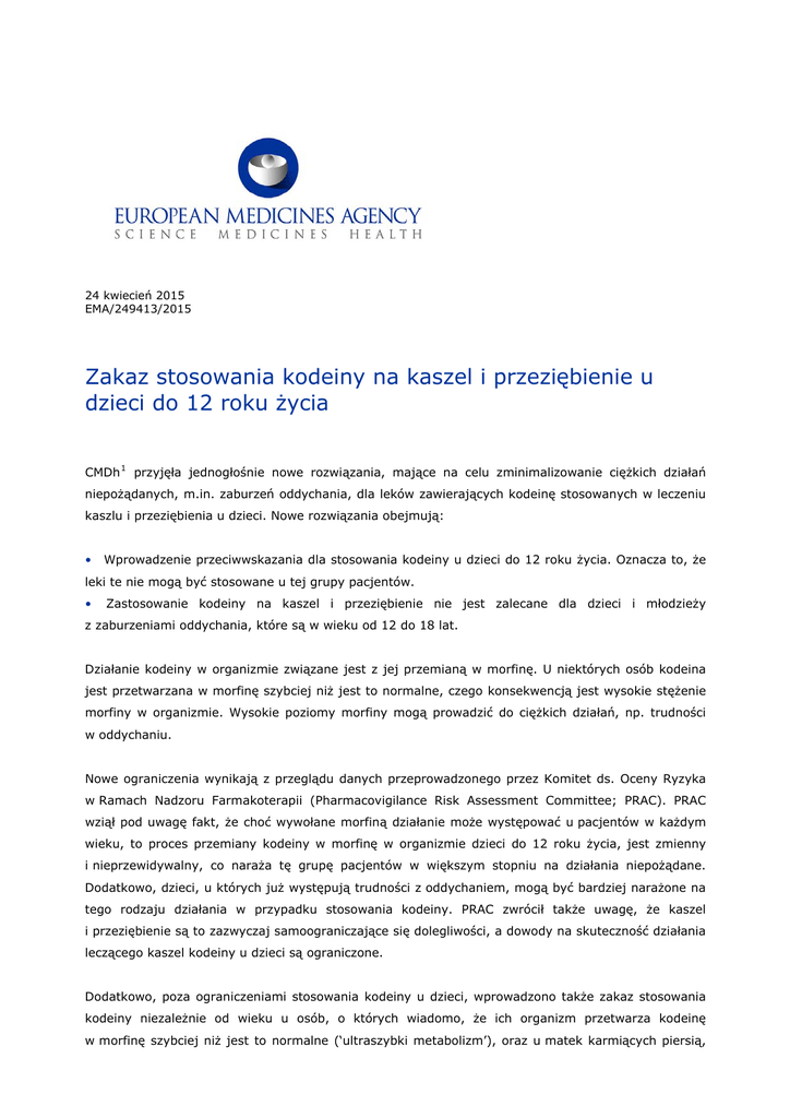 24 kwiecień 2015 EMA/249413/2015 Zakaz stosowania kodeiny na kaszel i przeziębienie u dzieci do 12 roku życia CMDh 1 przyjęła jednogłośnie nowe rozwiązania, mające na celu zminimalizowanie ciężkich działań niepożądanych, m.in. zaburzeń oddychania, dla leków zawierających kodeinę stosowanych w leczeniu kaszlu i przeziębienia u dzieci. Nowe rozwiązania obejmują: • Wprowadzenie przeciwwskazania dla stosowania kodeiny u dzieci do 12 roku życia. Oznacza to, że leki te nie mogą być stosowane u tej grupy pacjentów. • Zastosowanie kodeiny na kaszel i przeziębienie nie jest zalecane dla dzieci i młodzieży z zaburzeniami oddychania, które są w wieku od 12 do 18 lat. Działanie kodeiny w organizmie związane jest z jej przemianą w morfinę. U niektórych osób kodeina jest przetwarzana w morfinę szybciej niż jest to normalne, czego konsekwencją jest wysokie stężenie morfiny w organizmie. Wysokie poziomy morfiny mogą prowadzić do ciężkich działań, np. trudności w oddychaniu. Nowe ograniczenia wynikają z przeglądu danych przeprowadzonego przez Komitet ds. Oceny Ryzyka w Ramach Nadzoru Farmakoterapii (Pharmacovigilance Risk Assessment Committee; PRAC). PRAC wziął pod uwagę fakt, że choć wywołane morfiną działanie może występować u pacjentów w każdym wieku, to proces przemiany kodeiny w morfinę w organizmie dzieci do 12 roku życia, jest zmienny i nieprzewidywalny, co naraża tę grupę pacjentów w większym stopniu na działania niepożądane. Dodatkowo, dzieci, u których już występują trudności z oddychaniem, mogą być bardziej narażone na tego rodzaju działania w przypadku stosowania kodeiny. PRAC zwrócił także uwagę, że kaszel i przeziębienie są to zazwyczaj samoograniczające się dolegliwości, a dowody na skuteczność działania leczącego kaszel kodeiny u dzieci są ograniczone. Dodatkowo, poza ograniczeniami stosowania kodeiny u dzieci, wprowadzono także zakaz stosowania kodeiny niezależnie od wieku u osób, o których wiadomo, że ich organizm przetwarza kodeinę w morfinę szybciej niż jest to normalne (‘ultraszybki metabolizm’), oraz u matek karmiących piersią, ponieważ kodeina jest przekazywana dziecku wraz z mlekiem. Bieżący przegląd danych poprzedził inny badający dane dla kodeiny stosowanej przeciwbólowo u dzieci, którego rezultatem było wprowadzenie szeregu ograniczeń mających zapewnić, że leki te będą stosowanę w możliwie najbezpieczniejszy sposób. Ponieważ podstawy dla tych ograniczeń można także odnieść do zastosowania kodeiny w przypadku kaszlu lub przeziębienia u dzieci, rozpoczęto analizę takiego zastosowania w państwach Unii Europejskiej. Ograniczenia dla kodeiny stosowanej na przeziębienie i kaszel, są w przeważającej mierze zgodne z wcześniejszymi zaleceniami dla kodeiny stosowanej przeciwbólowo. Ponieważ CMDh przyjęła rozwiązania zaproponowane przez PRAC jednomyślnie, zostaną one wprowadzone bezpośrednio zgodnie z ustalonymi terminami przez państwa członkowskie, w których leki te zostały dopuszczone do obrotu. Informacje dla pacjentów W wyniku przeprowadzenia europejskiego przeglądu danych dla leków zawierających kodeinę stosowanych w leczeniu kaszlu i przeziębienia, wprowadzono zmiany w stosowaniu tych leków, by zapewnić pozytywny stosunek korzyści do ryzyka, w przypadku stosowania ich u dzieci i młodzieży. Leki zawierające kodeinę stosowane na kaszel i przeziębienie nie mogą być podawane dzieciom do 12 roku życia, ze względu na ryzyko ciężkich działań niepożądanych, obejmujących m.in. trudności w oddychaniu. Nie zaleca się stosowania leków zawierających kodeinę u dzieci i młodzieży wieku od 12 do 18 lat, o ile występują u nich trudności w oddychaniu, ponieważ ta grupa pacjentów jest bardziej narażona na wystąpienie problemów z oddychaniem w wyniku stosowania kodeiny. Nie wolno podawać kodeiny pacjentom w każdym wieku z ‘ultraszybkim metabolizmem kodeiny’, u których kodeina jest przetwarzana w morfinę bardzo szybko, ponieważ są bardziej narażeni na ciężkie działania niepożądane. Matki karmiące piersią nie powinny przyjmować kodeiny, ponieważ jest ona przekazywana razem z mlekiem. Rodzice i opiekunowie powinni przerwać podawanie leku zawierającego kodeinę, oraz natychmiast zwrócić się o pomoc medyczną w przypadku pojawienia się któregokolwiek z następujących objawów: spowolnione lub płytkie oddychanie, dezorientacja, senność, zwężenie się źrenic, nudności lub wymioty, zaparcia i brak apetytu. W przypadku przyjmowania leku zawierającego kodeinę, prosimy kierować wszelkie pytania i wątpliwości do lekarza lub farmaceuty. Informacje dla przedstawicieli zawodów medycznych Kodeina na kaszel i przeziębienie jest przeciwwskazana dla dzieci w wieku poniżej 12 lat i nie jest zalecana dla dzieci w wieku od 12 do 18 lat, u których występują zaburzenia oddychania. Kodeina jest także przeciwwskazana u kobiet karmiących piersią i pacjentów, którzy mają ultra- szybki metabolizm CYP2D6. 1 CMDh jest organem regulacyjnym reprezentującym państwa członkowskie Unii Europejskiej (UE) oraz Islandię, Powyższe rozwiązania zaproponowano w konsekwencji przeprowadzenia przeglądu danych bezpieczeństwa i skuteczności stosowania kodeiny w leczeniu kaszlu i przeziębienia, włącznie z danymi z badań klinicznych, badań obserwacyjnych, meta-analiz, danych porejestracyjnych dostępnych w Europie oraz pozostałej dostępnej literatury na temat stosowania kodeiny u dzieci. W sumie zidentyfikowano na podstawie dostępnych publikacji 14 przypadków zatrucia kodeiną u dzieci ( wieku od 17 dni do 6 lat), powiązanych z leczeniem kaszlu w przebiegu infekcji układu oddechowego, z czego cztery miały skutek śmiertelny. Dostępne dane sugerują, że sposób w jaki kodeina jest przetwarzana w morfinę u dzieci w wieku do lat 12, jest bardziej zmienny i nieprzewidywalny, w porów