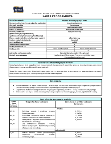 MAŁOP OLSKA WYŻSZ A SZ KOŁA E KONOMICZNA W TARN OW IE KARTA PROGRAMOWA Moduł kształcenia Proces inwestycyjny – M32 Nazwa modułu kształcenia w języku angielskim Kierunek studiów Profil kształcenia Forma kształcenia Poziom przedmiotu (podstawowy/specjalnościowy/ ogólnouczelniany/kierunkowy/praktyczny) Status przedmiotu (obowiązkowy/do wyboru) Poziom modułu kształcenia Język wykładowy Semestr realizacji modułu Liczba punktów ECTS Liczba godzin Investment process Zarządzanie ogólnoakademicki studia niestacjonarne specjalnościowy obowiązkowy I stopień polski V 3 Forma modułu: wykład Forma modułu: ćwiczenia 15 Katedra Nieruchomości i Ubezpieczeń Rachunkowość finansowa, Finanse przedsiębiorstwa, Ekonomika nieruchomości Jednostka realizująca moduł Moduły poprzedzające Syntetyczna charakterystyka modułu Moduł poświęcony jest zagadnieniom ekonomicznych i praktycznych aspektów procesu inwestycyjnego oraz metod ekonomicznej oceny przedsięwzięć inwestycyjnych. Słowa kluczowe: inwestycje, działalność inwestycyjna, proces inwestycyjny, struktura procesu inwestycyjnego, rachunek efektywności inwestycyjnej, metody oceny projektów inwestycyjnych Cele modułu Przedstawienie – w ujęciu teoretycznym i praktycznym – istoty oraz ekonomicznego - organizacyjnego aspektu procesu inwestycyjnego i metod ekonomicznej oceny przedsięwzięć inwestycyjnych. Zapoznanie studentów z zagadnieniami dotyczącymi organizacji, kontroli i oceny procesu inwestycyjnego. Przekazanie wiedzy na temat poszczególnych etapów procesu inwestycyjnego, metod jego kontroli i oceny. Opis efektów kształcenia modułu Symbol efektu kształcenia dla modułu Osiągnięte efekty kształcenia Odniesienie do efektów kształcenia dla kierunku Wiedza: W_01 W_02 W_03 W_04 U_01 Definiuje pojęcie i strukturę procesu inwestycyjnego. Formułuje i objaśnia pojęcie inwestycji i uczestników procesu inwestycyjnego. Identyfikuje i wyjaśnia podstawowe źródła finansowania inwestycji. Zna podstawowe założenia i formuły metod statycznych i dynamicznych oceny efektywności inwestycji. Umiejętności: Potrafi określić zakres podstawowych czynności uczestników procesu inwestycyjnego. K_W03++ K_W04+ K_W07+ K_W10++ K_W12+ K_U01+, K_U02++ K_U05+ U_02 U_03 K_01 K_02 Posiada umiejętność stosowania metod przy podejmowaniu decyzji realizacji projektów inwestycyjnych. Umie zastosować metody sieciowe w organizowaniu koncepcji przebiegu procesu inwestycyjnego. Kompetencje społeczne: Jest przygotowany do uczestnictwa w budowaniu projektów inwestycyjnych indywidualnie i w zespole. Ma świadomość konieczności kierowania się przesłankami obiektywnymi i etycznymi w realizacji inwestycji. K_U09+ K_U12+ K_K02++ K_K04++ K_K06++ Treści kształcenia modułu Forma modułu: wykład Literatura podstawowa Literatura uzupełniająca Forma modułu: ćwiczenia 1. Zagadnienia teoretyczne (Pojęcie i zakres działalności inwestycyjnej; Podstawowe kierunki inwestowania; Projekty inwestycyjne i źródła ich finansowania; Kryteria wyboru kierunków inwestowania; Proces inwestycyjny i jego struktura; Podmioty procesu inwestowania; Pojęcie i rodzaje rachunku efektywności inwestycji; Statyczne i dynamiczne metody oceny efektywności inwestycji). 2. Inwestycje w nieruchomości. Nieruchomość jako przedmiot inwestowania. Inwestycje w zarządzaniu nieruchomościami. 3. Zasady planowania organizacji procesu inwestycyjnego: Tworzenie harmonogramu - Metoda Gantta. Metody sieciowe – PERT (metoda ścieżki krytycznej). Praktyczne wykorzystanie metod kontroli przebiegu procesu inwestycyjnego. 4. Działalność bieżąca i rozwojowa podmiotów gospodarczych. 5. Klasyfikacja źródeł finansowania przedsięwzięć inwestycyjnych: źródła pochodzenia kapitału, stopa procentowa, koszty pozyskania kapitału, przyszła i obecna wartość pieniądza. 6. Metody statyczne oceny projektów inwestycyjnych. Okres zwrotu, stopa zwrotu, test pierwszego roku. Praktyczne przykłady zastosowania metod statycznych. 7. Metody dynamiczne oceny projektów inwestycyjnych. NPV, IRR, zdyskontowany okres zwrotu, wskaźnik inwestycyjny. Praktyczne przykłady zastosowania metod dynamicznych. 8. Metody oceny efektywności ekonomicznej procesu inwestycyjnego w zadaniach. Zadania tekstowe z zakresu wykorzystania metod oceny efektywności ekonomicznej procesu inwestycyjnego. 9. Praktyczne ćwiczenia w zakresie planowania przedsięwzięć inwestycyjnych. Case study. A. Rak, Budowlane przedsięwzięcia inwestycyjne. Środowiskowe uwarunkowania przygotowania i realizacji, Wydawnictwo Naukowe PWN, Warszawa 2014 rok; P. Mielcarz, P. Paszczyk, Analiza projektów inwestycyjnych w procesie tworzenia wartości przedsiębiorstw, Wydawnictwo Naukowe PWN, Warszawa 2013 rok; P. Korzeniowski, Instytucje prawne ochrony środowiska a proces inwestycyjnobudowlany, Wydawnictwo: Difin, Warszawa 2012 rok; M. Połoński, Kierowanie budowlanym procesem inwestycyjnym, Wydawnictwo SGGW, Warszawa 2009 rok; M. Bielski, Wybrane aspekty procesu inwestycyjno – budowlanego, Wydawnictwo C.H. Beck, Warszawa 2009 rok; H. Henzel (red), Strategie inwestowania na rynku nieruchomości, Wydawnictwo AE w Katowicach, Katowice 2009 rok; M. Mikita, Rynki inwestycji alternatywnych, Wydawnictwo: Poltext, Warszawa 2009 rok; W. A. Werner, Proces inwestycyjny: studium przypadku, Wydawnictwo: Oficyna Wydawnicza Politechniki Warszawskiej, Warszawa 2007 rok; H. Kisilowska (red). Proces inwestycyjno-budowlany: wzory pism i umów, Wydawnictwo LexisNexis Polska, Warszawa 2010 rok; K. Chrabąszcz, Condoinwestycje jako alternatywna forma alokacji kapitału, Zeszyt Naukowy MWSE w Tarnowie nr 1(24), s. 47 – 59, Wydawnictwo MWSE w Tarnowie, Tarnów 2014 rok; M. Bac, Zagospodarowanie nieruchomości poprzemysłowych na cele mieszkaniowe i komercyjne na przykładzie loftów, Zeszyt Naukowy MWSE w Tarnowie, nr 2(21), s. 9 – 24, Wyd. MWSE w Tarnowie, Tarnów 2012 rok, (dostęp: http://zn.mwse.