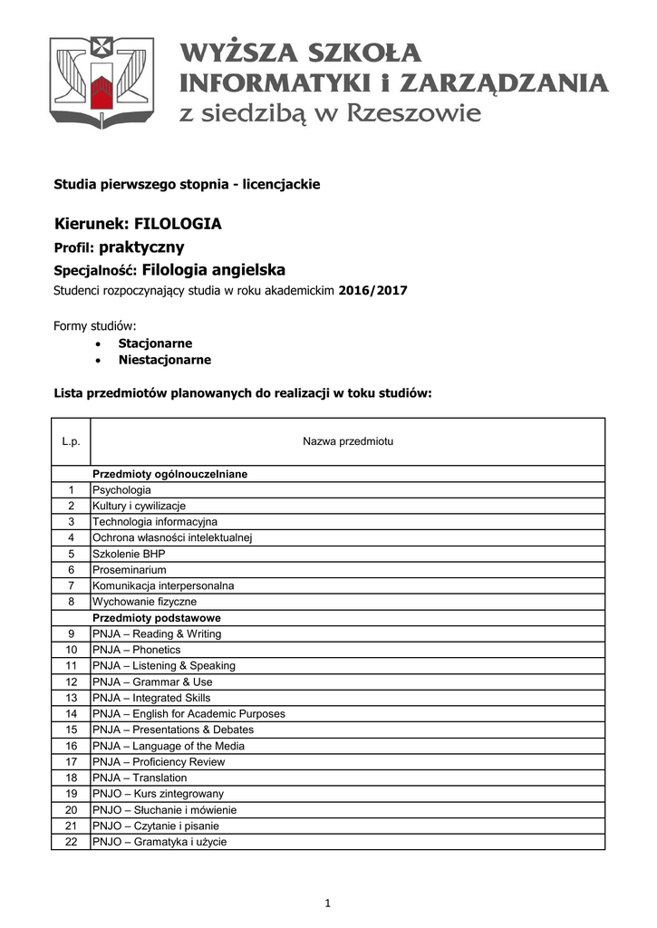 Studia pierwszego stopnia - licencjackie Kierunek: FILOLOGIA Profil: praktyczny Specjalność: Filologia angielska Studenci rozpoczynający studia w roku akademickim 2016/2017 Formy studiów: Stacjonarne Niestacjonarne Lista przedmiotów planowanych do realizacji w toku studiów: L.p. 1 2 3 4 5 6 7 8 9 10 11 12 13 14 15 16 17 18 19 20 21 22 Nazwa przedmiotu Przedmioty ogólnouczelniane Psychologia Kultury i cywilizacje Technologia informacyjna Ochrona własności intelektualnej Szkolenie BHP Proseminarium Komunikacja interpersonalna Wychowanie fizyczne Przedmioty podstawowe PNJA – Reading & Writing PNJA – Phonetics PNJA – Listening & Speaking PNJA – Grammar & Use PNJA – Integrated Skills PNJA – English for Academic Purposes PNJA – Presentations & Debates PNJA – Language of the Media PNJA – Proficiency Review PNJA – Translation PNJO – Kurs zintegrowany PNJO – Słuchanie i mówienie PNJO – Czytanie i pisanie PNJO – Gramatyka i użycie 1 23 24 25 26 27 28 29 30 31 32 33 34 35 Przedmioty kierunkowe Socjolingwistyka z elementami psycholingwistyki Stylistyka języka polskiego Historia kultury i literatury angielskiej Historia kultury i literatury amerykańskiej Gramatyka opisowa języka angielskiego Historia języka angielskiego Wstęp do językoznawstwa Gramatyka kontrastywna angielsko-polska Analiza i interpretacja tekstu literackiego Przedmiot do wyboru 1 Przedmiot do wyboru 2 Seminarium dyplomowe Praktyka zawodowa PNJA Praktyczna Nauka Języka Angielskiego PNJO Praktyczna Nauka Języka Obcego (do wyboru język niemiecki lub rosyjski) Lp. 1 2 Lp. 1 2 Przedmioty do wyboru 1 Wiedza o krajach angielskiego obszaru językowego Historia angielskiego obszaru językowego Przedmioty do wyboru 2 Styles of English - Vocabulary Styles of English - Grammar in Use Specjalizacja: Tłumaczeniowa Lp. 1 2 3 4 5 Nazwa przedmiotu Wstęp do tłumaczenia Tłumaczenie tekstów specjalistycznych Tłumaczenie tekstów niespecjalistycznych Przekład ustny Język tekstów specjalistycznych 2 Specjalizacja: Komunikacja międzykulturowa w biznesie Lp. 1 2 3 4 5 Nazwa przedmiotu Nauka o komunikowaniu Biznes międzynarodowy Komunikacja w biznesie Język perswazji i reklamy Język tekstów ekonomicznych i handlowych Specjalizacja: Nauczycielska - nowoczesne metody i multimedia w nauczaniu języka angielskiego Lp. 1 2 3 4 5 6 7 Nazwa przedmiotu Pedagogika Psychologia wychowawcza Emisja głosu Podstawy metodyki Metodyka nauczania języka angielskiego Komputerowe wspomaganie nauczania języka Praktyka nauczycielska 3