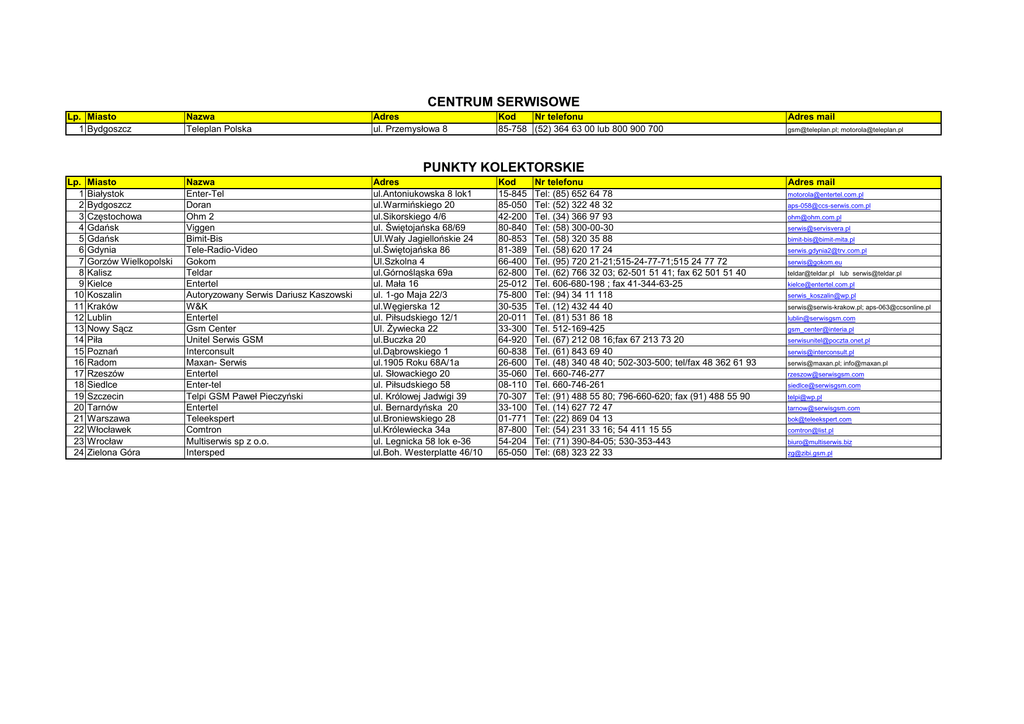 CENTRUM SERWISOWE Lp. Miasto 1 Bydgoszcz Nazwa Teleplan Polska Adres ul. Przemysłowa 8 Lp. 1 2 3 4 5 6 7 8 9 10 11 12 13 14 15 16 17 18 19 20 21 22 23 24 Nazwa Enter-Tel Doran Ohm 2 Viggen Bimit-Bis Tele-Radio-Video Gokom Teldar Entertel Autoryzowany Serwis Dariusz Kaszowski W&K Entertel Gsm Center Unitel Serwis GSM Interconsult Maxan- Serwis Entertel Enter-tel Telpi GSM Paweł Pieczyński Entertel Teleekspert Comtron Multiserwis sp z o.o. Intersped Adres ul.Antoniukowska 8 lok1 ul.Warmińskiego 20 ul.Sikorskiego 4/6 ul. Świętojańska 68/69 Ul.Wały Jagiellońskie 24 ul.Świętojańska 86 Ul.Szkolna 4 ul.Górnośląska 69a ul. Mała 16 ul. 1-go Maja 22/3 ul.Węgierska 12 ul. Piłsudskiego 12/1 Ul. Żywiecka 22 ul.Buczka 20 ul.Dąbrowskiego 1 ul.1905 Roku 68A/1a ul. Słowackiego 20 ul. Piłsudskiego 58 ul. Królowej Jadwigi 39 ul. Bernardyńska 20 ul.Broniewskiego 28 ul.Królewiecka 34a ul. Legnicka 58 lok e-36 ul.Boh. Westerplatte 46/10 Kod Nr telefonu 85-758 (52) 364 63 00 lub 800 900 700 Adres mail [email protected]; [email protected] PUNKTY KOLEKTORSKIE Miasto Białystok Bydgoszcz Częstochowa Gdańsk Gdańsk Gdynia Gorzów Wielkopolski Kalisz Kielce Koszalin Kraków Lublin Nowy Sącz Piła Poznań Radom Rzeszów Siedlce Szczecin Tarnów Warszawa Włocławek Wrocław Zielona Góra Kod 15-845 85-050 42-200 80-840 80-853 81-389 66-400 62-800 25-012 75-800 30-535 20-011 33-300 64-920 60-838 26-600 35-060 08-110 70-307 33-100 01-771 87-800 54-204 65-050 Nr telefonu Tel: (85) 652 64 78 Tel: (52) 322 48 32 Tel. (34) 366 97 93 Tel: (58) 300-00-30 Tel. (58) 320 35 88 Tel. (58) 620 17 24 Tel. (95) 720 21-21;515-24-77-71;515 24 77 72 Tel. (62) 766 32 03; 62-501 51 41; fax 62 501 51 40 Tel. 606-680-198 ; fax 41-344-63-25 Tel: (94) 34 11 118 Tel. (12) 432 44 40 Tel. (81) 531 86 18 Tel. 512-169-425 Tel. (67) 212 08 16;fax 67 213 73 20 Tel. (61) 843 69 40 Tel. (48) 340 48 40; 502-303-500; tel/fax 48 362 61 93 Tel. 660-746-277 Tel. 660-746-261 Tel: (91) 488 55 80; 796-660-620; fax (91) 488 55 90 Tel. (14) 627 72 47 Tel: (22) 869 04 13 Tel: (54) 231 33 16; 54 411 15 55 Tel: (71) 390-84-05; 530-353-443 Tel: (68) 323 22 33 Adres mail [email protected] [email protected] [email protected] [email protected] [email protected] [email protected] [email protected] [email protected] lub [email protected] [email protected] [email protected] [email protected]; [email protected] [email protected] [email protected] [email protected] [email protected] [email protected]; [email protected] [email protected] [email protected] [email protected] [email protected] [email protected] [email protected] [email protected] [email protected]