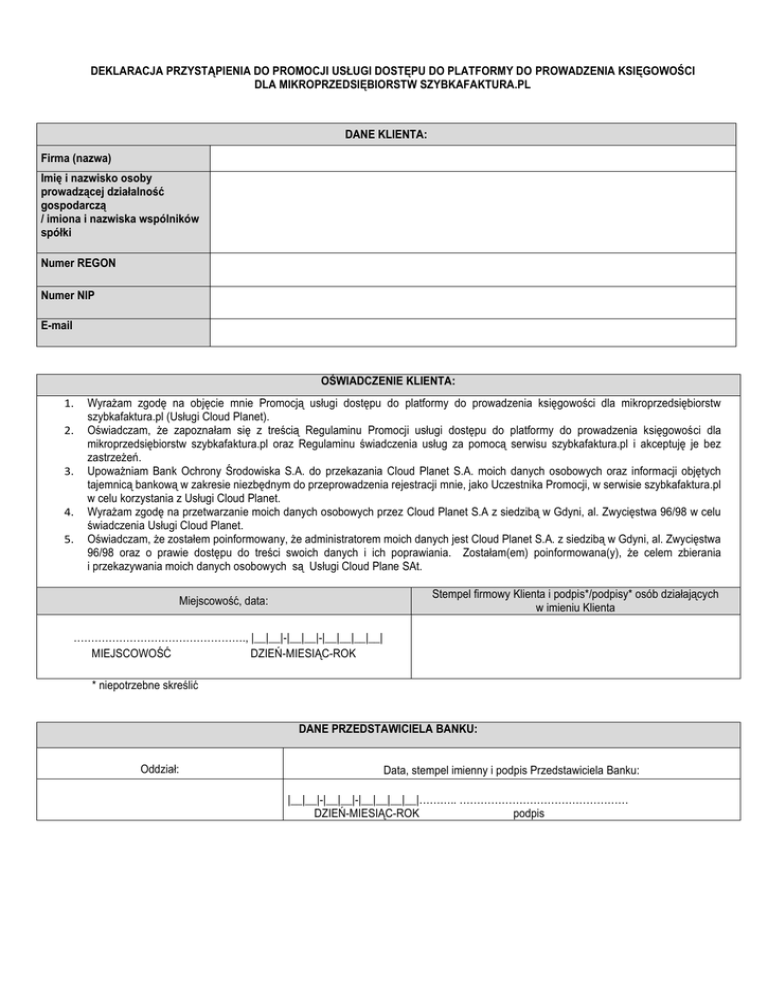 DEKLARACJA PRZYSTĄPIENIA DO PROMOCJI USŁUGI DOSTĘPU DO PLATFORMY DO PROWADZENIA KSIĘGOWOŚCI DLA MIKROPRZEDSIĘBIORSTW SZYBKAFAKTURA.PL DANE KLIENTA: Firma (nazwa) Imię i nazwisko osoby prowadzącej działalność gospodarczą / imiona i nazwiska wspólników spółki Numer REGON Numer NIP E-mail OŚWIADCZENIE KLIENTA: 1. 2. 3. 4. 5. Wyrażam zgodę na objęcie mnie Promocją usługi dostępu do platformy do prowadzenia księgowości dla mikroprzedsiębiorstw szybkafaktura.pl (Usługi Cloud Planet). Oświadczam, że zapoznałam się z treścią Regulaminu Promocji usługi dostępu do platformy do prowadzenia księgowości dla mikroprzedsiębiorstw szybkafaktura.pl oraz Regulaminu świadczenia usług za pomocą serwisu szybkafaktura.pl i akceptuję je bez zastrzeżeń. Upoważniam Bank Ochrony Środowiska S.A. do przekazania Cloud Planet S.A. moich danych osobowych oraz informacji objętych tajemnicą bankową w zakresie niezbędnym do przeprowadzenia rejestracji mnie, jako Uczestnika Promocji, w serwisie szybkafaktura.pl w celu korzystania z Usługi Cloud Planet. Wyrażam zgodę na przetwarzanie moich danych osobowych przez Cloud Planet S.A z siedzibą w Gdyni, al. Zwycięstwa 96/98 w celu świadczenia Usługi Cloud Planet. Oświadczam, że zostałem poinformowany, że administratorem moich danych jest Cloud Planet S.A. z siedzibą w Gdyni, al. Zwycięstwa 96/98 oraz o prawie dostępu do treści swoich danych i ich poprawiania. Zostałam(em) poinformowana(y), że celem zbierania i przekazywania moich danych osobowych są Usługi Cloud Plane SAt. Stempel firmowy Klienta i podpis*/podpisy* osób działających w imieniu Klienta Miejscowość, data: …………………………………………., |__|__|-|__|__|-|__|__|__|__| MIEJSCOWOŚĆ DZIEŃ-MIESIĄC-ROK * niepotrzebne skreślić DANE PRZEDSTAWICIELA BANKU: Oddział: Data, stempel imienny i podpis Przedstawiciela Banku: |__|__|-|__|__|-|__|__|__|__|……….. ………………………………………… DZIEŃ-MIESIĄC-ROK podpis