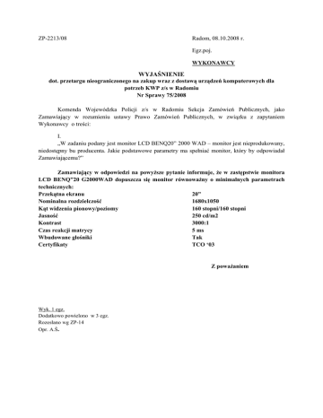 ZP-2213/08 Radom, 08.10.2008 r. Egz.poj. WYKONAWCY WYJAŚNIENIE dot. przetargu nieograniczonego na zakup wraz z dostawą urządzeń komputerowych dla potrzeb KWP z/s w Radomiu Nr Sprawy 75/2008 Komenda Wojewódzka Policji z/s w Radomiu Sekcja Zamówień Publicznych, jako Zamawiający w rozumieniu ustawy Prawo Zamówień Publicznych, w związku z zapytaniem Wykonawcy o treści: I. „W zadaniu podany jest monitor LCD BENQ20” 2000 WAD – monitor jest nieprodukowany, niedostępny bu producenta. Jakie podstawowe parametry ma spełniać monitor, który by odpowiadał Zamawiającemu?” Zamawiający w odpowiedzi na powyŜsze pytanie informuje, Ŝe w zastępstwie monitora LCD BENQ”20 G2000WAD dopuszcza się monitor równowaŜny o minimalnych parametrach technicznych: Przekątna ekranu 20” Nominalna rozdzielczość 1680x1050 Kąt widzenia pionowy/poziomy 160 stopni/160 stopni Jasność 250 cd/m2 Kontrast 3000:1 Czas reakcji matrycy 5 ms Wbudowane głośniki Tak Certyfikaty TCO ‘03 Z powaŜaniem Wyk. 1 egz. Dodatkowo powielono w 3 egz. Rozesłano wg ZP-14 Opr. A.Ś.