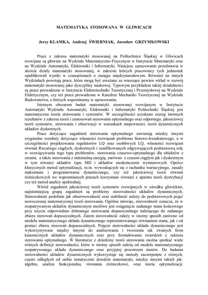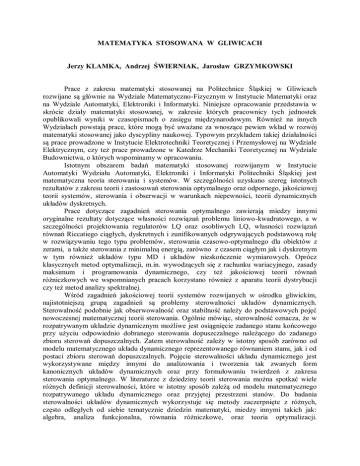 MATEMATYKA STOSOWANA W GLIWICACH Jerzy KLAMKA, Andrzej ŚWIERNIAK, Jarosław GRZYMKOWSKI Prace z zakresu matematyki stosowanej na Politechnice Śląskiej w Gliwicach rozwijane są głównie na Wydziale Matematyczno-Fizycznym w Instytucie Matematyki oraz na Wydziale Automatyki, Elektroniki i Informatyki. Niniejsze opracowanie przedstawia w skrócie działy matematyki stosowanej, w zakresie których pracownicy tych jednostek opublikowali wyniki w czasopismach o zasięgu międzynarodowym. Również na innych Wydziałach powstają prace, które mogą być uważane za wnoszące pewien wkład w rozwój matematyki stosowanej jako dyscypliny naukowej. Typowym przykładem takiej działalności są prace prowadzone w Instytucie Elektrotechniki Teoretycznej i Przemysłowej na Wydziale Elektrycznym, czy też prace prowadzone w Katedrze Mechaniki Teoretycznej na Wydziale Budownictwa, o których wspominamy w opracowaniu. Istotnym obszarem badań matematyki stosowanej rozwijanym w Instytucie Automatyki Wydziału Automatyki, Elektroniki i Informatyki Politechniki Śląskiej jest matematyczna teoria sterowania i systemów. W szczególności uzyskano szereg istotnych rezultatów z zakresu teorii i zastosowań sterowania optymalnego oraz odpornego, jakościowej teorii systemów, sterowania i obserwacji w warunkach niepewności, teorii dynamicznych układów dyskretnych. Prace dotyczące zagadnień sterowania optymalnego zawierają miedzy innymi oryginalne rezultaty dotyczące własności rozwiązań problemu liniowo-kwadratowego, a w szczególności projektowania regulatorów LQ oraz osobliwych LQ, własności rozwiązań równań Riccatiego ciągłych, dyskretnych i zunifikowanych odgrywających podstawową rolę w rozwiązywaniu tego typu problemów, sterowania czasowo-optymalnego dla obiektów z zerami, a także sterowania z minimalną energią, zarówno z czasem ciągłym jak i dyskretnym w tym również układów typu MD i układów nieskończenie wymiarowych. Oprócz klasycznych metod optymalizacji, m.in. wywodzących się z rachunku wariacyjnego, zasady maksimum i programowania dynamicznego, czy też jakościowej teorii równań różniczkowych we wspomnianych pracach korzystano również z aparatu teorii dystrybucji czy też metod analizy spektralnej. Wśród zagadnień jakościowej teorii systemów rozwijanych w ośrodku gliwickim, najistotniejszą grupą zagadnień są problemy sterowalności układów dynamicznych. Sterowalność podobnie jak obserwowalność oraz stabilność należy do podstawowych pojęć nowoczesnej matematycznej teorii sterowania. Ogólnie mówiąc, sterowalność oznacza, że w rozpatrywanym układzie dynamicznym możliwe jest osiągnięcie zadanego stanu końcowego przy użyciu odpowiednio dobranego sterowania dopuszczalnego należącego do zadanego zbioru sterowań dopuszczalnych. Zatem sterowalność zależy w istotny sposób zarówno od modelu matematycznego układu dynamicznego reprezentowanego równaniem stanu, jak i od postaci zbioru sterowań dopuszczalnych. Pojęcie sterowalności układu dynamicznego jest wykorzystywane między innymi do analizowania i tworzenia tak zwanych form kanonicznych układów dynamicznych oraz przy formułowaniu twierdzeń z zakresu sterowania optymalnego. W literaturze z dziedziny teorii sterowania można spotkać wiele różnych definicji sterowalności, które w istotny sposób zależą od modelu matematycznego rozpatrywanego układu dynamicznego oraz przyjętej przestrzeni stanów. Do badania sterowalności układów dynamicznych wykorzystuje się metody zaczerpnięte z różnych, często odległych od siebie tematycznie dziedzin matematyki, miedzy innymi takich jak: algebra, analiza funkcjonalna, równania różniczkowe, oraz teoria optymalizacji. Wykorzystując metody algebraiczne formułuje się kryteria badania sterowalności dla liniowych, skończenie-wymiarowych ciągłych układów dynamicznych oraz dla dyskretnych układów dynamicznych. W przypadku nieliniowych układów dynamicznych w celu uzyskania warunków wystarczających sterowalności stosuje się wybrane metody nieliniowej analizy funkcjonalnej. W oparciu o teorię równań różniczkowych z odchylonym argumentem oraz metody analizy funkcjonalnej a w szczególności teorię półgrup operatorów liniowych opracowano kryteria badania sterowalności względnej oraz absolutnej dla liniowych oraz nieliniowych układów dynamicznych z opóźnieniami zarówno w sterowaniu jak i we współrzędnych stanu oraz z ograniczonymi sterowaniami. Wykorzystując spektralną teorię operatorów różniczkowych oraz znane twierdzenia o punktach stałych ciągłych odwzorowań nieliniowych sformułowano warunki wystarczające aproksymacyjnej oraz dokładnej sterowalności dla różnych typów liniowych oraz semiliniowych, układów dynamicznych o parametrach rozłożonych oraz z ograniczonymi sterowaniami. Ponadto formułowano kryteria dla wybranych rodzajów stochastycznej sterowalności w odniesieniu do nieliniowych ciągłych skończenie-wymiarowych układów dynamicznych, natomiast w przypadku dyskretnych układów dynamicznych. problematyka sterowalności rozpatrywana była przy różnego typu ograniczeniach nałożonych na sterowania. Problematyka sterowania odpornego pojawia się w dwóch zasadniczych aspektach: odpornej stabilności i stabilizacji układów dynamicznych oraz sterowania gwarantującego odpowiednią jakość. Pierwszy z tych aspektów badany jest z wykorzystaniem różnych postaci funkcji Lapunowa np. kwadratowych czy odcinkowo-liniowych, a drugi z wykorzystaniem technik opartych na rachunku wariacyjnym i równaniach Hamiltona - Jacobiego - Bellmana, teorii gier oraz analizie wypukłej. Istotną klasą rozwiązywanych zagadnień były problemy sterowania i obserwacji w warunkach niepełnej informacji obejmujące zarówno zagadnienia sterowania stochastycznie optymalnego, jak i problemy zadowalającego sterowania i obserwacji przy różnych modelach niepewności, 