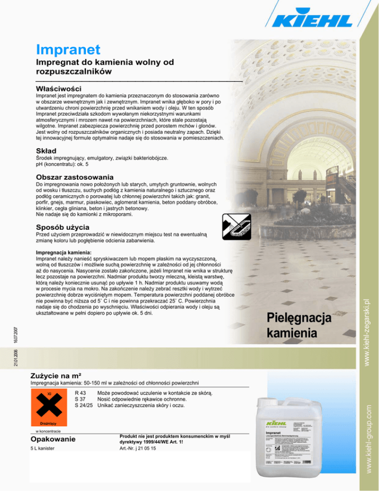 Impranet Impregnat do kamienia wolny od rozpuszczalników ⎯⎯⎯⎯⎯⎯⎯⎯⎯⎯⎯⎯⎯⎯⎯⎯⎯⎯⎯⎯⎯⎯⎯⎯⎯⎯⎯ Właściwości Impranet jest impregnatem do kamienia przeznaczonym do stosowania zarówno w obszarze wewnętrznym jak i zewnętrznym. Impranet wnika głęboko w pory i po utwardzeniu chroni powierzchnię przed wnikaniem wody i oleju. W ten sposób Impranet przeciwdziała szkodom wywołanym niekorzystnymi warunkami atmosferycznymi i mrozem nawet na powierzchniach, które stale pozostają wilgotne. Impranet zabezpiecza powierzchnię przed porostem mchów i glonów. Jest wolny od rozpuszczalników organicznych i posiada neutralny zapach. Dzięki tej innowacyjnej formule optymalnie nadaje się do stosowania w pomieszczeniach. Skład Środek impregnujący, emulgatory, związki bakteriobójcze. pH (koncentratu): ok. 5 Obszar zastosowania Do impregnowania nowo położonych lub starych, umytych gruntownie, wolnych od wosku i tłuszczu, suchych podłóg z kamienia naturalnego i sztucznego oraz podłóg ceramicznych o porowatej lub chłonnej powierzchni takich jak: granit, porfir, gnejs, marmur, piaskowiec, aglomerat kamienia, beton poddany obróbce, klinkier, cegła gliniana, beton i jastrych betonowy. Nie nadaje się do kamionki z mikroporami. Sposób użycia 21.01.2006 16.07.2007 Impregnacja kamienia: Impranet należy nanieść spryskiwaczem lub mopem płaskim na wyczyszczoną, wolną od tłuszczów i możliwie suchą powierzchnię w zależności od jej chłonności aż do nasycenia. Nasycenie zostało zakończone, jeżeli Impranet nie wnika w strukturę lecz pozostaje na powierzchni. Nadmiar produktu tworzy mleczną, kleistą warstwę, którą należy koniecznie usunąć po upływie 1 h. Nadmiar produktu usuwamy wodą w procesie mycia na mokro. Na zakończenie należy zebrać resztki wody i wytrzeć powierzchnię dobrze wyciśniętym mopem. Temperatura powierzchni poddanej obróbce nie powinna być niższa od 5˚ C i nie powinna przekraczać 25˚ C. Powierzchnia nadaje się do chodzenia po wyschnięciu. Właściwości odpierania wody i oleju są ukształtowane w pełni dopiero po upływie ok. 5 dni. Zużycie na m² Impregnacja kamienia: 50-150 ml w zależności od chłonności powierzchni R 43 Może powodować uczulenie w kontakcie ze skórą. S 37 Nosić odpowiednie rękawice ochronne. S 24/25 Unikać zanieczyszczenia skóry i oczu. Drażniący w koncentracie Opakowanie 5 L kanister Produkt nie jest produktem konsumenckim w myśl dyrektywy 1999/44/WE Art. 1! Art.-Nr. j 21 05 15 Pielęgnacja kamienia www.kiehl-zegarski.pl Przed użyciem przeprowadzić w niewidocznym miejscu test na ewentualną zmianę koloru lub pogłębienie odcienia zabarwienia.