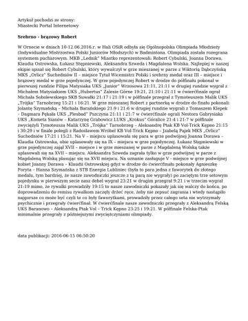 Artykuł pochodzi ze strony: Miastecki Portal Internetowy Srebrno - brązowy Robert W Ornecie w dniach 10-12.06.2016.r. w Hali OSiR odbyła się Ogólnopolska Olimpiada Młodzieży (Indywidualne Mistrzostwa Polski Juniorów Młodszych) w Badmintona. Olimpiada została rozegrana systemem pucharowym. MKB „Lednik” Miastko reprezentowali: Robert Cybulski, Joanna Dorawa, Klaudia Ostrowska, Łukasz Stępniewski, Aleksandra Szweda i Magdalena Wolska. Najlepiej w naszej ekipie spisał się Robert Cybulski, który wywalczył w grze mieszanej w parze z Wiktorią Dąbczyńską MKS „Orlicz” Suchedniów II – miejsce Tytuł Wicemistrz Polski i srebrny medal oraz III – miejsce i brązowy medal w grze pojedynczej. W grze pojedynczej Robert w drodze do półfinału pokonał w pierwszej rundzie Filipa Matysiaka UKS „Junior” Wrzosowa 21:11, 21:11 w drugiej rundzie wygrał z Michałem Matysiakiem UKS „Hubertus” Zalesie Górne 19:21, 21:10 i 21:11 w ćwierćfinale ograł Michała Sobolewskiego SKB Suwałki 21:17 i 21:19 i w półfinale przegrał z Tymoteuszem Malik UKS „Trójka” Tarnobrzeg 15:21 i 16:21. W grze mieszanej Robert z partnerką w drodze do finału pokonali: Jolantę Szymańską – Michała Barańskiego 21:9 i 21:6 w drugiej rundzie wygrali z Tomaszem Klepek – Dagmara Pękała UKS „Plesbad” Pszczyna 21:11 i 21:7 w ćwierćfinale ograli Nestora Gabrysiaka UKS „Kometa Sianów – Katarzynę Grabowicz LUKS „Krokus” Góralice 21:4 i 21:7 w półfinale zwyciężyli Tymoteusza Malik UKS „Trójka” Tarnobrzeg – Aleksandrę Ptak KB Vol-Trick Kępno 21:15 i 30:29 i w finale polegli z Radosławem Wróbel KB Vol-Trick Kępno – Jzabelą Pajek MKS „Orlicz” Suchedniów 17:21 i 15:21. Na V – miejscu uplasowała się para w grze podwójnej Joanna Dorawa – Klaudia Ostrowska, obie uplasowały się na IX – miejscu w grze pojedynczej. Łukasz Stępniewski w grze pojedynczej zajął XVII – miejsce i w grze mieszanej w parze z Magdaleną Wolską także uplasowali się na XVII – miejscu. Aleksandra Szweda zagrała tylko w grze podwójnej w parze z Magdaleną Wolską plasując się na XVII miejscu. Na uznanie zasługuje V - miejsce w grze podwójnej kobiet Joanny Dorawa – Klaudii Ostrowskiej gdyż w drodze do ćwierćfinału pokonały Agnieszkę Foryta – Hanna Szymańska z STB Energia Lubliniec (była to para jedna z faworytek do złotego medalu, tym bardziej, że nasze zawodniczki jeszcze z tą parą nie wygrały) po zaciętym trze setowym pojedynku w pierwszym secie nasz debel wygrał 23:21 w drugim przegrał 9:21 i w trzecim wygrał 21:19 mimo, że rywalki prowadziły 19:15 to nasze zawodniczki pokazały jak się walczy do końca, po doprowadzeniu do remisu rywalkom zaczęły drżeć ręce, żeby nie zepsuć zagrania i wtedy nastąpiło najgorsze co może być czyli te co były faworytkami, prowadziły przez całego seta nie wytrzymały psychicznie i przegrały ćwierćfinał. W ćwierćfinale nasze zawodniczki przegrały z Aleksandrą Felską UKS Baranowo – Aleksandrą Ptak Vol – Trick Kępno 23:25 i 19:21. W półfinale Felska-Ptak minimalnie przegrały z późniejszymi zwyciężczyniami olimpiady. data publikacji: 2016-06-15 06:50:20