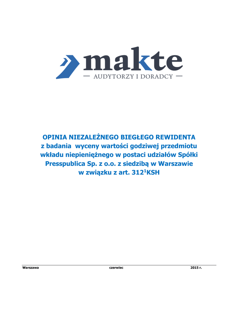 OPINIA NIEZALEŻNEGO BIEGŁEGO REWIDENTA z badania wyceny wartości godziwej przedmiotu wkładu niepieniężnego w postaci udziałów Spółki Presspublica Sp. z o.o. z siedzibą w Warszawie w związku z art. 3121KSH Warszawa czerwiec 2015 r. OPINIA NIEZALEŻNEGO BIEGŁEGO REWIDENTA z badania wyceny wartości godziwej przedmiotu wkładu niepieniężnego w postaci udziałów Spółki Presspublica Sp. z o.o. z siedzibą w Warszawie w związku z art. 3121KSH Niniejsza opinia o wartości godziwej na dzień 28 maja 2015 roku udziałów Presspublica Sp. z o.o. (dalej także Spółki), została przygotowana na zlecenie Zarządu Spółki Gremi Media S.A. z siedzibą w Warszawie, zarejestrowanej w Sądzie Rejonowym dla m.st. Warszawy w Warszawie, XII Wydział Gospodarczy KRS pod numerem 0000038155, w związku z planowanym podwyższeniem kapitału zakładowego i objęciem akcji nowej emisji w drodze wniesienia w formie wkładu niepieniężnego (aportu) udziałów Spółki Presspublica Sp. z o.o. Niniejsza opinia została przygotowana przez MAKTE Kancelaria Audytorów i Doradców Sp. z o.o. i wydana w oparciu o postanowienia: Artykułu 3121 Ustawy z dnia 15 września 2000 roku Kodeks Spółek Handlowych, Krajowych standardów rewizji finansowej, wydanych przez Krajową Radę Biegłych Rewidentów w Polsce, Ustawy z dnia 29 września 1994 roku o rachunkowości Międzynarodowych Standardów Rewizji Finansowej, a w szczególności standardów dotyczących Usług Atestacyjnych. Opinię na temat wartości godziwej udziałów na dzień 28 maja 2015 roku przygotowaliśmy na podstawie informacji uzyskanych głównie drogą analizy danych zawartych w sprawozdaniu finansowym Presspublica Sp. z o.o. sporządzonym na dzień 28 maja 2015 r. oraz wyceny sporządzonej przez BAA Polska Sp. z o.o. z siedzibą w Warszawie. Zastosowane przez nas metody miały na celu uzyskanie racjonalnej pewności o wartości godziwej udziałów Presspublica Sp. z o.o. Niniejszy dokument został przygotowany do wiadomości Zarządu Gremi Media S.A. MAKTE Kancelaria Audytorów i Doradców Sp. z o.o. nie ponosi odpowiedzialności za efekty wykorzystania opinii przez osoby trzecie, nie będące jej adresatem oraz za skutki jakichkolwiek decyzji podjętych w oparciu o informacje zawarte w niniejszym dokumencie. Za wartość godziwą udziałów na dzień 28 maja 2015 roku przyjęto wartość godziwą aktywów netto Spółki, tj. różnicę między sumą wartości godziwych poszczególnych składników majątkowych (aktywów) na ten dzień a sumą wycenionych w kwocie wymagającej zapłaty zobowiązań, które na niej w tym dniu ciążyły. Wycena udziałów metodą skorygowanych aktywów netto należy, obok wycen odtworzeniowej i likwidacyjnej, do metod bazujących na podejściu majątkowym. MAKTE Kancelaria Audytorów i Doradców Sp. z o.o. (nr. ewid 3356) 01-231 Warszawa, Płocka 15 www.makte.pl; Tel. 22-634-21-10 e-mail: [email protected] 2 2 Metody majątkowe wiążą wartość przedsiębiorstwa wyłącznie z jej aktywami netto, w związku z czym wyniki takiej wyceny nie uwzględniają: organizacji przedsiębiorstwa, efektów synergicznych połączenia poszczególnych składników majątku, efektów finansowych funkcjonowania przedsiębiorstwa, stanu i wpływu otoczenia. Ogólna formuła wyceny metodą wartości aktywów netto przedstawia się następująco: Wp = A − KO gdzie: Wp – wartość udziałów (aktywów netto) A – wartość aktywów ogółem KO – wartość kapitałów obcych ogółem Wartość godziwa aktywów oraz zobowiązań i rezerw na zobowiązania Presspublica Sp. z o.o. na dzień 28 maja 2015 roku została ustalona na podstawie sporządzonego na ten dzień sprawozdania finansowego, oraz wyceny Spółki Presspublica Sp. z o.o. dokonanej przez BAA Polska Sp. z o.o. na dzień 28 maja 2015 roku. Na podstawie powyższego stwierdzamy, iż łączna wartość godziwa udziałów Presspublica Sp. z o.o. w ilości 11 290 sztuk, ustalona w oparciu o wartość godziwą aktywów netto wynosiła 251 965,1 tys. zł na dzień 28 maja 2015 roku; Gremi Media S.A. podsiada 490 udziałów, co stanowi 4,3% udziału w kapitale podstawowym. Agnieszka Gajewska wpisana na listę biegłych rewidentów pod numerem 11085 kluczowy biegły rewident przeprowadzający badanie w imieniu MAKTE Kancelaria Audytorów i Doradców Sp. z o.o. 01-231 Warszawa ul. Płocka 15 podmiot uprawniony do badania sprawozdań finansowych KIBR 3356 Warszawa, 3 czerwiec 2015 r. MAKTE Kancelaria Audytorów i Doradców Sp. z o.o. (nr. ewid 3356) 01-231 Warszawa, Płocka 15 www.makte.pl; Tel. 22-634-21-10 e-mail: [email protected] 3 3
