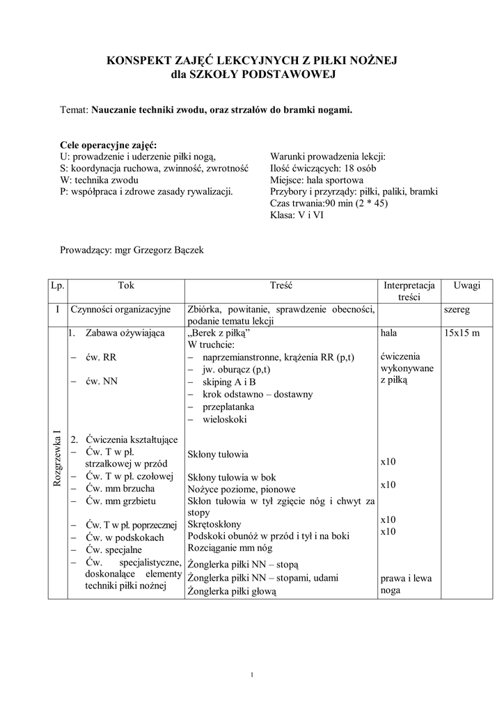 KONSPEKT ZAJĘĆ LEKCYJNYCH Z PIŁKI NOŻNEJ dla SZKOŁY
