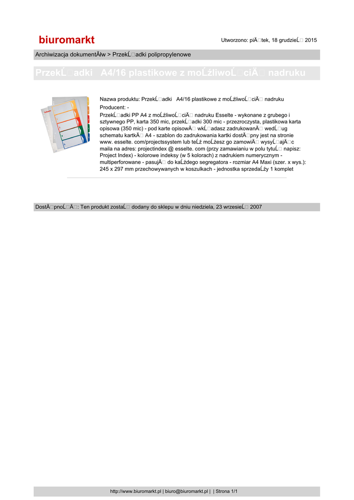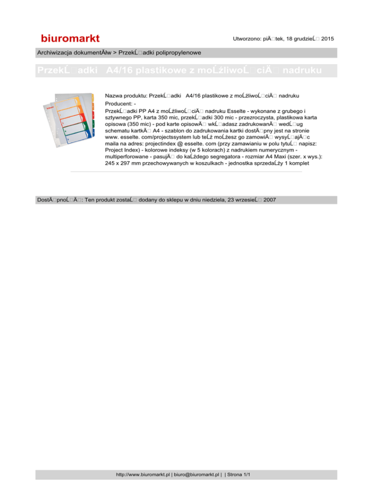 biuromarkt Utworzono: piÄ tek, 18 grudzieĹ 2015 Archiwizacja dokumentĂłw > PrzekĹ adki polipropylenowe PrzekĹ adki A4/16 plastikowe z moĹźliwoĹ ciÄ Nazwa produktu: PrzekĹ adki A4/16 plastikowe z moĹźliwoĹ ciÄ nadruku nadruku Producent: PrzekĹ adki PP A4 z moĹźliwoĹ ciÄ nadruku Esselte - wykonane z grubego i sztywnego PP, karta 350 mic, przekĹ adki 300 mic - przezroczysta, plastikowa karta opisowa (350 mic) - pod karte opisowÄ wkĹ adasz zadrukowanÄ wedĹ ug schematu kartkÄ A4 - szablon do zadrukowania kartki dostÄ pny jest na stronie www. esselte. com/projectssystem lub teĹź moĹźesz go zamowiÄ wysyĹ ajÄ c maila na adres: projectindex @ esselte. com (przy zamawianiu w polu tytuĹ napisz: Project Index) - kolorowe indeksy (w 5 kolorach) z nadrukiem numerycznym multiperforowane - pasujÄ do kaĹźdego segregatora - rozmiar A4 Maxi (szer. x wys.): 245 x 297 mm przechowywanych w koszulkach - jednostka sprzedaĹźy 1 komplet DostÄ pnoĹ Ä : Ten produkt zostaĹ dodany do sklepu w dniu niedziela, 23 wrzesieĹ http://www.biuromarkt.pl | [email protected] | | Strona 1/1 2007