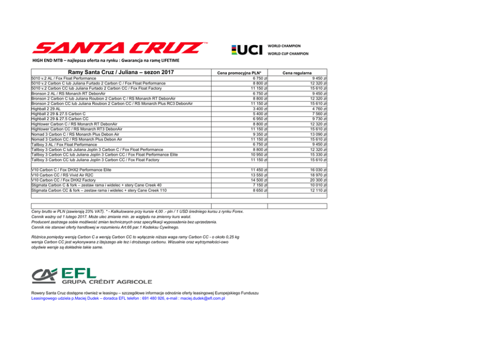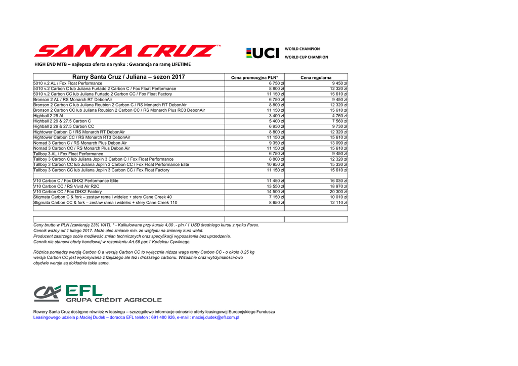 WORLD CHAMPION WORLD CUP CHAMPION HIGH END MTB – najlepsza oferta na rynku : Gwarancja na ramę LIFETIME Ramy Santa Cruz / Juliana – sezon 2017 5010 v.2 AL / Fox Float Performance 5010 v.2 Carbon C lub Juliana Furtado 2 Carbon C / Fox Float Performance 5010 v.2 Carbon CC lub Juliana Furtado 2 Carbon CC / Fox Float Factory Bronson 2 AL / RS Monarch RT DebonAir Bronson 2 Carbon C lub Juliana Roubion 2 Carbon C / RS Monarch RT DebonAir Bronson 2 Carbon CC lub Juliana Roubion 2 Carbon CC / RS Monarch Plus RC3 DebonAir Highball 2 29 AL Highball 2 29 & 27.5 Carbon C Highball 2 29 & 27.5 Carbon CC Hightower Carbon C / RS Monarch RT DebonAir Hightower Carbon CC / RS Monarch RT3 DebonAir Nomad 3 Carbon C / RS Monarch Plus Debon Air Nomad 3 Carbon CC / RS Monarch Plus Debon Air Tallboy 3 AL / Fox Float Performance Tallboy 3 Carbon C lub Juliana Joplin 3 Carbon C / Fox Float Performance Tallboy 3 Carbon CC lub Juliana Joplin 3 Carbon CC / Fox Float Performance Elite Tallboy 3 Carbon CC lub Juliana Joplin 3 Carbon CC / Fox Float Factory Cena promocyjna PLN* 6 750 zł 8 800 zł 11 150 zł 6 750 zł 8 800 zł 11 150 zł 3 400 zł 5 400 zł 6 950 zł 8 800 zł 11 150 zł 9 350 zł 11 150 zł 6 750 zł 8 800 zł 10 950 zł 11 150 zł V10 Carbon C / Fox DHX2 Performance Elite V10 Carbon CC / RS Vivid Air R2C V10 Carbon CC / Fox DHX2 Factory Stigmata Carbon C & fork – zestaw rama i widelec + stery Cane Creek 40 Stigmata Carbon CC & fork – zestaw rama i widelec + stery Cane Creek 110 11 450 zł 13 550 zł 14 500 zł 7 150 zł 8 650 zł Ceny brutto w PLN (zawierają 23% VAT). * - Kalkulowane przy kursie 4,00 .- pln / 1 USD średniego kursu z rynku Forex. Cennik ważny od 1 lutego 2017. Może ulec zmianie min. ze względu na zmienny kurs walut. Producent zastrzega sobie możliwość zmian technicznych oraz specyfikacji wyposażenia bez uprzedzenia. Cennik nie stanowi oferty handlowej w rozumieniu Art.66 par.1 Kodeksu Cywilnego. Różnica pomiędzy wersją Carbon C a wersją Carbon CC to wyłącznie niższa waga ramy Carbon CC - o około 0,25 kg wersja Carbon CC jest wykonywana z lżejszego ale tez i droższego carbonu. Wizualnie oraz wytrzymałości-owo obydwie wersje są dokładnie takie same. Rowery Santa Cruz dostępne również w leasingu – szczegółowe informacje odnośnie oferty leasingowej Europejskiego Funduszu Leasingowego udziela p.Maciej Dudek – doradca EFL telefon : 691 480 926, e-mail : [email protected] Cena regularna 9 450 zł 12 320 zł 15 610 zł 9 450 zł 12 320 zł 15 610 zł 4 760 zł 7 560 zł 9 730 zł 12 320 zł 15 610 zł 13 090 zł 15 610 zł 9 450 zł 12 320 zł 15 330 zł 15 610 zł 16 030 zł 18 970 zł 20 300 zł 10 010 zł 12 110 zł