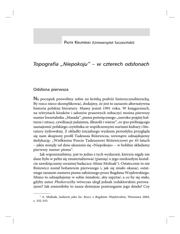 PIOTR KRUPIŃSKI (Uniwersytet Szczeciński) Topografia „Niepokoju” – w czterech odsłonach Odsłona pierwsza Na początek pozwólmy sobie na krótką podróż historycznoliteracką. By rzecz nieco skomplikować, dodajmy, że jest to zarazem alternatywna historia polskiej literatury. Mamy jesień 1991 roku. W księgarniach, na witrynach kiosków i salonów prasowych zobaczyć można pierwszy numer kwartalnika „Masada”, pisma poświęconego „szeroko pojętej kulturze i sztuce, cywilizacji judaizmu, filozofii i wierze”, eo ipso próbującego zaznajomić polskiego czytelnika ze współczesnymi nurtami kultury i literatury żydowskiej. Z okładki inicjalnego wydania periodyku przygląda się nam skupiony profil Tadeusza Różewicza, wewnątrz odnajdujemy dedykację: „Wielkiemu Poecie Tadeuszowi Różewiczowi po 45 latach – jakie minęły od dnia ukazania się «Niepokoju» – w hołdzie składamy pierwszy numer pisma”. Jak wspomnieliśmy, jest to jedno z tych wydarzeń, którym nigdy nie dane było w pełni się zmaterializować (pamięć o jego niedoszłym kształcie zawdzięczamy uważnej badaczce Alinie Molisak1). Ostatecznie to nie Różewicz został bohaterem pierwszego i, jak się miało okazać, ostatniego zarazem numeru pisma założonego przez Bogdana Wojdowskiego. Mimo to odnajdujemy w sobie śmiałość, aby zapytać: a co by się stało, gdyby autor Płaskorzeźby wówczas uległ jednak redaktorskim perswazjom? Jak zmieniłoby to nasze dzisiejsze postrzeganie jego dzieła? Czy A. Molisak, Judaizm jako los. Rzecz o Bogdanie Wojdowskim, Warszawa 2004, s. 332-333. 1 10 PIOTR KRUPIŃSKI łatwiej byłoby nam dotrzeć do stref, które w tym pisarstwie istnieją, ale wiodą żywot skryty i nieoczywisty? Wreszcie, czy musielibyśmy dopisać – zacytujmy Artura Sandauera – jeszcze jeden rozdział księgi „o sytuacji pisarza polskiego pochodzenia żydowskiego w XX wieku”2? Pytania można by mnożyć. W pewnym momencie dotrzemy jednak do progu, za którym filologiczna dociekliwość nieuchronnie przekształcić się musi w niepokój. Niepokój spotykający się – niczym „w sercu chiazmu” – z niepokojem emanującym z dzieła, które pragnęlibyśmy jak najdogłębniej poznać, zrekonstruować. Tę osobliwą topografię lęku, jakiej nie może nie uwzględniać współczesna różewiczologia, wnikliwej analizie poddała Aleksandra Ubertowska, literaturoznawczyni, której inspiracji wiele zawdzięczają studia i szkice pomieszczone w tej książce. Oddajmy zatem głos gdańskiej badaczce: Ta przejmująca gra z czytelnikiem toczy się o wysoką stawkę – uporczywe stosowanie taktyki maskowania zdaje się świadczyć o trwałym uwewnętrznieniu lęku przed wyjawieniem prawdy o własnej tożsamości i o tym, że horyzont tego lęku jest dla Różewicza czymś nieprzekraczalnym. Nieprzekraczalność zaś sytuuje interpretatora w dwuznacznej roli tropiciela, intruza, który nie waha się przed bezceremonialnym naruszeniem granic prywatności. Niewiele on wszak ryzykuje, kładzie na szali zaledwie „zgrabny pomysł interpretacyjny” czy „spójność odczytania” – Różewicz przymusza nas do refleksji nad tym, czy nasze cele badawcze stanowią wystarczające etyczne uprawomocnienie owej ingerencji w prywatność, wydarcia tajemnicy, za którą kiedyś można było zapłacić życiem3. Wraz z ostatnim zacytowanym zdaniem z wolna odsłaniałby się przed nami trakt, który – gdy już zdecydowaliśmy się na tę z wielu względów ryzykowną lekturę – dane nam było przemierzyć. Szlak ów wiedzie pomiędzy biegunami milczenia i „literaturoznawczego konceptyzmu”, nie dosięgając żadnego z nich. Gdy zachęcaliśmy do podjęcia refleksji nad pisarstwem Tadeusza Różewicza w kontekście Holokaustu, zależało nam – literaturoznawcom skupionym w Pracowni Badań nad Literaturą Zagłady Żydów, działającej w Żydowskim Instytucie Historycznym im. A. Sandauer, O sytuacji pisarza polskiego pochodzenia żydowskiego w XX wieku (Rzecz, którą nie ja powinienem był napisać...), Warszawa 1982. 3 A. Ubertowska, Świadectwo – trauma – głos. Literackie reprezentacje Holokaustu, Kraków 2007, s. 143. 2 Topografia „Niepokoju” – w czterech odsłonach 11 Emanuela Ringelbluma – aby w istotnym stopniu była to również autorefleksja, próba odpowiedzi na nierozstrzygalne pytanie: jak pisać dziś o pisaniu o Zagładzie? Twórczość Różewicza od ponad półwiecza stanowiąca, sparafrazujmy Przemysława Czaplińskiego, nieustanne „wyzwanie dla refleksji o literaturze”, to ląd, na którym, jak przekonamy się podczas lektury niniejszego tomu, wykrystalizowało się wiele niezwykle inspirujących prób zmierzenia się z tym dylematem. Niektóre z nich „dziwią się sobie”, wzajemnie polemizują, traktowane jednak jako polilogiczna całość, są świadectwem żywotności tego „nie kończącego się zadania”, jakim pozostaje interpretacja każdego arcydzieła. Z pewnością jest to jeszcze jeden powód, dla którego jako wspólnota czytelnicza winni jesteśmy wdzięczność autorowi Niepokoju. Odsłona druga Topografia „Niepokoju”. Tytuł tych rozważań, stanowiących introdukcję do zbioru rozpraw poświęconych rozległemu dziełu Tadeusza Różewicza, mógłby, a nawet powinien mieć podwójną formę. Tej binarności nie sposób usłyszeć; wiedzie ona żywot grafemiczny i objawia się – zgodnie z Różewiczowską regułą, opisaną niegdyś przez Edwarda Balcerzana4 – jako ruchomy cudzysłów, tudzież jako zawahanie pomiędzy majuskułą a minuskułą. „Niepokój” i niepokój. Niepokój i Niepokój. Na tym nie koniec jednak, bo raz zainicjowany ruch znaczeń ma to do siebie, że nie chce i nie potrafi się zatrzymać, w wyniku czego to, co przed momentem zaledwie objawiało się nam jako podwójność, teraz po raz kolejny się multiplikuje: myślę tu o tej osobliwej gramatycznej alternacji, ponownie – nie do usł