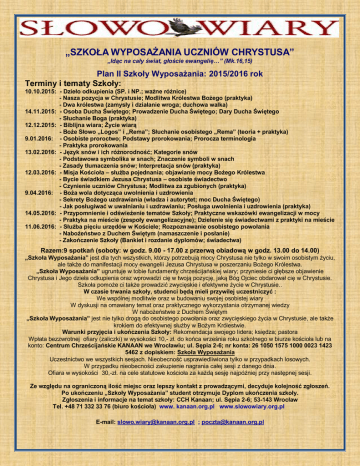 „SZKOŁA WYPOSAŻANIA UCZNIÓW CHRYSTUSA” „Idąc na cały świat, głoście ewangelię…” (Mk.16,15) Plan II Szkoły Wyposażania: 2015/2016 rok Terminy i tematy Szkoły: 10.10.2015: - Dzieło odkupienia (SP. i NP.; ważne różnice) - Nasza pozycja w Chrystusie; Modlitwa Królestwa Bożego (praktyka) - Dwa królestwa (zamysły i działanie wroga; duchowa walka) 14.11.2015: - Osoba Ducha Świętego; Prowadzenie Ducha Świętego; Dary Ducha Świętego - Słuchanie Boga (praktyka) 12.12.2015: - Biblijna wiara; Życie wiarą - Boże Słowo „Logos” i „Rema”; Słuchanie osobistego „Rema” (teoria + praktyka) 9.01.2016: - Osobiste proroctwo; Podstawy prorokowania; Prorocza terminologia - Praktyka prorokowania 13.02.2016: - Język snów i ich różnorodność; Kategorie snów - Podstawowa symbolika w snach; Znaczenie symboli w snach - Zasady tłumaczenia snów; Interpretacja snów (praktyka) 12.03.2016: - Misja Kościoła – służba pojednania; objawianie mocy Bożego Królestwa - Bycie świadkiem Jezusa Chrystusa – osobiste świadectwo - Czynienie uczniów Chrystusa; Modlitwa za zgubionych (praktyka) 9.04.2016: - Boża wola dotycząca uwolnienia i uzdrowienia - Sekrety Bożego uzdrawiania (władza i autorytet; moc Ducha Świętego) - Jak posługiwać w uwalnianiu i uzdrawianiu; Posługa uwolnienia i uzdrowienia (praktyka) 14.05.2016: - Przypomnienie i odświeżenie tematów Szkoły; Praktyczne wskazówki ewangelizacji w mocy - Praktyka na mieście (zespoły ewangelizacyjne); Dzielenie się świadectwami z praktyki na mieście 11.06.2016: - Służba pięciu urzędów w Kościele; Rozpoznawanie osobistego powołania - Nabożeństwo z Duchem Świętym (namaszczenie i posłanie) - Zakończenie Szkoły (Bankiet i rozdanie dyplomów; świadectwa) Razem:9 spotkań (soboty: w godz. 9.00 - 17.00 z przerwą obiadową w godz. 13.00 do 14.00) „Szkoła Wyposażania” jest dla tych wszystkich, którzy potrzebują mocy Chrystusa nie tylko w swoim osobistym życiu, ale także do manifestacji mocy ewangelii Jezusa Chrystusa w poszerzaniu Bożego Królestwa. „Szkoła Wyposażania” ugruntuje w tobie fundamenty chrześcijańskiej wiary; przyniesie ci głębsze objawienie Chrystusa i Jego dzieła odkupienia oraz wprowadzi cię w twoją pozycję, jaką Bóg Ojciec obdarował cię w Chrystusie. Szkoła pomoże ci także prowadzić zwycięskie i efektywne życie w Chrystusie.. W czasie trwania szkoły, studenci będą mieli przywilej uczestniczyć : We wspólnej modlitwie oraz w budowaniu swojej osobistej wiary W dyskusji na omawiany temat oraz praktycznego wykorzystania otrzymanej wiedzy W nabożeństwie z Duchem Świętym „Szkoła Wyposażania” jest nie tylko drogą do osobistego powołania oraz zwycięskiego życia w Chrystusie, ale także krokiem do efektywnej służby w Bożym Królestwie. Warunki przyjęcia i ukończenia Szkoły: Rekomendacja swojego lidera; księdza; pastora Wpłata bezzwrotnej ofiary (zaliczki) w wysokości 10,- zł. do końca września roku szkolnego w biurze kościoła lub na konto: Centrum Chrześcijańskie KANAAN we Wrocławiu; ul. Sępia 2-6; nr konta: 26 1050 1575 1000 0023 1423 5462 z dopiskiem: Szkoła Wyposażania Uczestnictwo we wszystkich sesjach. Nieobecność usprawiedliwiona tylko w przypadkach losowych. W przypadku nieobecności zakupienie nagrania całej sesji z danego dnia. Ofiara w wysokości 30,-zł. na cele statutowe kościoła za każdą sesję najpóźniej przy następnej sesji. Ze względu na ograniczoną ilość miejsc oraz lepszy kontakt z prowadzącymi, decyduje kolejność zgłoszeń. Po ukończeniu „Szkoły Wyposażania” student otrzymuje Dyplom ukończenia szkoły. Zgłoszenia i informacje na temat szkoły: CCH Kanaan; ul. Sępia 2-6; 53-143 Wrocław Tel. +48 71 332 33 76 (biuro kościoła) www. kanaan.org.pl www.slowowiary.org.pl E-mail: [email protected] ; [email protected] Dojazd: ” D „ Autobus pospieszny linii Tramwaje linii: 2, 6, 7, 17 Przystanek przy zajezdni tramwajowej na Krzykach Budynek Kościoła Zielonoświątkowego Mapka lokalizacji Centrum Chrześcijańskie Kanaan Ul. Sępia 2-6; 53-143 Wrocław tel./fax: +48 71 332 33 76 E-mail: [email protected] E-mail: [email protected] Zaproszenie II SZKOŁA WYPOSAŻANIA UCZNIÓW CHRYSTUSA Przy Centrum Chrześcijańskim KANAAN we Wrocławiu październik 2015 / czerwiec 2016