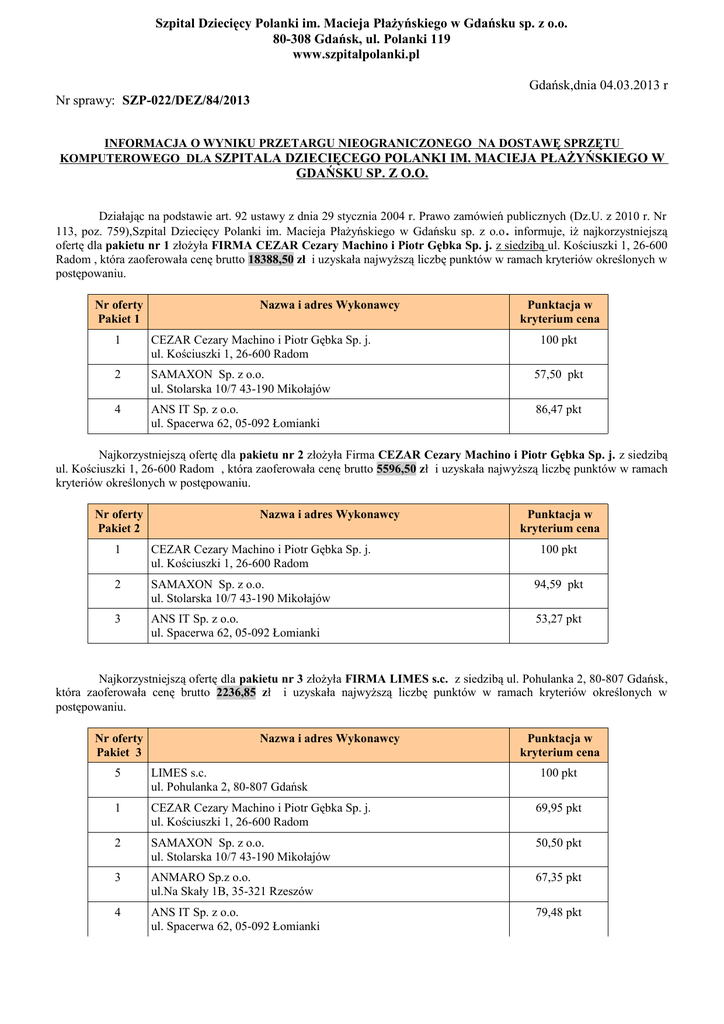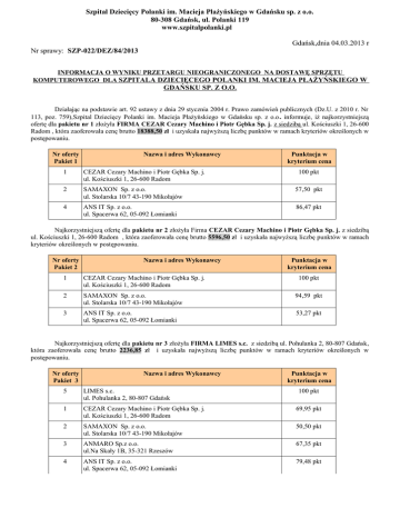 Szpital Dziecięcy Polanki im. Macieja Płażyńskiego w Gdańsku sp. z o.o. 80-308 Gdańsk, ul. Polanki 119 www.szpitalpolanki.pl Gdańsk,dnia 04.03.2013 r Nr sprawy: SZP-022/DEZ/84/2013 INFORMACJA O WYNIKU PRZETARGU NIEOGRANICZONEGO NA DOSTAWĘ SPRZĘTU KOMPUTEROWEGO DLA SZPITALA DZIECIĘCEGO POLANKI IM. MACIEJA PŁAŻYŃSKIEGO W GDAŃSKU SP. Z O.O. Działając na podstawie art. 92 ustawy z dnia 29 stycznia 2004 r. Prawo zamówień publicznych (Dz.U. z 2010 r. Nr 113, poz. 759),Szpital Dziecięcy Polanki im. Macieja Płażyńskiego w Gdańsku sp. z o.o . informuje, iż najkorzystniejszą ofertę dla pakietu nr 1 złożyła FIRMA CEZAR Cezary Machino i Piotr Gębka Sp. j. z siedzibą ul. Kościuszki 1, 26-600 Radom , która zaoferowała cenę brutto 18388,50 zł i uzyskała najwyższą liczbę punktów w ramach kryteriów określonych w postępowaniu. Nr oferty Pakiet 1 Nazwa i adres Wykonawcy Punktacja w kryterium cena 1 CEZAR Cezary Machino i Piotr Gębka Sp. j. ul. Kościuszki 1, 26-600 Radom 100 pkt 2 SAMAXON Sp. z o.o. ul. Stolarska 10/7 43-190 Mikołajów 57,50 pkt 4 ANS IT Sp. z o.o. ul. Spacerwa 62, 05-092 Łomianki 86,47 pkt Najkorzystniejszą ofertę dla pakietu nr 2 złożyła Firma CEZAR Cezary Machino i Piotr Gębka Sp. j. z siedzibą ul. Kościuszki 1, 26-600 Radom , która zaoferowała cenę brutto 5596,50 zł i uzyskała najwyższą liczbę punktów w ramach kryteriów określonych w postępowaniu. Nr oferty Pakiet 2 Nazwa i adres Wykonawcy Punktacja w kryterium cena 1 CEZAR Cezary Machino i Piotr Gębka Sp. j. ul. Kościuszki 1, 26-600 Radom 100 pkt 2 SAMAXON Sp. z o.o. ul. Stolarska 10/7 43-190 Mikołajów 94,59 pkt 3 ANS IT Sp. z o.o. ul. Spacerwa 62, 05-092 Łomianki 53,27 pkt Najkorzystniejszą ofertę dla pakietu nr 3 złożyła FIRMA LIMES s.c. z siedzibą ul. Pohulanka 2, 80-807 Gdańsk, która zaoferowała cenę brutto 2236,85 zł i uzyskała najwyższą liczbę punktów w ramach kryteriów określonych w postępowaniu. Nr oferty Pakiet 3 Nazwa i adres Wykonawcy Punktacja w kryterium cena 5 LIMES s.c. ul. Pohulanka 2, 80-807 Gdańsk 100 pkt 1 CEZAR Cezary Machino i Piotr Gębka Sp. j. ul. Kościuszki 1, 26-600 Radom 69,95 pkt 2 SAMAXON Sp. z o.o. ul. Stolarska 10/7 43-190 Mikołajów 50,50 pkt 3 ANMARO Sp.z o.o. ul.Na Skały 1B, 35-321 Rzeszów 67,35 pkt 4 ANS IT Sp. z o.o. ul. Spacerwa 62, 05-092 Łomianki 79,48 pkt Najkorzystniejszą ofertę dla pakietu nr 4 złożyła FIRMA CEZAR Cezary Machino i Piotr Gębka Sp. j. z siedzibą ul. Kościuszki 1, 26-600 Radom , która zaoferowała cenę brutto 3444,00 zł i uzyskała najwyższą liczbę punktów w ramach kryteriów określonych w postępowaniu. Nr oferty Pakiet 4 Nazwa i adres Wykonawcy Punktacja w kryterium cena 1 CEZAR Cezary Machino i Piotr Gębka Sp. j. ul. Kościuszki 1, 26-600 Radom 100 pkt 2 SAMAXON Sp. z o.o. ul. Stolarska 10/7 43-190 Mikołajów 88,83 pkt 4 ANS IT Sp. z o.o. ul. Spacerwa 62, 05-092 Łomianki 65,60 pkt Najkorzystniejszą ofertę dla pakietu nr 5 złożyła FIRMA SAMAXON Sp. z o.o. z siedzibą ul. Stolarska 10/7 43-190 Mikołajów , która zaoferowała cenę brutto 1938,48 zł i uzyskała najwyższą liczbę punktów w ramach kryteriów określonych w postępowaniu. Nr oferty Pakiet 2 Nazwa i adres Wykonawcy Punktacja w kryterium cena 2 SAMAXON Sp. z o.o. ul. Stolarska 10/7 43-190 Mikołajó 100 pkt 1 CEZAR Cezary Machino i Piotr Gębka Sp. j. ul. Kościuszki 1, 26-600 Radom 52,53 pkt 4 ANS IT Sp. z o.o. ul. Spacerwa 62, 05-092 Łomianki 46,46 pkt Najkorzystniejszą ofertę dla pakietu nr 6 złożyła FIRMA SAMAXON Sp. z o.o. z siedzibą ul. Stolarska 10/7 43-190 Mikołajów , która zaoferowała cenę brutto 3557,16 zł i uzyskała najwyższą liczbę punktów w ramach kryteriów określonych w postępowaniu. Nr oferty Pakiet 2 2 Nazwa i adres Wykonawcy SAMAXON Sp. z o.o. ul. Stolarska 10/7 43-190 Mikołajów Punktacja w kryterium cena 100 pkt Jednocześnie Zamawiający informuje, iż zgodnie z art. 94 ust. 1 pkt 2 Pzp umowa w sprawie zamówienia może być zawarta po upływie terminu 5 dni od dnia przesłania niniejszego zawiadomienia o wyborze najkorzystniejszej oferty. Powyższą informację wywieszono na tablicy ogłoszeń, stronie internetowej www.szpitalpolanki.pl Szpitala Dziecięcego Polanki im. Macieja Płażyńskiego w Gdańsku sp. z o.o. oraz wysłano listem poleconym do wszystkich uczestników postępowania w dniu 04.03.2013r.