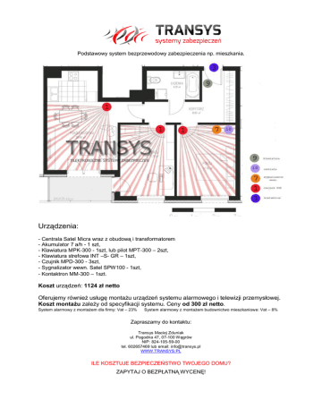 Podstawowy system bezprzewodowy zabezpieczenia np. mieszkania. Urządzenia: - Centrala Satel Micra wraz z obudową i transformatorem - Akumulator 7 a/h - 1 szt, - Klawiatura MPK-300 - 1szt, lub pilot MPT-300 – 2szt, - Klawiatura strefowa INT –S- GR – 1szt, - Czujnik MPD-300 - 3szt, - Sygnalizator wewn. Satel SPW100 - 1szt, - Kontaktron MM-300 – 1szt. Koszt urządzeń: 1124 zł netto Oferujemy również usługę montażu urządzeń systemu alarmowego i telewizji przemysłowej. Koszt montażu zależy od specyfikacji systemu. Ceny od 300 zł netto. System alarmowy z montażem dla firmy: Vat – 23% System alarmowy z montażem budownictwo mieszkaniowe: Vat – 8% Zapraszamy do kontaktu: Transys Maciej Zduniak ul. Pogodna 47, 07-100 Węgrów NIP: 824-105-59-00 tel. 602657469 lub email: [email protected] WWW.TRANSYS.PL ILE KOSZTUJE BEZPIECZEŃSTWO TWOJEGO DOMU? ZAPYTAJ O BEZPŁATNĄ WYCENĘ!
