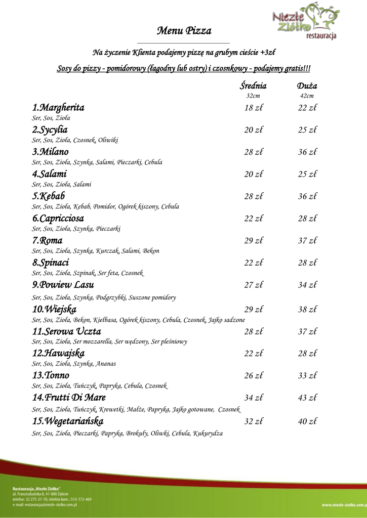 Menu Pizza Na życzenie Klienta podajemy pizzę na grubym cieście +3zł Sosy do pizzy - pomidorowy (łagodny lub ostry) i czosnkowy - podajemy gratis!!! 1.Margherita Średnia Duża 32cm 42cm 18 zł 22 zł 20 zł 25 zł 28 zł 36 zł 20 zł 25 zł 28 zł 36 zł 22 zł 28 zł 29 zł 37 zł 22 zł 28 zł 27 zł 34 zł 29 zł 38 zł Ser, Sos, Zioła 2.Sycylia Ser, Sos, Zioła, Czosnek, Oliwiki 3.Milano Ser, Sos, Zioła, Szynka, Salami, Pieczarki, Cebula 4.Salami Ser, Sos, Zioła, Salami 5.Kebab Ser, Sos, Zioła, Kebab, Pomidor, Ogórek kiszony, Cebula 6.Capricciosa Ser, Sos, Zioła, Szynka, Pieczarki 7.Roma Ser, Sos, Zioła, Szynka, Kurczak, Salami, Bekon 8.Spinaci Ser, Sos, Zioła, Szpinak, Ser feta, Czosnek 9.Powiew Lasu Ser, Sos, Zioła, Szynka, Podgrzybki, Suszone pomidory 10.Wiejska Ser, Sos, Zioła, Bekon, Kiełbasa, Ogórek kiszony, Cebula, Czosnek, Jajko sadzone 11.Serowa Uczta 28 zł 37 zł 22 zł 28 zł 26 zł 33 zł 34 zł 43 zł 32 zł 40 zł Ser, Sos, Zioła, Ser mozzarella, Ser wędzony, Ser pleśniowy 12.Hawajska Ser, Sos, Zioła, Szynka, Ananas 13.Tonno Ser, Sos, Zioła, Tuńczyk, Papryka, Cebula, Czosnek 14.Frutti Di Mare Ser, Sos, Zioła, Tuńczyk, Krewetki, Małże, Papryka, Jajko gotowane, Czosnek 15.Wegetariańska Ser, Sos, Zioła, Pieczarki, Papryka, Brokuły, Oliwki, Cebula, Kukurydza Menu Pizza 16.Diavolo (ostra) Średnia Duża 32cm 42cm 30 zł 40 zł 20 zł 25 zł 24 zł 30 zł 28 zł 36 zł 28 zł 35 zł 37 zł 46 zł 33 zł 42 zł 32 zł - - 36 zł 3 zł 4 zł 4 zł 5 zł 3 zł 4 zł 2 zł 3 zł 4 zł 5 zł 4 zł 5 zł Ser, Sos, Zioła, Tabasco, Czosnek, Salami, Papryczki Jalapenos, Peperoni, Pieczarki, Cebula 17.Fungi Ser, Sos, Zioła, Pieczarki 18.Pollo Ser, Sos, Zioła, Kurczak, Czosnek, Kukurydza 19.Verona Ser, Sos, Zioła, Szynka, Pieczarki, Papryka, Cebula, Czosnek 20. Pizza Rukola Ser, Sos, Zioła, Szynka parmeńska, biała Mozzarella, Rukola, Oliwa z oliwek 21.Carretto Siciliano Ser, Sos, Zioła, Pomidory, Szynka Parmeńska, Parmezan, Bakłażany, Rukola, brzegi nadziewana pomidorami i serem mozzarella 22.Niezłe Ziółko Ser, Sos, Zioła, Szynka, Anchois, Salami, Papryka, Zielone Oliwki, Tabasco, Majonez 23.Calzone Ser, Sos, Zioła, Szynka, Pieczarki, Papryka, Cebula, Czosnek ,Podwójny ser 24.Pizzerinki - pyszna pizza w wymiarze mini 4 pizzerinki - Capricciosa, Salami, Sycylia, Rukola Dodatki do Pizzy Mięsny Szynka, Kiełbasa, Bekon, Salami, Kabanos Kurczak, Kebab, Szynka Parmeńska Warzywny Pieczarki, Papryka, , Kukurydza, Pomidor, Oliwki, Brokuły, Szpinak, Papryczki Jalapenos, Kapary, Czerwona Fasola, Ananas, Grillowane warzywa, Peperoni, Suszone pomidory Tabasco, Czosnek, Cebula Sery Ser Pleśniowy, Ser Feta, Ser Mozzarella, Ser Żółty, Ser wędzony, Parmezan Owoce morza Krewetki, Małże, Tuńczyk, Owoce morza, Anchois