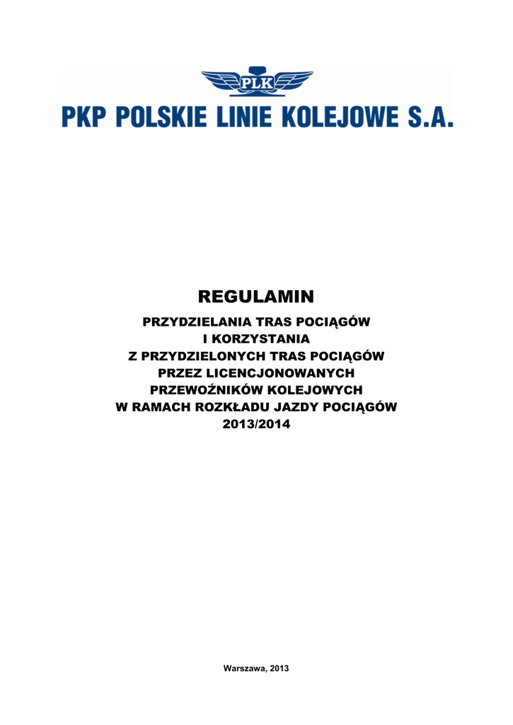 REGULAMIN PRZYDZIELANIA TRAS POCIĄGÓW I KORZYSTANIA Z PRZYDZIELONYCH TRAS POCIĄGÓW PRZEZ LICENCJONOWANYCH PRZEWOŹNIKÓW KOLEJOWYCH W RAMACH ROZKŁADU JAZDY POCIĄGÓW 2013/2014 Warszawa, 2013 Wykaz zmian Lp. Podstawa wprowadzenia zmiany Zakres wprowadzonej zmiany Obowiązuje od dnia 1 Pismo Biura Sprzedaży Centrali PLK nr IUS9-741/5-1/13 z dnia 6 marca 2013 r. §9 ust. 1-8, §27 ust. 1a Załączniki 2.4B, 2.7, 2.8 2 Pismo Biura Sprzedaży Centrali PLK nr IUS9-741/6-4/13 z dnia 26 kwietnia 2013 r. §16 ust. 8 pkt 6, 7 lit. b i c Załączniki 1, 2.1, 2.2, 2.4, 2.4B, 09 maja 2013 r. 2.7, 2.8, 3 3 Pismo Biura Sprzedaży Centrali PLK nr IUS9-741/12-1/13 z dnia 29 maja 2013 r. Załączniki 2.4B, 2.8, 4.2 09 czerwca 2013 r. Pismo Biura Sprzedaży Centrali PLK nr IUS9-741/14-1/13 z dnia 4 lipca 2013 r. §16 ust. 2, 8, 13, 15, 16; §18 ust. 7, 17; §19 ust. 2; §20 ust. 1; §21, §26 ust. 2, 2a, 2b Załączniki 2.1, 2.4, 2.4A, 2.4B, 2.5, 2.8, 4.3 14 lipca 2013 r. 5 Pismo Biura Sprzedaży Centrali PLK nr IUS9-741-23/13 z dnia 17 września 2013 r. Spis załączników, §3 ust.4, §10 ust. 2, §12 ust. 6 i 9, §13 ust. 1, §17, §26 ust. 2a, 3, 4a, §32 ust. 1 pkt 1 i 13, ust. 2 pkt 3, §33 ust. 1, §36 ust. 1, §37 ust. 1 października 2013 r. 11, §40 ust. 4 Załączniki 3, 3A, 2.4B, 2.8, 2.10 6 Pismo Biura Sprzedaży Centrali PLK Załączniki 2.4A, 2.7 nr IUS9a-741-27/13 z dnia 26 września 2013 r. 7 Pismo Biura Sprzedaży Centrali PLK nr IUS9-741/28-1/13 z dnia 11 października 2013 r. §16 ust. 26, §26 ust. 6 Załączniki 2.4B, 2.8, 6-instrukcja 24 października 2013 r. 8 Pismo Biura Sprzedaży Centrali PLK nr IUS9-741-29/13 z dnia 4 listopada 2013 r. Załączniki 1, 2.1, 2.2, 2.2A, 2.2B, 2.2C, 2.3, 2.4, 2.4A, 2.4B, 2.6, 2.7, 2.8 14 listopada 2013 r. 9 Pismo Biura Sprzedaży Centrali PLK nr IUS9-741/30-1/13 z dnia 2 grudnia 2013 r. §10 ust.5 Załączniki 1, 2.1, 2.2, 2.2A, 2.2B, 2.2C, 2.4, 2.4B, 2.7, 6A 15 grudnia 2013 r. Pismo Biura Sprzedaży Centrali PLK nr IUS9-741-34/13 z dnia 20 grudnia 2013 r. Spis załączników, §4 ust. 2 pkt 19a, §5 ust. 3, §32 ust. 1 pkt 28 i ust. 2 pkt 28, §37 ust. 10a, 6 stycznia 2014 r. Załączniki 2.2C – opis, 2.4B, 2.8, 5 – opis, 5 4 10 11 Pismo Biura Sprzedaży Centrali PLK nr IUS9-741/1-1/14 z dnia 6 lutego 2014 r. 16 marca 2013 r. 7 października 2013 r. §16 ust. 8 pkt 7 lit. c, ust. 15, §19 ust. 2 pkt 2, §40 ust. 1 i 7 Załączniki 1, 2.1, 2.2, 2.3, 2.4, 17 lutego 2014 r. 2.4B, 2.5, 2.6, 2.7, 2.8, 2.9, 2.10, 3A, 4.1, 4.2, 4.3, 4.4. Regulamin przydzielania tras pociągów i korzystania z przydzielonych tras pociągów przez licencjonowanych przewoźników kolejowych w ramach rjp 2013/2014 Spis treści SPIS ZAŁĄCZNIKÓW ..................................................................................................................................... 5 ROZDZIAŁ 1 ................................................................................................................................................... 6 POSTANOWIENIA OGÓLNE ......................................................................................................................... 6 §1. §2. §3. §4. Zarządca infrastruktury kolejowej – PKP Polskie Linie Kolejowe Spółka Akcyjna ........................ 6 Relacje przewoźnik – PLK ............................................................................................................ 6 Struktura Regulaminu, rozpowszechnianie, wprowadzanie zmian, zgłaszanie uwag .................. 6 Definicje i używane skróty ............................................................................................................. 7 ROZDZIAŁ 2 ................................................................................................................................................... 9 UDOSTĘPNIANA INFRASTRUKTURA KOLEJOWA ................................................................................... 9 §5. §6. §7. §8. Infrastruktura kolejowa .................................................................................................................. 9 Zmiany parametrów techniczno-eksploatacyjnych linii kolejowych ............................................. 10 Ograniczenia w korzystaniu z infrastruktury kolejowej ................................................................ 10 Korzystanie z energii elektrycznej na cele trakcyjne ................................................................... 12 ROZDZIAŁ 3 ................................................................................................................................................. 12 WYMAGANIA DOTYCZĄCE UZYSKANIA PRAWA DOSTĘPU DO INFRASTRUKTURY KOLEJOWEJ 12 §9. § 10 . § 11 . § 12 . Warunki uzyskania prawa dostępu .............................................................................................. 12 Przepisy wewnętrzne ................................................................................................................... 13 Personel....................................................................................................................................... 14 Tabor, urządzenia zamontowane na taborze współpracujące z urządzeniami przytorowymi, urządzenia radiotelefoniczne ....................................................................................................... 14 ROZDZIAŁ 4 ................................................................................................................................................. 16 USŁUGI ŚWIADCZONE PRZEZ PLK W RAMACH UDOSTĘPNIANIA INFRASTRUKTURY KOLEJOWEJ ....................................................................................................................................................................... 16 § 13 . § 14 . § 15 . Zakres usług ................................................................................................................................ 16 Usługi w ramach opłaty podst