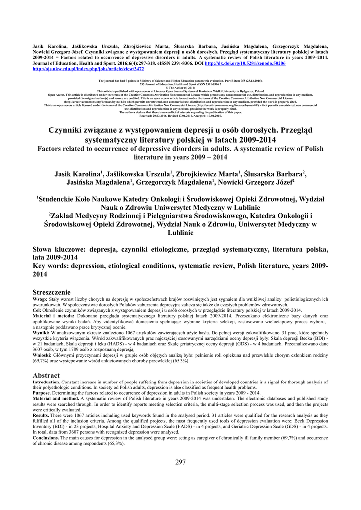 Jasik Karolina, Jaślikowska Urszula, Zbrojkiewicz Marta, Ślusarska Barbara, Jasińska Magdalena, Grzegorczyk Magdalena, Nowicki Grzegorz Józef. Czynniki związane z występowaniem depresji u osób dorosłych. Przegląd systematyczny literatury polskiej w latach 2009-2014 = Factors related to occurrence of depressive disorders in adults. A systematic review of Polish literature in years 2009–2014. Journal of Education, Health and Sport. 2016;6(4):297-318. eISSN 2391-8306. DOI http://dx.doi.org/10.5281/zenodo.50206 http://ojs.ukw.edu.pl/index.php/johs/article/view/3472 The journal has had 7 points in Ministry of Science and Higher Education parametric evaluation. Part B item 755 (23.12.2015). 755 Journal of Education, Health and Sport eISSN 2391-8306 7 © The Author (s) 2016; This article is published with open access at Licensee Open Journal Systems of Kazimierz Wielki University in Bydgoszcz, Poland Open Access. This article is distributed under the terms of the Creative Commons Attribution Noncommercial License which permits any noncommercial use, distribution, and reproduction in any medium, provided the original author(s) and source are credited. This is an open access article licensed under the terms of the Creative Commons Attribution Non Commercial License (http://creativecommons.org/licenses/by-nc/4.0/) which permits unrestricted, non commercial use, distribution and reproduction in any medium, provided the work is properly cited. This is an open access article licensed under the terms of the Creative Commons Attribution Non Commercial License (http://creativecommons.org/licenses/by-nc/4.0/) which permits unrestricted, non commercial use, distribution and reproduction in any medium, provided the work is properly cited. The authors declare that there is no conflict of interests regarding the publication of this paper. Received: 20.03.2016. Revised 17.04.2016. Accepted: 17.04.2016. Czynniki związane z występowaniem depresji u osób dorosłych. Przegląd systematyczny literatury polskiej w latach 2009-2014 Factors related to occurrence of depressive disorders in adults. A systematic review of Polish literature in years 2009 – 2014 Jasik Karolina1, Jaślikowska Urszula1, Zbrojkiewicz Marta1, Ślusarska Barbara2, Jasińska Magdalena1, Grzegorczyk Magdalena1, Nowicki Grzegorz Józef2 1 Studenckie Koło Naukowe Katedry Onkologii i Środowiskowej Opieki Zdrowotnej, Wydział Nauk o Zdrowiu Uniwersytet Medyczny w Lublinie 2 Zakład Medycyny Rodzinnej i Pielęgniarstwa Środowiskowego, Katedra Onkologii i Środowiskowej Opieki Zdrowotnej, Wydział Nauk o Zdrowiu, Uniwersytet Medyczny w Lublinie Słowa kluczowe: depresja, czynniki etiologiczne, przegląd systematyczny, literatura polska, lata 2009-2014 Key words: depression, etiological conditions, systematic review, Polish literature, years 20092014 Streszczenie Wstęp: Stały wzrost liczby chorych na depresję w społeczeństwach krajów rozwiniętych jest sygnałem dla wnikliwej analizy polietiologicznych ich uwarunkowań. W społeczeństwie dorosłych Polaków zaburzenia depresyjne zalicza się także do częstych problemów zdrowotnych. Cel: Określenie czynników związanych z występowaniem depresji u osób dorosłych w przeglądzie literatury polskiej w latach 2009-2014. Materiał i metoda: Dokonano przeglądu systematycznego literatury polskiej latach 2009-2014. Przeszukano elektroniczne bazy danych oraz opublikowane wyniki badań. Aby zidentyfikować doniesienia spełniające wybrane kryteria selekcji, zastosowano wieloetapowy proces wyboru, a następnie poddawano prace krytycznej ocenie. Wyniki: W analizowanym okresie znaleziono 1067 artykułów zawierających użyte hasła. Do pełnej wersji zakwalifikowano 31 prac, które spełniały wszystkie kryteria włączenia. Wśród zakwalifikowanych prac najczęściej stosowanymi narzędziami oceny depresji były: Skala depresji Becka (BDI) w 21 badaniach, Skala depresji i lęku (HADS) - w 4 badaniach oraz Skalę geriatrycznej oceny depresji (GDS) - w 4 badaniach. Przeanalizowano dane 3607 osób, w tym 1789 osób z rozpoznaną depresją. Wnioski: Głównymi przyczynami depresji w grupie osób objętych analizą było: pełnienie roli opiekuna nad przewlekle chorym członkiem rodziny (69,7%) oraz występowanie wśród ankietowanych choroby przewlekłej (65,3%). Abstract Introduction. Constant increase in number of people suffering from depression in societies of developed countries is a signal for thorough analysis of their polyethologic conditions. In society od Polish adults, depression is also classified as frequent health problems. Purpose. Determining the factors related to occurrence of depression in adults in Polish society in years 2009 - 2014. Material and method. A systematic review of Polish literature in years 2009-2014 was undertaken. The electronic databases and published study results were searched through. In order to identify reports meeting selection criteria, the multi-stage selection process was used, and then the projects were critically evaluated. Results. There were 1067 articles including used keywords found in the analysed period. 31 articles were qualified for the research analysis as they fulfilled all of the inclusion criteria. Among the qualified projects, the most frequently used tools of depression evaluation were: Beck Depression Inventory (BDI) - in 23 projects, Hospital Anxiety and Depression Scale (HADS) - in 4 projects, and Geriatric Depression Scale (GDS) - in 4 projects. In total, data from 3607 persons with recognized depression were analysed. Conclusions. The main causes for depression in the analysed group were: acting as caregiver of chronically ill family member (69,7%) and occurrence of chronic disease among respondents (65,3%). 297 Wstęp Od kilkunastu lat obserwuje się wyraźny wzrost liczby chorych na depresję. Depresją dotkniętych jest około 15% populacji, przy czym kobiety chorują dwukrotnie częściej niż mężczyźni (kobie
