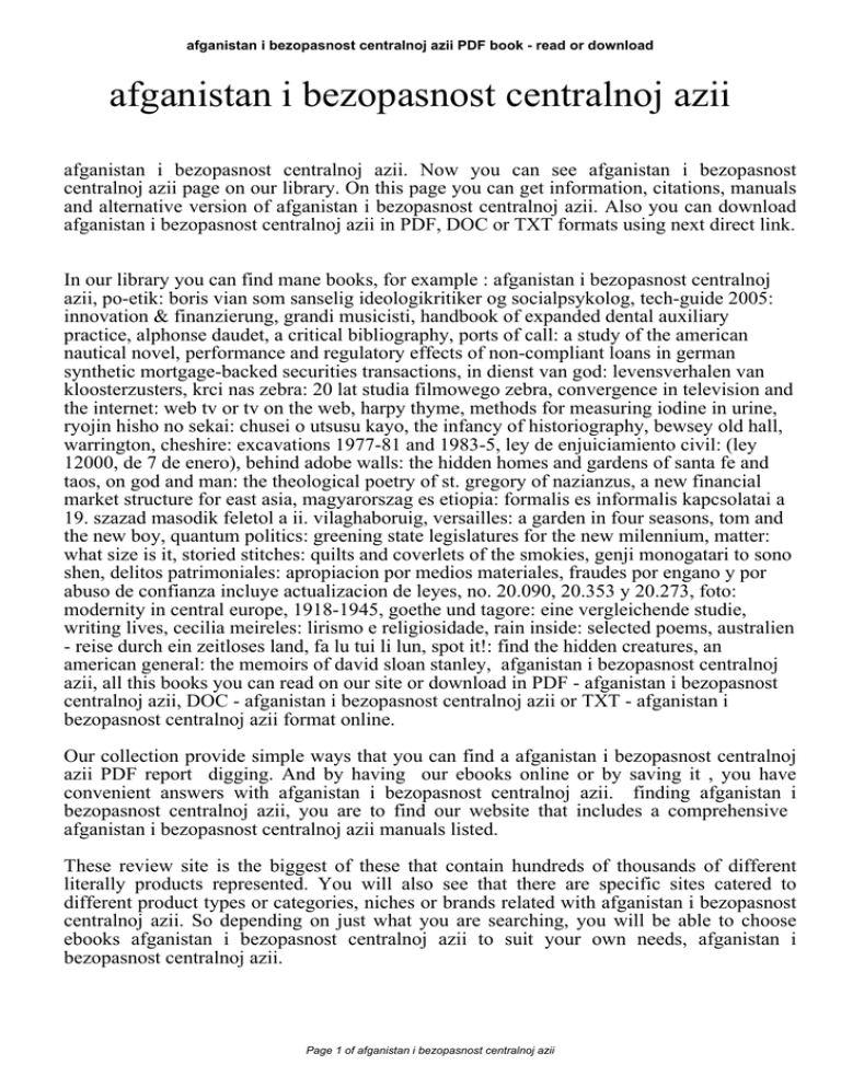 afganistan i bezopasnost centralnoj azii PDF book - read or download afganistan i bezopasnost centralnoj azii afganistan i bezopasnost centralnoj azii. Now you can see afganistan i bezopasnost centralnoj azii page on our library. On this page you can get information, citations, manuals and alternative version of afganistan i bezopasnost centralnoj azii. Also you can download afganistan i bezopasnost centralnoj azii in PDF, DOC or TXT formats using next direct link. In our library you can find mane books, for example : afganistan i bezopasnost centralnoj azii, po-etik: boris vian som sanselig ideologikritiker og socialpsykolog, tech-guide 2005: innovation & finanzierung, grandi musicisti, handbook of expanded dental auxiliary practice, alphonse daudet, a critical bibliography, ports of call: a study of the american nautical novel, performance and regulatory effects of non-compliant loans in german synthetic mortgage-backed securities transactions, in dienst van god: levensverhalen van kloosterzusters, krci nas zebra: 20 lat studia filmowego zebra, convergence in television and the internet: web tv or tv on the web, harpy thyme, methods for measuring iodine in urine, ryojin hisho no sekai: chusei o utsusu kayo, the infancy of historiography, bewsey old hall, warrington, cheshire: excavations 1977-81 and 1983-5, ley de enjuiciamiento civil: (ley 12000, de 7 de enero), behind adobe walls: the hidden homes and gardens of santa fe and taos, on god and man: the theological poetry of st. gregory of nazianzus, a new financial market structure for east asia, magyarorszag es etiopia: formalis es informalis kapcsolatai a 19. szazad masodik feletol a ii. vilaghaboruig, versailles: a garden in four seasons, tom and the new boy, quantum politics: greening state legislatures for the new milennium, matter: what size is it, storied stitches: quilts and coverlets of the smokies, genji monogatari to sono shen, delitos patrimoniales: apropiacion por medios materiales, fraudes por engano y por abuso de confianza incluye actualizacion de leyes, no. 20.090, 20.353 y 20.273, foto: modernity in central europe, 1918-1945, goethe und tagore: eine vergleichende studie, writing lives, cecilia meireles: lirismo e religiosidade, rain inside: selected poems, australien - reise durch ein zeitloses land, fa lu tui li lun, spot it!: find the hidden creatures, an american general: the memoirs of david sloan stanley, afganistan i bezopasnost centralnoj azii, all this books you can read on our site or download in PDF - afganistan i bezopasnost centralnoj azii, DOC - afganistan i bezopasnost centralnoj azii or TXT - afganistan i bezopasnost centralnoj azii format online. Our collection provide simple ways that you can find a afganistan i bezopasnost centralnoj azii PDF report digging. And by having our ebooks online or by saving it , you have convenient answers with afganistan i bezopasnost centralnoj azii. finding afganistan i bezopasnost centralnoj azii, you are to find our website that includes a comprehensive afganistan i bezopasnost centralnoj azii manuals listed. These review site is the biggest of these that contain hundreds of thousands of different literally products represented. You will also see that there are specific sites catered to different product types or categories, niches or brands related with afganistan i bezopasnost centralnoj azii. So depending on just what you are searching, you will be able to choose ebooks afganistan i bezopasnost centralnoj azii to suit your own needs, afganistan i bezopasnost centralnoj azii. Page 1 of afganistan i bezopasnost centralnoj azii