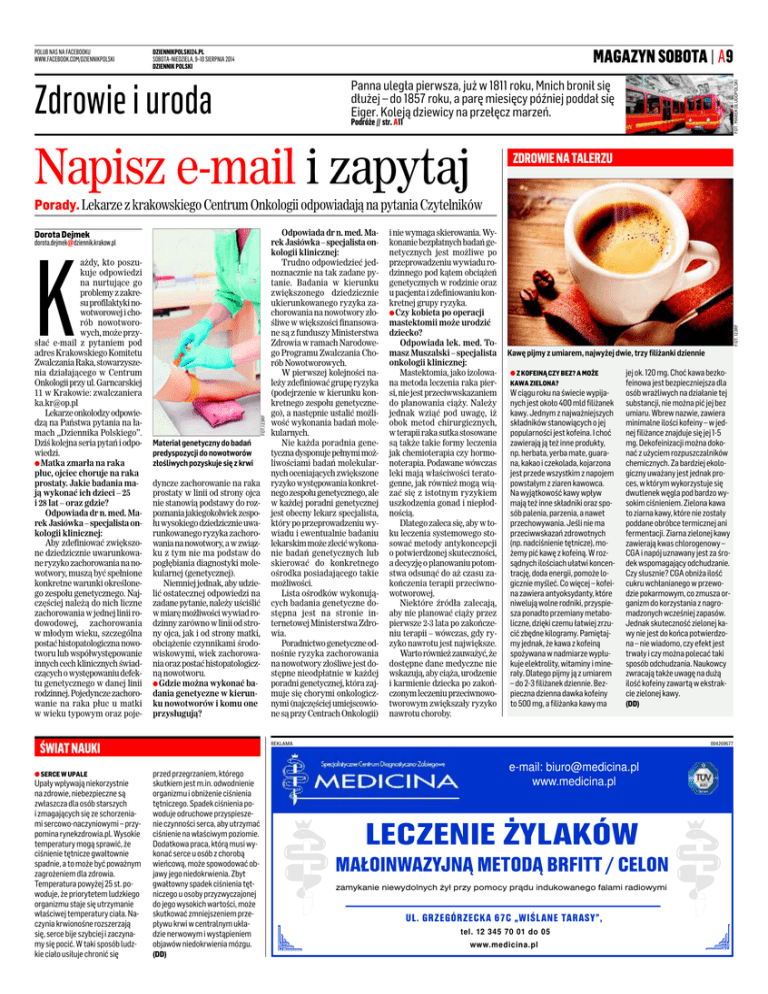 DZIENNIKPOLSKI24.PL SOBOTA–NIEDZIELA, 9–10 SIERPNIA 2014 DZIENNIK POLSKI MAGAZYN SOBOTA | A9 FOT. MAREK DŁUGOPOLSKI POLUB NAS NA FACEBOOKU WWW.FACEBOOK.COM/DZIENNIKPOLSKI Panna uległa pierwsza, już w 1811 roku, Mnich bronił się dłużej – do 1857 roku, a parę miesięcy później poddał się Eiger. Koleją dziewicy na przełęcz marzeń. Zdrowie i uroda Podróże // str. A11 Napisz e-mail i zapytaj ZDROWIE NA TALERZU Dorota Dejmek [email protected] ażdy, kto poszukuje odpowiedzi na nurtujące go problemy z zakresu profilaktyki nowotworowej i chorób nowotworowych, może przysłać e-mail z pytaniem pod adres Krakowskiego Komitetu Zwalczania Raka, stowarzyszenia działającego w Centrum Onkologii przy ul. Garncarskiej 11 w Krakowie: zwalczaniera [email protected] Lekarze onkolodzy odpowiedzą na Państwa pytania na łamach „Dziennika Polskiego”. Dziś kolejna seria pytań i odpowiedzi. A Matka zmarła na raka płuc, ojciec choruje na raka prostaty. Jakie badania mają wykonać ich dzieci – 25 i 28 lat – oraz gdzie? Odpowiada dr n. med. Marek Jasiówka – specjalista onkologii klinicznej: Aby zdefiniować zwiększone dziedzicznie uwarunkowane ryzyko zachorowania na nowotwory, muszą być spełnione konkretne warunki określonego zespołu genetycznego. Najczęściej należą do nich liczne zachorowania w jednej linii rodowodowej, zachorowania w młodym wieku, szczególna postać histopatologiczna nowotworu lub współwystępowanie innych cech klinicznych świadczących o występowaniu defektu genetycznego w danej linii rodzinnej. Pojedyncze zachorowanie na raka płuc u matki w wieku typowym oraz poje- FOT.123RF K Materiał genetyczny do badań predyspozycji do nowotworów złośliwych pozyskuje się z krwi dyncze zachorowanie na raka prostaty w linii od strony ojca nie stanowią podstawy do rozpoznania jakiegokolwiek zespołu wysokiego dziedzicznie uwarunkowanego ryzyka zachorowania na nowotwory, a w związku z tym nie ma podstaw do pogłębiania diagnostyki molekularnej (genetycznej). Niemniej jednak, aby udzielić ostatecznej odpowiedzi na zadane pytanie, należy uściślić w miarę możliwości wywiad rodzinny zarówno w linii od strony ojca, jak i od strony matki, obciążenie czynnikami środowiskowymi, wiek zachorowania oraz postać histopatologiczną nowotworu. A Gdzie można wykonać badania genetyczne w kierunku nowotworów i komu one przysługują? ŚWIAT NAUKI A SERCE W UPALE Upały wpływają niekorzystnie na zdrowie, niebezpieczne są zwłaszcza dla osób starszych i zmagających się ze schorzeniami sercowo-naczyniowymi – przypomina rynekzdrowia.pl. Wysokie temperatury mogą sprawić, że ciśnienie tętnicze gwałtownie spadnie, a to może być poważnym zagrożeniem dla zdrowia. Temperatura powyżej 25 st. powoduje, że priorytetem ludzkiego organizmu staje się utrzymanie właściwej temperatury ciała. Naczynia krwionośne rozszerzają się, serce bije szybciej i zaczynamy się pocić. W taki sposób ludzkie ciało usiłuje chronić się Odpowiada dr n. med. Marek Jasiówka – specjalista onkologii klinicznej: Trudno odpowiedzieć jednoznacznie na tak zadane pytanie. Badania w kierunku zwiększonego dziedzicznie ukierunkowanego ryzyka zachorowania na nowotwory złośliwe w większości finansowane są z funduszy Ministerstwa Zdrowia w ramach Narodowego Programu Zwalczania Chorób Nowotworowych. W pierwszej kolejności należy zdefiniować grupę ryzyka (podejrzenie w kierunku konkretnego zespołu genetycznego), a następnie ustalić możliwość wykonania badań molekularnych. Nie każda poradnia genetyczna dysponuje pełnymi możliwościami badań molekularnych oceniających zwiększone ryzyko występowania konkretnego zespołu genetycznego, ale w każdej poradni genetycznej jest obecny lekarz specjalista, który po przeprowadzeniu wywiadu i ewentualnie badaniu lekarskim może zlecić wykonanie badań genetycznych lub skierować do konkretnego ośrodka posiadającego takie możliwości. Lista ośrodków wykonujących badania genetyczne dostępna jest na stronie internetowej Ministerstwa Zdrowia. Poradnictwo genetyczne odnośnie ryzyka zachorowania na nowotwory złośliwe jest dostępne nieodpłatnie w każdej poradni genetycznej, która zajmuje się chorymi onkologicznymi (najczęściej umiejscowione są przy Centrach Onkologii) i nie wymaga skierowania. Wykonanie bezpłatnych badań genetycznych jest możliwe po przeprowadzeniu wywiadu rodzinnego pod kątem obciążeń genetycznych w rodzinie oraz u pacjenta i zdefiniowaniu konkretnej grupy ryzyka. A Czy kobieta po operacji mastektomii może urodzić dziecko? Odpowiada lek. med. Tomasz Muszalski – specjalista onkologii klinicznej: Mastektomia, jako izolowana metoda leczenia raka piersi, nie jest przeciwwskazaniem do planowania ciąży. Należy jednak wziąć pod uwagę, iż obok metod chirurgicznych, w terapii raka sutka stosowane są także takie formy leczenia jak chemioterapia czy hormonoterapia. Podawane wówczas leki mają właściwości teratogenne, jak również mogą wiązać się z istotnym ryzykiem uszkodzenia gonad i niepłodnością. Dlatego zaleca się, aby w toku leczenia systemowego stosować metody antykoncepcji o potwierdzonej skuteczności, a decyzję o planowaniu potomstwa odsunąć do aż czasu zakończenia terapii przeciwnowotworowej. Niektóre źródła zalecają, aby nie planować ciąży przez pierwsze 2-3 lata po zakończeniu terapii – wówczas, gdy ryzyko nawrotu jest największe. Warto również zauważyć, że dostępne dane medyczne nie wskazują, aby ciąża, urodzenie i karmienie dziecka po zakończonym leczeniu przeciwnowotworowym zwiększały ryzyko nawrotu choroby. FOT. 123RF Porady. Lekarze z krakowskiego Centrum Onkologii odpowiadają na pytania Czytelników Kawę pijmy z umiarem, najwyżej dwie, trzy filiżanki dziennie A Z KOFEINĄ CZY BEZ? A MOŻE KAWA ZIELONA? W ciągu roku na świecie wypijanych jest około 400 mld filiżanek kawy. Jednym z najważnie