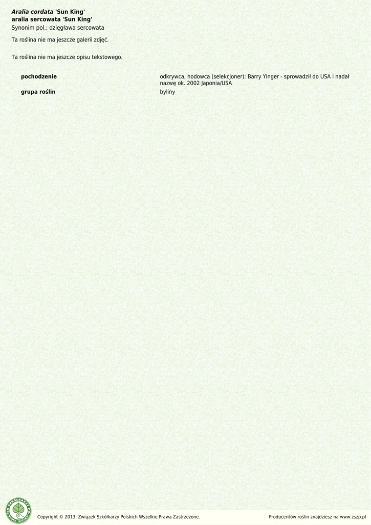 Aralia cordata 'Sun King' aralia sercowata 'Sun King' Synonim pol.: dzięgława sercowata Ta roślina nie ma jeszcze galerii zdjęć. Ta roślina nie ma jeszcze opisu tekstowego. pochodzenie odkrywca, hodowca (selekcjoner): Barry Yinger - sprowadził do USA i nadał nazwę ok. 2002 Japonia/USA grupa roślin byliny Copyright © 2013. Związek Szkółkarzy Polskich Wszelkie Prawa Zastrzeżone. Producentów roślin znajdziesz na www.zszp.pl