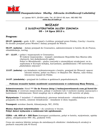 Duszpasterstwo Służby Zdrowia Archidiecezji Lubelskiej ul. Lipowa 16/11, 20-024 Lublin, Tel.: 81 534 41 00, kom.: 663 983 783 www.dsz.oil.lublin.pl WCZASY Z DUSZPASTERSTWEM SŁUŻBY ZDROWIA 05 – 14 lipca 2013 r. Program: 05.07. (piątek) – godz. 6.00 – wyjazd z Lublina; przejazd przez Polskę, Czechy i Austrię. Po drodze przejazd przez Wiedeń i dalszy przejazd do Włoch. 06.07. (sobota) - dalszy przejazd do Cesenatico, zakwaterowanie w hotelu Ile de France, obiadokolacja, nocleg. 07 - 12.07. – pobyt i wypoczynek w Cesenatico. W trakcie wypoczynku – wyjazd i zwiedzanie Republiki San Marino (dla chętnych, bez dodatkowych opłat). Pobyt w Mirabilandii – parku rozrywki z niezwykłymi atrakcjami: m.in. najwyższą w Europie kolejką, karuzelami, zjeżdżalniami i 90-metrowym „diabelskim młynem”. 13.07. (sobota) – po śniadaniu wykwaterowanie z hotelu, przejazd do Wenecji: spacer ulicami miasta, pobyt na Placu i w Bazylice Św. Marka, czas wolny; wieczorem wyjazd do Polski. 14.07. (niedziela) – przyjazd do Lublina w godzinach popołudniowych. Podczas wczasów będzie możliwość uczestniczenia w codziennej Mszy Świętej. Zakwaterowanie: Hotel *** Ile de France (http://wakacjewewloszech.com.pl/hotel-ilede-france), w centrum miejscowości, pokoje 2 osobowe lub 3 osobowe (należy zaznaczyć) z łazienkami i telewizorami. Hotel znajduje się w odległości ok. 100 metrów od plaży. Wyżywienie: 7 śniadań i 7 obiadokolacji: pierwsze świadczenie – obiadokolacja w dniu przyjazdu do hotelu, ostatnie świadczenie – śniadanie w dniu wyjazdu. Transport: autokar (barek, klimatyzacja, WC, DVD) Można dojechać indywidualnie – do ustalenia w biurze. Pobyt dzieci wyłącznie z rodzicami lub opiekunami. CENA – ok. 600 zł + 300 Euro (transport autokarem, pobyt w hotelu, wyżywienie, opiekę pilota, ubezpieczenie NW i KL, podatek VAT) Cena nie zawiera biletów wstępu do zwiedzanych obiektów i dodatkowych atrakcji w parkach rozrywki (ok.40 Euro) Zapisy: Zaliczka 200 Euro w Biurze Podróży SUPER-TRAMP: Lublin, ul. Ogrodowa 8/1, Tel.: 81 532 30 00 – czynne od poniedziałku do piątku w godz. 9.00 – 16.00 Informacje dodatkowe: Ks. Wojciech Iwanicki – duszpasterz Służby Zdrowia, Kapelan COZL im. Św. Jana z Dukli Tel.: 663 983 783 i na www.dsz.oil.lublin.pl