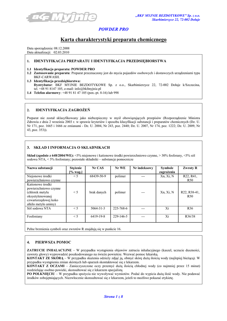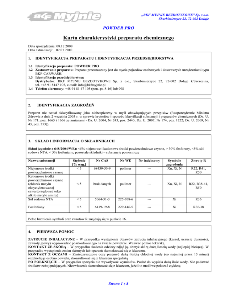 „BKF MYJNIE BEZDOTYKOWE” Sp. z o.o. Skarbimierzyce 22, 72-002 Dołuje POWDER PRO Karta charakterystyki preparatu chemicznego Data sporządzenia: 08.12.2008 Data aktualizacji: 02.03.2010 1. IDENTYFIKACJA PREPARATU I IDENTYFIKACJA PRZEDSIĘBIORSTWA 1.1 Identyfikacja preparatu: POWDER PRO 1.2 Zastosowanie preparatu: Preparat przeznaczony jest do mycia pojazdów osobowych i dostawczych urządzeniami typu BKF-CARWASH. 1.3 Identyfikacja przedsiębiorstwa: Dystrybutor: BKF MYJNIE BEZDOTYKOWE Sp. z o.o., Skarbimierzyce 22, 72-002 Dołuje k/Szczecina, tel. +48 91 8147 105, e-mail: [email protected] 1.4 Telefon alarmowy: +48 91 81 47 105 (pon.-pt. 8-16) lub 998 2. IDENTYFIKACJA ZAGROśEŃ Preparat nie został sklasyfikowany jako niebezpieczny w myśl obowiązujących przepisów (Rozporządzenie Ministra Zdrowia z dnia 2 września 2003 r. w sprawie kryteriów i sposobu klasyfikacji substancji i preparatów chemicznych (Dz. U. Nr 171, poz. 1665 i 1666 ze zmianami - Dz. U. 2004, Nr 243, poz. 2440; Dz. U. 2007, Nr 174, poz. 1222; Dz. U. 2009, Nr 43, poz. 353)). 3. SKŁAD I INFORMACJA O SKŁADNIKACH Skład (zgodnie z 648/2004/WE): <5% niejonowe i kationowe środki powierzchniowo czynne, > 30% fosforany, <5% sól sodowa NTA, < 5% fosfoniany; pozostałe składniki – substancje pomocnicze Nazwa substancji Niejonowe środki powierzchniowo czynne Kationowe środki powierzchniowo czynne (chlorek metylu oksyetylenowanej czwartorzędowej koko alkilo metylo aminy) Sól sodowa NTA StęŜenie [% wag.] <5 Nr CAS Nr WE Nr indeksowy 68439-50-9 polimer <5 brak danych <5 <5 Fosfoniany Zwroty R --- Symbole zagroŜenia Xn, Xi, N polimer --- Xn, Xi, N R22, R38-41, R50 5064-31-3 225-768-6 --- Xi R36 6419-19-8 229-146-5 --- Xi R36/38 R22, R41, R50 Pełne brzmienia symboli oraz zwrotów R znajdują się w punkcie 16. 4. PIERWSZA POMOC ZATRUCIE INHALACYJNE – W przypadku wystąpienia objawów zatrucia inhalacyjnego (kaszel, uczucie duszności, zawroty głowy) wyprowadzić poszkodowanego na świeŜe powietrze. Wezwać pomoc lekarską. KONTAKT ZE SKÓRĄ – W przypadku skaŜenia odzieŜy zdjąć ją, obmyć skórę duŜą ilością wody (najlepiej bieŜącą). W przypadku wystąpienia zmian skórnych lub oparzeń skontaktować się z lekarzem. KONTAKT Z OCZAMI – Zanieczyszczone oczy przemyć duŜą ilością chłodnej wody (co najmniej przez 15 minut) rozdzielając osobno powieki, skonsultować się z lekarzem specjalistą PO POŁKNIĘCIU – W przypadku spoŜycia nie wywoływać wymiotów. Podać do wypicia duŜą ilość wody. Nie podawać środków zobojętniających. Niezwłocznie skonsultować się z lekarzem, jeŜeli to moŜliwe pokazać etykietę. Strona 1 z 8 „BKF MYJNIE BEZDOTYKOWE” Sp. z o.o. Skarbimierzyce 22, 72-002 Dołuje POWDER PRO 5. POSTĘPOWANIE W PRZYPADKU POśARU PRODUKT NIEPALNY. ŚRODKI GAŚNICZE WŁAŚCIWE ZE WZGLĘDU NA RODZAJ PREPARATU: poŜary w obecności preparatu gasić środkami gaśniczymi odpowiednimi do palącego się otoczenia – woda, piana. ŚRODKI GAŚNICZE, KTÓRYCH NIE WOLNO UśYWAĆ ZE WZGLĘDÓW BEZPIECZEŃSTWA: nie są znane środki gaśnicze, których nie wolno stosować. SZCZEGÓLNE ZAGROśENIA: preparat niepalny. ŚRODKI OCHRONY INDYWIDUALNEJ DLA STRAśAKÓW: stosować środki izolujące drogi oddechowe i ubranie odporne na działanie substancji chemicznych. DODATKOWE INFORMACJE: W przypadku poŜaru zawiadomić osoby znajdujące się w pobliŜu o poŜarze, usunąć z obszaru zagroŜenia osoby postronne, powiadomić StraŜ PoŜarną. JeŜeli to moŜliwe usunąć zbiorniki z preparatem z dala od działania ognia i wysokiej temperatury. JeŜeli to niemoŜliwe wówczas chłodzić zbiorniki znajdujące się w pobliŜu ognia poprzez spryskiwanie strumieniem wody. Pozostałości po spaleniu muszą zostać całkowicie usunięte. 6. POSTĘPOWANIE W PRZYPADKU NIEZAMIERZONEGO UWOLNIENIA DO ŚRODOWISKA ŚRODKI OCHRONY OSOBISTEJ: odzieŜ ochronna; aparat izolujący drogi oddechowe; rękawice ochronne; okulary ochronne. Unikać bezpośredniego kontaktu ze skórą i oczami; zapewnić odpowiednią wentylację. POSTĘPOWANIE: W przypadku niezamierzonego uwolnienia się preparatu do środowiska powiadomić o awarii oraz usunąć źródła zapłonu. Zabezpieczyć studzienki ściekowe poprzez ich obwałowanie, nie dopuścić do przedostania się preparatu do wód powierzchniowych i gruntowych; unikać bezpośredniego kontaktu z uwalniającą się substancją. O ile to moŜliwe zlikwidować wyciek (zamknąć dopływ cieczy, uszczelnić, uszkodzone opakowanie umieścić w szczelnym opakowaniu ochronnym). Podczas duŜego wycieku miejsce gromadzenia się cieczy obwałować, zebraną ciecz odpompować. Małe ilości rozlanego preparatu posypać niepalnym materiałem chłonnym (piasek, ziemia, trociny, ziemia okrzemkowa, zmielony wapień), a następnie umieścić w oznakowanym, zamykanym pojemniku – przekazać do utylizacji. Zanieczyszczoną powierzchnię spłukać wodą. 7. POSTĘPOWANIE Z PREPARATEM I JEGO MAGAZYNOWANIE 7.1. POSTĘPOWANIE Z PREPARATEM Podczas pracy z preparatem zalecana jest ostroŜność. Wymagane stosowanie odpowiednich środków ochrony indywidualnej – patrz punkt 8. Mieszać preparat wyłącznie z wodą. Nie mieszać preparatu z innymi preparatami chemicznymi. Osoby ze skłonnością do alergii skórnej lub układu oddechowego nie powinny mieć kontaktu z preparatem. Unikać naraŜenia – przed uŜyciem zapoznać się z instrukcją stosowania. Po zastosowaniu pojemnik szczelnie zamknąć, przechowywać z dala od osób nieupowaŜnionych. Podczas pracy z preparatem zapewnić odpowiednią wentylację pomieszczenia w celu uniknięcia zatrucia inhalacyjnego. 7.2. MAGAZYNOWANIE Preparat przechowywać wyłącznie w oryginalnych opakowaniach z tworzywa sztucznego (polietylen o wysokiej jakości HDPE). Nie przelewać do opakowań zastępczych. Pojemniki z preparatem przechowywać w suchym pomieszczeniu szczelnie zamknięte, w temperaturze +5 ÷ 30° C ze sprawną wentylacją