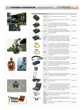 8.2 Narzędzia samodzielne – napęd akumulatorowy 86 Narzędzia akumulatorowe – akcesoria Akumulator 24V, NiCd, chłodzenie powietrzne, pojemność 2,4Ah 150.553.014 Akumulator 24V, NiMH, chłodzenie powietrzne, pojemność 3,0Ah i dłuższy czas pracy 150.553.050 Ładowarka 110-120V, przystosowana do ładowania akumulatorów 2,4Ah i 3,0Ah. Wyposażona w wentylator zmniejszający czas 150.553.007 ładowania i wydłużający trwałość akumulatora. Pełne ładowanie w ciągu jednej godziny. Ładowarka 220-230V, przystosowana do ładowania akumulatorów 2,4Ah i 3,0Ah. Wyposażona w wentylator zmniejszający czas 150.553.008 ładowania i wydłużający trwałość akumulatora. Pełne ładowanie w ciągu jednej godziny. Ładowarka samochodowa 12V, przystosowana do ładowania akumulatorów 2,4Ah i 3,0Ah. Wygodne ładowanie akumulatora z instalacji samochodowej 12V. Wyposażona we wtyk do gniazda zapalniczki samochodowej i wentylator zmniejszający czas ładowania i wydłużający trwałość akumulatora. Pełne ładowanie w ciągu jednej godziny. Kabel zasilający 12-24V, długość 5 m. Umożliwia nieograniczony czas pracy narzędzia przy zasilaniu z instalacji samochodowej. Wyposażony 150.553.045 we wtyk po stronie narzędzia oraz zaciski krokodylkowe do podłączenia do źródła zasilania (np. akumulator samochodu). Kabel zasilający 24V, długość 10 m. Umożliwia nieograniczony czas pracy narzędzia przy zasilaniu z instalacji samochodowej. Wyposażony we wtyk po stronie narzędzia oraz zaciski krokodylkowe do 150. 553 .052 podłączenia do źródła zasilania (np. akumulator samochodu). Ze względu na długość, kabel zalecany do zasilania ze źródła o napięciu 24V. Pas nośny Długość ±1,5 m, szerokość 25 mm. Przeznaczony do bezpiecznego noszenia narzędzia. Wyposażony w miękką podkładkę 150.553.055 oraz zatrzask umożliwiający podczepienie narzędzia. Torba transportowa Do przechowywania narzędzia, zapasowych akumulatorów i akcesoriów. Wykonana z odpornego na zużycie i niechłonącego wody nylonu, posiada wzmocnione dno i pasy zapinane na rzepy do mocowania narzędzia. Futerał akumulatora Do przechowywania jednego akumulatora. Wyposażony w pasek do przenoszenia; może być zawieszony na pasie ratownika. 150.553.113 Wykonany z mocnego materiału i zamykany na rzep. Rama nośna Mocna rama nośna umożliwiająca przenoszenie narzędzia oraz 2 zapasowych akumulatorów. Umożliwia wciąganie lub opuszczanie narzędzia (np. w wykopie lub ze śmigłowca). Uprząż trans- Do łatwego przenoszenia narzędzia na duże odległości lub do oddalonych miejsc. portowa Walizka Pelican® 150.553.006 150.553.054 150.553.048 150.553.115 Solidna, bardzo wytrzymała walizka transportowa do przewożenia i przechowywania narzędzia akumulatorowego. Wykonana z wytrzymałego i lekkiego tworzywa ABS. Wodoodporna, 150.553.053 pływająca i utrzymująca wewnątrz stałe ciśnienie, niezależnie od ciśnienia zewnętrznego. Przechowuje narzędzie, 2 zapasowe akumulatory, łańcuchy ciągnące i inne akcesoria. Zestaw adaptorów Zawiera łańcuchy o długości 1,5 i 3,0 m oraz 2 haki skracające. Przeznaczone tylko do narzędzia kombi model BCT 4120; nie do ciągnięcia dla nożyc model BCU 4010 GP. 150.582.152 Zestaw Zakładane na końcówki ramion, wyposażone w haki. Przeznałączników do czone tylko do narzędzia BCT 4120; nie dla nożyc model BCU 4010 GP. ciągnięcia 150.582.551 Zestaw do ciągnięcia Łańcuchy (150.582.152) oraz adaptory (150.582.551) w waliz150.582.028 ce transportowej.