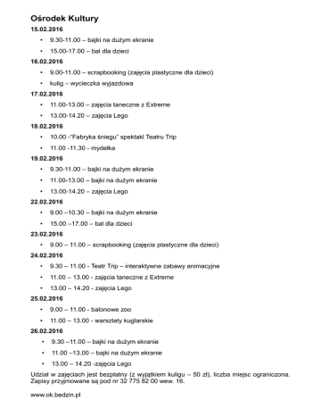 Ośrodek Kultury 15.02.2016 • 9.30-11.00 – bajki na dużym ekranie • 15.00-17.00 – bal dla dzieci 16.02.2016 • 9.00-11.00 – scrapbooking (zajęcia plastyczne dla dzieci) • kulig – wycieczka wyjazdowa 17.02.2016 • 11.00-13.00 – zajęcia taneczne z Extreme • 13.00-14.20 – zajęcia Lego 18.02.2016 • 10.00 -“Fabryka śniegu” spektakl Teatru Trip • 11.00 -11.30 - mydełka 19.02.2016 • 9.30-11.00 – bajki na dużym ekranie • 11.00-13.00 – bajki na dużym ekranie • 13.00-14.20 – zajęcia Lego 22.02.2016 • 9.00 –10.30 – bajki na dużym ekranie • 15.00 –17.00 – bal dla dzieci 23.02.2016 • 9.00 – 11.00 – scrapbooking (zajęcia plastyczne dla dzieci) 24.02.2016 • 9.30 – 11.00 - Teatr Trip – interaktywne zabawy animacyjne • 11.00 – 13.00 - zajęcia taneczne z Extreme • 13.00 – 14.20 - zajęcia Lego 25.02.2016 • 9.00 – 11.00 - balonowe zoo • 11.00 – 13.00 - warsztaty kuglarskie 26.02.2016 • 9.30 –11.00 – bajki na dużym ekranie • 11.00 –13.00 – bajki na dużym ekranie • 13.00 – 14.20 -zajęcia Lego Udział w zajęciach jest bezpłatny (z wyjątkiem kuligu – 50 zł), liczba miejsc ograniczona. Zapisy przyjmowane są pod nr 32 775 82 00 wew. 16. www.ok.bedzin.pl