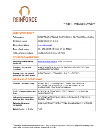 PROFIL PRACODAWCY WIZYTÓWKA FIRMY Pełna nazwa REINFORCE SPÓŁKA Z OGRANICZONĄ ODPOWIEDZIALNOŚCIĄ Skrócona nazwa REINFORCE SP. Z O.O. Strona internetowa www.reinforce.pl Dane teleadresowe UL. KOŚCIUSZKI 71/305, 87-100 TORUŃ Krótka charakterystyka OUTSOURCING CALL CENTER REKRUTACJA DO FIRMY Bezpośredni kontakt do działu HR [email protected], nr tel. 510004557 Sposoby i procedury rekrutacji ANALIZA NADESŁANYCH CV, ROZMOWA REKRUTACYJNA, ASSESSMENT CENTER Adresy stron, na których pojawiają się oferty pracy INFOPRACA.PL, PRACUJ.PL, OLX.PL, LENTO.PL INFORMACJE DODATKOWE Filozofia / Wartości firmy REINFORCE TO PRZEDE WSZYSTKIM PARTNERSKIE I EKOLOGICZNE PODEJŚCIE DO BIZNESU I RELACJI Z PARTNERAMI ORAZ PRACOWNIKAMI. Profil / obszar działalności firmy REALIZACJA PROJEKTÓW SPRZEDAŻOWYCH W RUCHU WYCHODZĄCYM Najchętniej zatrudniamy absolwentów kierunków STUDENCI WSZYSTKICH KIERUNKÓW SĄ MILE WIDZIANI W NASZEJ FIRMIE Sylwetka idealnego kandydata KOMUNIKATYWNY, KREATYWNY, ZAANGAŻOWANY W PRACĘ Ścieżki kariery w firmie TAK prosimy o wstawienie do formularza LOGO firmy (w miejscu logo Biura Karier) oraz dołączenie osobnego pliku graficznego (dłuższy bok nie powinien przekraczać 200 px)