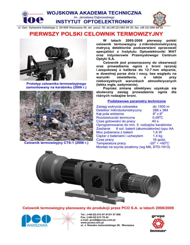 WOJSKOWA AKADEMIA TECHNICZNA im. Jarosława Dąbrowskiego INSTYTUT OPTOELEKTRONIKI ul. Gen. Sylwestra Kaliskiego 2, 00-908 Warszawa 49, skr. poczt. 50, tel.(48 22) 683 94 30, fax. (48 22) 666 89 50 PIERWSZY POLSKI CELOWNIK TERMOWIZYJNY Prototyp celownika termowizyjnego zamontowany na karabinku (2006 r.) W latach 2005-2008 pierwszy polski celownik termowizyjny z mikrobolometryczną matrycą detektorów podczerwieni opracowali specjaliści z Instytutu Optoelektroniki WAT oraz inżynierowie Przemysłowego Centrum Optyki S.A. Celownik jest przeznaczony do obserwacji oraz prowadzenia ognia z broni ręcznej i zespołowej o kalibrze do 12.7 mm włącznie, w dowolnej porze dnia i nocy, bez względu na warunki oświetlenia, a także przy niekorzystnych warunkach atmosferycznych (lekka mgła, zadymienie). Poprzez zmianę obiektywu uzyskuje się skuteczny zasięg prowadzenia ognia dla różnych rodzajów broni. Podstawowe parametry techniczne Celownik termowizyjny CTS-1 (2008 r.) Zasięg wykrycia człowieka do 1500 m Detektor mikrobolometryczny 288 x 384 Kąt pola widzenia 80 x 60 Rozdzielczość termiczna 0.090C Czas gotowości do pracy 40 s. Oprogramowanie do min. 5. rodzajów karabinów Zasilanie 6 szt. baterii (akumulatorów) typu AA Moc pobierana z baterii 1.6 W Ciężar z bateriami i uchwytem 1.4 kg Czas pracy 16 godz. Temperatura pracy -350 ÷ +600C Montaż na szynie picatinny (wg MIL STD-1913) Celownik termowizyjny planowany do produkcji przez PCO S.A. w latach 2008/2009 Tel.: (+48-22) 613 81 81/51 57 506 Fax: (+48-22) 613 78 44 e-mail: [email protected] www.pcosa.com.pl ul. J. Nowaka Jeziorańskiego 28, Warszawa