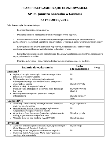 PLAN PRACY SAMORZĄDU UCZNIOWSKIEGO SP im. Janusza Korczaka w Gostomi na rok 2011/2012 Cele Samorządu Uczniowskiego: · Reprezentowanie ogółu uczniów. · Działanie na rzecz społeczności uczniowskiej i obrona jej praw. · Uczestnictwo uczniów w samodzielnym rozwiązywaniu własnych problemów oraz partnerstwo w stosunkach uczniów z nauczycielami w realizacji celów wychowawczych szkoły. · Rozwijanie demokratycznych form współżycia, współdziałania uczniów oraz przyjmowania współodpowiedzialności za jednostkę i grupę. · Kształtowanie umiejętności zespołowego działania, wyrabianie samokontroli, samooceny i zdyscyplinowania uczniów. · Dbanie o dobre imię i honor szkoły, kultywowanie i wzbogacanie jej tradycji. Zadania do wykonania: Osoby odpowiedzialne WRZESIEŃ Wybory Zarządu Samorządu Uczniowskiego SP im. Janusza Korczaka w Gostomi Wykonanie gazetki informacyjnej na temat wewnątrzszkolnego systemu oceniania oraz praw i obowiązków ucznia Udział w akcji „Sprzątanie Świata” Piękna Polska Złota Jesień- dekoracja klas, dekoracja korytarza Obchody Dnia Chłopaka – przerwy z muzyką młodzieżową SU SU SU, n-l przyrody SU, wychowawcy klas 1-6 SU, n-le pełniący dyżur PAŹDZIERNIK Światowy Dzień Ochrony Zwierząt- zbiórka karmy dla zwierząt ze schroniska Dzień Komisji Edukacji Narodowej– wykonanie i wręczenie kartek pracownikom szkoły Organizacja Dnia Zdrowego Żywienia – oplakatowanie szkoły, wykonanie zdrowych kanapek Wieczór filmowy pod hasłem: HALLOWEEN SU, p. Żuprańska SU SU, n-l przyrody SU, n-l jęz. ang. LISTOPAD Zapalenie znicza na grobach nieznanych, opuszczonych – Dzień Wszystkich Świętych, Zaduszki Światowy Dzień bez papierosa - konkurs na plakat Światowy Dzień Pluszowego Misia- każdy przynosi swojego misia do szkoły SU, n-l religii SU Uwagi Andrzejki - wróżby, kabały, dyskoteka szkolna SU GRUDZIEŃ Zbiórka żywności dla ubogich Ogłoszenie konkursu na noworoczny wystrój klasy oraz bożonarodzeniową kartkę Mikołajki Wigilia- wręczenie kartek pracownikom szkoły, przygotowanie plakatu świątecznego z życzeniami dla Rady Pedagogicznej i dla uczniów naszej szkoły, rozstrzygnięcie konkursów na wystrój klasy i wykonanie kartki SU SU SU STYCZEŃ Zimowa dekoracja szkoły Dzień Sprzątania Biurka Dzień Wegetarian- ogólnoszkolne jedzenie warzyw i owoców Dzień Babci i Dziadka-gazetka okolicznościowa Zabawy na śniegu - integracja w społeczności szkolnej, konkursy na oryginalny pojazd śnieżny, wyścigi drużyn Dyskoteka i bal karnawałowy SU, wychowawcy klas 1-6 Dzień Pocztówki do Przyjaciela Poczta Walentynkowa, ubieramy się na czerwono, dekoracja szkoły Dyskoteka Walentynkowa Tłusty Czwartek- jemy pączki SU SU, n-l przyrody SU, n-l w-fu SU, wychowawcy klas 1-6 LUTY SU, wychowawcy klas 4-6 MARZEC Tydzień działań przeciwko przemocy Dzień Kobiet- dzień prawienia komplementów Dzień Mężczyzn- Dzień krawata i muszki- konkurs na najlepiej ubraną klasę Powitanie wiosny- konkurs na najzabawniejszą Marzannę, dekoracja szkoły i klas Konkurs na Miss Panią Wiosnę Międzyklasowy konkurs na najpiękniejszą pisankę wielkanocną lub stroik świąteczny Polowanie na pisanki- konkurs miedzy klasowy na długiej przerwie SU SU, wychowawcy klas 1-6 SU SU, n-le pełniący dyżur, n-l w-fu KWIECIEŃ Prima Aprilis- ubieramy się na lewą stronę, dzień puszczania baniek mydlanych Wielkanoc- kartka dla nauczycieli i pracowników szkoły Śmigus dyngus- bitwa na wodę, impreza integracyjna uczniów (do przedyskutowania) Obchody Dnia Ziemi- ubieramy się na zielono; wykonanie gazetki okolicznościowej Organizacja Dnia Zdrowego Żywienia – konkurs na SU SU SU, wychowawcy, n-le pełniący dyżur SU, n-l przyrody, przepis na sałatkę; degustacja przygotowanych sałatek na korytarzu szkolnym wychowawcy klas 3-6 Święto Flagi, gazetka okolicznościowa Międzynarodowy Dzień Rodziny- karta praw i obowiązków dziecka – informacja na gazetce samorządu uczniowskiego Dzień Dobrych Wiadomości Dzień Matki- wykonanie laurek dla mam, gazetka okolicznościowa SU MAJ SU CZERWIEC Międzynarodowy Dzień Dziecka- włączenie się w przygotowanie imprez sportowych Dzień Ojca– gazetka okolicznościowa Podsumowanie pracy SU w roku szkolnym 2011/2012 Przygotowanie wniosków do realizacji w przyszłym roku szkolnym Sporządzenie sprawozdania z pracy Samorządu w roku szkolnym 2011/2012 Bezpieczne wakacje- Co należy wiedzieć?- gazetka okolicznościowa SU CAŁY ROK Dbałość o wystrój korytarza szkolnego Gazetka informacyjna Pomoc w dyżurowaniu nauczycielom (klasa 4,5,6 zmieniają się co miesiąc, po 2-ch ucz. Zmienia się kolejno wg listy w dzienniku codziennie) Promowanie „kodeksu kulturalnego ucznia” Praca na rzecz szkoły 13-go każdego miesiąca: „kolorowo mi”- uczniowie, którzy ubiorą się zgodnie z obowiązującym kolorem nie będą pytani. Imprezy organizowane na przerwach uzależnione od pogody: o Dzień gry w zośkę o Dzień gry w klasy o Dzień grania w gumę o Dzień skakania na skakance o Dzień lepienia bałwana itp. Opiekun Samorządu Uczniowskiego: JOANNA SZPYNDA Osoba koordynująca – Opiekun SU Osoby współpracującewszyscy nauczyciele