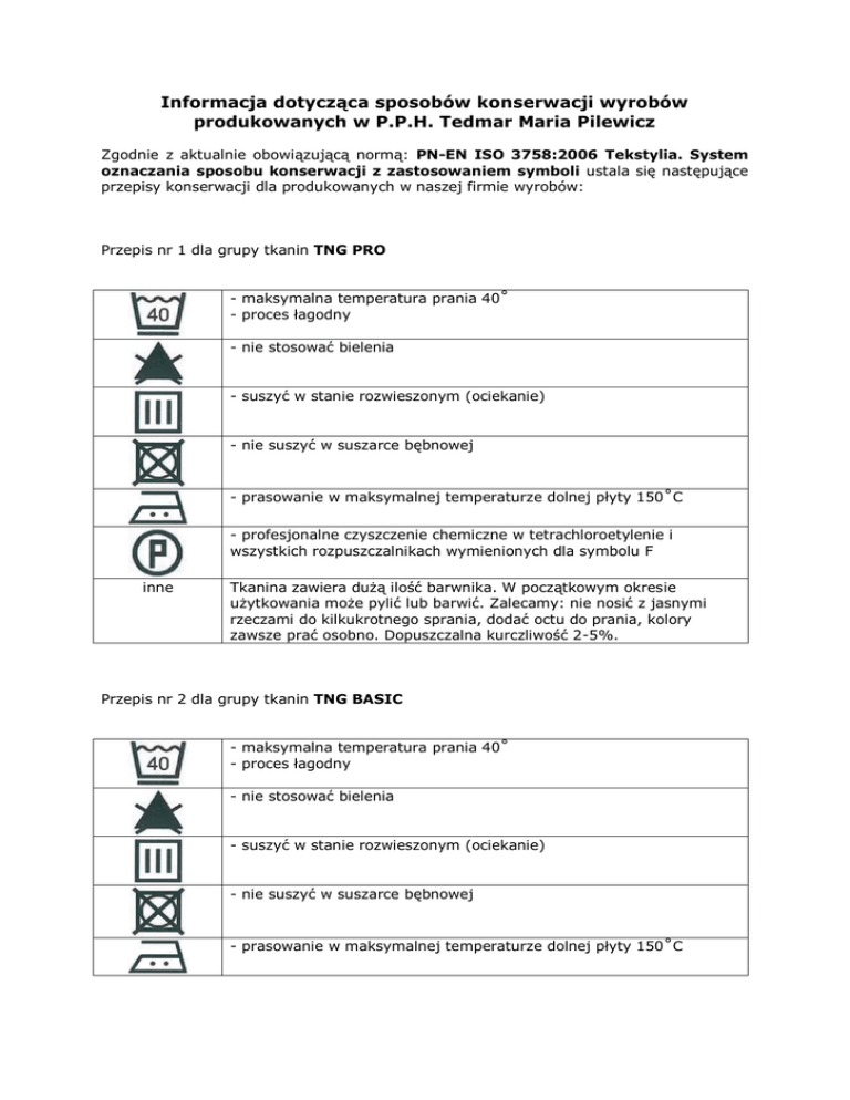 Informacja dotycząca sposobów konserwacji wyrobów produkowanych w P.P.H. Tedmar Maria Pilewicz Zgodnie z aktualnie obowiązującą normą: PN-EN ISO 3758:2006 Tekstylia. System oznaczania sposobu konserwacji z zastosowaniem symboli ustala się następujące przepisy konserwacji dla produkowanych w naszej firmie wyrobów: Przepis nr 1 dla grupy tkanin TNG PRO - maksymalna temperatura prania 40˚ - proces łagodny - nie stosować bielenia - suszyć w stanie rozwieszonym (ociekanie) - nie suszyć w suszarce bębnowej - prasowanie w maksymalnej temperaturze dolnej płyty 150˚C - profesjonalne czyszczenie chemiczne w tetrachloroetylenie i wszystkich rozpuszczalnikach wymienionych dla symbolu F inne Tkanina zawiera dużą ilość barwnika. W początkowym okresie użytkowania może pylić lub barwić. Zalecamy: nie nosić z jasnymi rzeczami do kilkukrotnego sprania, dodać octu do prania, kolory zawsze prać osobno. Dopuszczalna kurczliwość 2-5%. Przepis nr 2 dla grupy tkanin TNG BASIC - maksymalna temperatura prania 40˚ - proces łagodny - nie stosować bielenia - suszyć w stanie rozwieszonym (ociekanie) - nie suszyć w suszarce bębnowej - prasowanie w maksymalnej temperaturze dolnej płyty 150˚C - profesjonalne czyszczenie chemiczne w tetrachloroetylenie i wszystkich rozpuszczalnikach wymienionych dla symbolu F Przepis nr 3 dla grupy tkanin TNG LIGHT - maksymalna temperatura prania 40˚ - proces łagodny - nie stosować bielenia - suszyć w stanie rozwieszonym (ociekanie) - nie suszyć w suszarce bębnowej - prasowanie w maksymalnej temperaturze dolnej płyty 150˚C - profesjonalne czyszczenie chemiczne w tetrachloroetylenie i wszystkich rozpuszczalnikach wymienionych dla symbolu F inne Tkanina zawiera dużą ilość barwnika. W początkowym okresie użytkowania może pylić lub barwić. Zalecamy: nie nosić z jasnymi rzeczami do kilkukrotnego sprania, dodać octu do prania, kolory zawsze prać osobno. Dopuszczalna kurczliwość 2-5%. Przepis nr 4 dla grupy tkanin TNG LIGHT KOLOR - maksymalna temperatura prania 40˚ - proces łagodny - nie stosować bielenia - suszyć w stanie rozwieszonym (ociekanie) - nie suszyć w suszarce bębnowej - prasowanie w maksymalnej temperaturze dolnej płyty 150˚C - profesjonalne czyszczenie chemiczne w tetrachloroetylenie i wszystkich rozpuszczalnikach wymienionych dla symbolu F inne Tkanina zawiera dużą ilość barwnika. W początkowym okresie użytkowania może pylić lub barwić. Zalecamy: nie nosić z jasnymi rzeczami do kilkukrotnego sprania, dodać octu do prania, kolory zawsze prać osobno. Dopuszczalna kurczliwość 2-5%. Przepis nr 5 dla grupy tkanin TNG SHIRT - maksymalna temperatura prania 40˚ - proces łagodny - nie stosować bielenia - suszyć w stanie rozwieszonym (ociekanie) - nie suszyć w suszarce bębnowej - prasowanie w maksymalnej temperaturze dolnej płyty 150˚C - profesjonalne czyszczenie chemiczne w tetrachloroetylenie i wszystkich rozpuszczalnikach wymienionych dla symbolu F inne Dopuszczalna kurczliwość 4%. Przepis nr 6 dla grupy tkanin STRETCH - maksymalna temperatura prania 30˚ - nie stosować bielenia - nie suszyć w suszarce bębnowej - prasowanie w maksymalnej temperaturze dolnej płyty 110˚C - nie czyścić chemicznie inne tkanina elektrostatyczna, płukać w płynie zmiękczającym Przepis nr 7 dla grupy tkanin ELANOWISKOZA (wszystkie wyroby oprócz żakietów) - maksymalna temperatura prania 30˚ - nie stosować bielenia - suszyć w stanie rozłożonym na płasko - nie suszyć w suszarce bębnowej - prasowanie w maksymalnej temperaturze dolnej płyty 110˚C - nie czyścić chemicznie inne tkanina elektrostatyczna, płukać w płynie zmiękczającym Przepis nr 8 dla grupy tkanin ELANOWISKOZA (żakiety) - profesjonalne czyszczenie chemiczne w tetrachloroetylenie i wszystkich rozpuszczalnikach wymienionych dla symbolu F - nie stosować bielenia - nie suszyć w suszarce bębnowej - prasowanie w maksymalnej temperaturze dolnej płyty 110˚C Przepis nr 9 dla grupy tkanin ELANOWEŁNA - profesjonalne czyszczenie chemiczne w tetrachloroetylenie i wszystkich rozpuszczalnikach wymienionych dla symbolu F - nie stosować bielenia - nie suszyć w suszarce bębnowej - prasowanie w maksymalnej temperaturze dolnej płyty 110˚C Przepis nr 10 dla grupy tkanin SKY - czyścić mokrą szmatką z niewielką ilością mydła - nie stosować bielenia - nie suszyć w suszarce bębnowej - nie prasować Przepis nr 11 dla grupy tkanin PEPITA LUX - maksymalna temperatura prania 40˚ - proces łagodny - nie stosować bielenia - suszyć w stanie rozwieszonym (ociekanie) - nie suszyć w suszarce bębnowej - prasowanie w maksymalnej temperaturze dolnej płyty 150˚C - profesjonalne czyszczenie chemiczne w tetrachloroetylenie i wszystkich rozpuszczalnikach wymienionych dla symbolu F inne Dopuszczalna kurczliwość 2-5%. Przepis nr 12 dla grupy tkanin PEPITA ECO - maksymalna temperatura prania 30˚ - nie stosować bielenia - suszyć w stanie rozwieszonym (ociekanie) - nie suszyć w suszarce bębnowej - prasowanie w maksymalnej temperaturze dolnej płyty 150˚C - profesjonalne czyszczenie chemiczne w tetrachloroetylenie i wszystkich rozpuszczalnikach wymienionych dla symbolu F inne Dopuszczalna kurczliwość 2-5%.