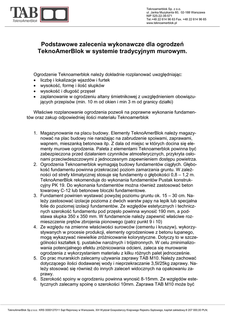 Teknoamerblok Sp. z o.o. ul. Janka Muzykanta 60, 02-188 Warszawa NIP 525-22-39-571 Tel.+48 22 614 96 63 Fax. +48 22 614 96 65 www.teknoamerblok.pl Podstawowe zalecenia wykonawcze dla ogrodzeń TeknoAmerBlok w systemie tradycyjnym murowym. Ogrodzenie Teknoamerblok należy dokładnie rozplanować uwzględniając: liczbę i lokalizacje wjazdów i furtek wysokość, formę i ilość słupków wysokość i długość przęseł zaplanowanie w ogrodzeniu altany śmietnikowej z uwzględnieniem obowiązujących przepisów (min. 10 m od okien i min 3 m od granicy działki) Właściwe rozplanowanie ogrodzenia pozwoli na poprawne wykonanie fundamentów oraz zakup odpowiedniej ilości materiału Teknoamerblok 1. Magazynowanie na placu budowy. Elementy TeknoAmerBlok należy magazynować na plac budowy nie narażając na zabrudzenie spoiwami, zaprawami, wapnem, mieszanką betonowa itp. Z dala od miejsc w których docina się elementy murowe ogrodzenia. Paleta z elementami Teknoamerblok powinna być zabezpieczona przed działaniem czynników atmosferycznych, przykryta osłonami przeciwdeszczowymi z jednoczesnym zapewnieniem dostępu powietrza. 2. Ogrodzenia Teknoamerblok wymagają budowy fundamentów ciągłych. Głębokość fundamentu powinna przekraczać poziom zamarzania gruntu. W zależności od strefy klimatycznej stosuje się fundamenty o głębokości 0,8 – 1,2 m. TeknoAmerBlok rekomenduje do wykonania fundamentów Pustak konstrukcyjny PK 19. Do wykonania fundamentów można również zastosować beton towarowy C-12 lub betonowe bloczki fundamentowe. 3. Fundament powinien wystawać powyżej poziomu gruntu ok. 15 – 30 cm. Należy zastosować izolacje pozioma z dwóch warstw papy na lepik lub specjalna folie do poziomej izolacji fundamentów. Ze względów estetycznych i technicznych szerokość fundamentu pod przęsło powinna wynosić 190 mm, a podstawa słupka 350 x 350 mm. W fundamencie należy zapewnić właściwe rozmieszczenie prętów zbrojenia pionowego (patrz punkt 9 i 10) 4. Ze względu na zmienne właściwości surowców (cementu i kruszyw), wykorzystywanych w procesie produkcji, elementy ogrodzeniowe z betonu łupanego, mogą wykazywać niewielkie zróżnicowanie kolorystyczne. Dotyczy to w szczególności kształtek tj. pustaków narożnych i trójstronnych. W celu zminimalizowania potencjalnego efektu zróżnicowania odcieni, zaleca się murowanie ogrodzenia z wykorzystaniem materiału z kilku różnych palet jednocześnie. 5. Do prac murarskich zalecamy używania zaprawy TAB M10. Należy zachować dotyczącego ilości dodawanej wody i nieprzekraczanie 3,5l/25kg zaprawy. Należy stosować się również do innych zaleceń widocznych na opakowaniu zaprawy. 6. Szerokość spoiny w ogrodzeniu powinna wynosić 8-15mm. Ze względów estetycznych zalecamy spoinę o szerokości 10mm. Zaprawa TAB M10 może być TeknoAmerBlok Sp.z o.o.: KRS 0000127011 Sąd Rejonowy w Warszawie, XIII Wydział Gospodarczy Krajowego Rejestru Sądowego, kapitał zakładowy:8 207 000,00 PLN; Teknoamerblok Sp. z o.o. ul. Janka Muzykanta 60, 02-188 Warszawa NIP 525-22-39-571 Tel.+48 22 614 96 63 Fax. +48 22 614 96 65 www.teknoamerblok.pl użyta również do spoinowania ogrodzenia. Do spoinowania należy używać fugownicy. Spoinowanie może być wykonywanie podczas procesu murowania, jednak najlepsze efekty uzyskuje się spoinując ogrodzenie już po jego wymurowaniu. 7. Dla ogrodzeń o wysokości mniejszej lub równiej 80cm zalecamy stosowanie zbrojenia poziomego w jednej spoinie poziomej. Ogrodzenia wyższe, powinny zostać zazbrojone w dwóch spoinach na wys ~40 i ~80cm nad gruntem. Zbrojenie poziome powinno przechodzić przez słupek tak aby stanowiło wiązanie pomiędzy przęsłem a słupkiem. 8. Zbrojenie pionowe ogrodzenia wykonuje się w przestrzeni wewnętrznej (słupek typu A) stosując 4 pręty Ø6 mm. Przestrzeń ze zbrojeniem wypełniamy betonem klasy C12/15. 9. Pustaki wypełniamy betonem o konsystencji plastycznej – półsuchej. Beton należy dokładnie rozprowadzić i ubić. Do wypełnień stosuje się beton klasy C12/15. 10. W przypadku murowania ogrodzenia ze słupkami z pustaków 4 – stronnie łupanych (słupek typu B) zbrojenie pionowe wykonuje się z wykorzystaniem dwóch kanałów pustaków słupkowych, przy pomocy prętów zbrojeniowych Ø10 mm – po dwa pręty w każdym kanale. Przestrzeń ze zbrojeniem wypełniamy betonem klasy C12/15. 11. Dylatowanie ogrodzenia. Mury i podmurówki ciągłe należy dylatować w maksymalnych odstępach 20m. Przez dylatację rozumie się wykonanie szczeliny nie mniejszej niż 20 mm. Następnie dylatację należy wypełnić materiałem trwale plastycznym. 12. Wykonywanie ogrodzenia powinno odbywać się zgodne z ogólnymi zasadami sztuki budowlanej. TeknoAmerBlok Sp.z o.o.: KRS 0000127011 Sąd Rejonowy w Warszawie, XIII Wydział Gospodarczy Krajowego Rejestru Sądowego, kapitał zakładowy:8 207 000,00 PLN;
