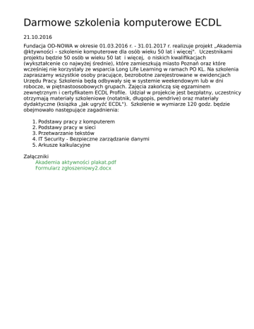 Darmowe szkolenia komputerowe ECDL 21.10.2016 Fundacja OD-NOWA w okresie 01.03.2016 r. - 31.01.2017 r. realizuje projekt „Akademia @ktywności – szkolenie komputerowe dla osób wieku 50 lat i więcej". Uczestnikami projektu będzie 50 osób w wieku 50 lat i więcej, o niskich kwalifikacjach (wykształcenie co najwyżej średnie), które zamieszkują miasto Poznań oraz które wcześniej nie korzystały ze wsparcia Long Life Learning w ramach PO KL. Na szkolenia zapraszamy wszystkie osoby pracujące, bezrobotne zarejestrowane w ewidencjach Urzędu Pracy. Szkolenia będą odbywały się w systemie weekendowym lub w dni robocze, w piętnastoosobowych grupach. Zajęcia zakończą się egzaminem zewnętrznym i certyfikatem ECDL Profile. Udział w projekcie jest bezpłatny, uczestnicy otrzymają materiały szkoleniowe (notatnik, długopis, pendrive) oraz materiały dydaktyczne (książka „Jak ugryźć ECDL"). Szkolenie w wymiarze 120 godz. będzie obejmowało następujące zagadnienia: 1. Podstawy pracy z komputerem 2. Podstawy pracy w sieci 3. Przetwarzanie tekstów 4. IT Security - Bezpieczne zarządzanie danymi 5. Arkusze kalkulacyjne Załączniki Akademia aktywności plakat.pdf Formularz zgłoszeniowy2.docx