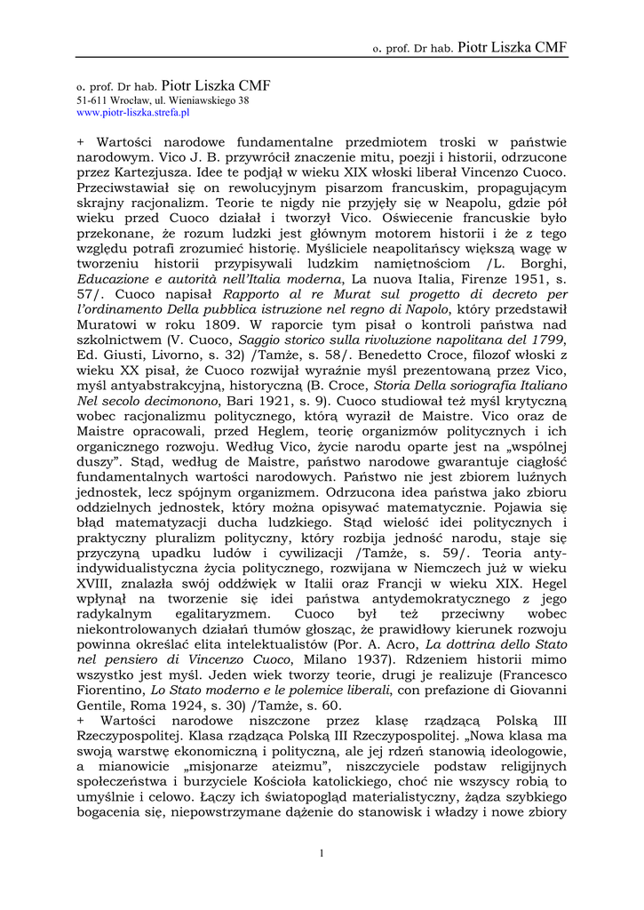 o. prof. Dr hab. Piotr Liszka CMF o. prof. Dr hab. Piotr Liszka CMF 51-611 Wrocław, ul. Wieniawskiego 38 www.piotr-liszka.strefa.pl + Wartości narodowe fundamentalne przedmiotem troski w państwie narodowym. Vico J. B. przywrócił znaczenie mitu, poezji i historii, odrzucone przez Kartezjusza. Idee te podjął w wieku XIX włoski liberał Vincenzo Cuoco. Przeciwstawiał się on rewolucyjnym pisarzom francuskim, propagującym skrajny racjonalizm. Teorie te nigdy nie przyjęły się w Neapolu, gdzie pół wieku przed Cuoco działał i tworzył Vico. Oświecenie francuskie było przekonane, że rozum ludzki jest głównym motorem historii i że z tego względu potrafi zrozumieć historię. Myśliciele neapolitańscy większą wagę w tworzeniu historii przypisywali ludzkim namiętnościom /L. Borghi, Educazione e autorità nell’Italia moderna, La nuova Italia, Firenze 1951, s. 57/. Cuoco napisał Rapporto al re Murat sul progetto di decreto per l’ordinamento Della pubblica istruzione nel regno di Napolo, który przedstawił Muratowi w roku 1809. W raporcie tym pisał o kontroli państwa nad szkolnictwem (V. Cuoco, Saggio storico sulla rivoluzione napolitana del 1799, Ed. Giusti, Livorno, s. 32) /Tamże, s. 58/. Benedetto Croce, filozof włoski z wieku XX pisał, że Cuoco rozwijał wyraźnie myśl prezentowaną przez Vico, myśl antyabstrakcyjną, historyczną (B. Croce, Storia Della soriografia Italiano Nel secolo decimonono, Bari 1921, s. 9). Cuoco studiował też myśl krytyczną wobec racjonalizmu politycznego, którą wyraził de Maistre. Vico oraz de Maistre opracowali, przed Heglem, teorię organizmów politycznych i ich organicznego rozwoju. Według Vico, życie narodu oparte jest na „wspólnej duszy”. Stąd, według de Maistre, państwo narodowe gwarantuje ciągłość fundamentalnych wartości narodowych. Państwo nie jest zbiorem luźnych jednostek, lecz spójnym organizmem. Odrzucona idea państwa jako zbioru oddzielnych jednostek, który można opisywać matematycznie. Pojawia się błąd matematyzacji ducha ludzkiego. Stąd wielość idei politycznych i praktyczny pluralizm polityczny, który rozbija jedność narodu, staje się przyczyną upadku ludów i cywilizacji /Tamże, s. 59/. Teoria antyindywidualistyczna życia politycznego, rozwijana w Niemczech już w wieku XVIII, znalazła swój oddźwięk w Italii oraz Francji w wieku XIX. Hegel wpłynął na tworzenie się idei państwa antydemokratycznego z jego radykalnym egalitaryzmem. Cuoco był też przeciwny wobec niekontrolowanych działań tłumów głosząc, że prawidłowy kierunek rozwoju powinna określać elita intelektualistów (Por. A. Acro, La dottrina dello Stato nel pensiero di Vincenzo Cuoco, Milano 1937). Rdzeniem historii mimo wszystko jest myśl. Jeden wiek tworzy teorie, drugi je realizuje (Francesco Fiorentino, Lo Stato moderno e le polemice liberali, con prefazione di Giovanni Gentile, Roma 1924, s. 30) /Tamże, s. 60. + Wartości narodowe niszczone przez klasę rządzącą Polską III Rzeczypospolitej. Klasa rządząca Polską III Rzeczypospolitej. „Nowa klasa ma swoją warstwę ekonomiczną i polityczną, ale jej rdzeń stanowią ideologowie, a mianowicie „misjonarze ateizmu”, niszczyciele podstaw religijnych społeczeństwa i burzyciele Kościoła katolickiego, choć nie wszyscy robią to umyślnie i celowo. Łączy ich światopogląd materialistyczny, żądza szybkiego bogacenia się, niepowstrzymane dążenie do stanowisk i władzy i nowe zbiory 1 o. prof. Dr hab. Piotr Liszka CMF frazeologii politycznej. Najgorsze, że chcą oni odwrócić uświęcony system wartości. Przez tysiące lat arystokracja opierała się na wartościach apollińskich: Bóg, dusza, prawda, dobro, bohaterstwo, życie dla bliźnich...Nowi ideologowie przyjmują – za E. Nietzschem – dionizyjski system wartości: szatan, ciało, fałsz, zakłamanie, złość, podeptanie piękna klasycznego, zniewalanie, wyzysk, nienawiść, podłość, próżniactwo, tchórzostwo, stosowanie przemocy, skrajny egoizm indywidualny i grupowy. Nieraz posługują się dawnymi nazwami, ale podkładają pod nie znacznie inne treści. Najczęściej nowa klasa posiada zestaw idei niższych od marksistowskich, ale nie mówię tu o faktycznym postępowaniu” (1995) Cz. S. Bartnik, Gromy mówiące. Kazania, przemówienia, publicystyka społecznopolityczna, Dzieła Zebrane T. V. Lublin 1999, s. 326. + Wartości narodowe poniżone Podpalacze kościołów podczas rozruchów ulicznych w Hiszpanii w dniu 11 maja 1931 roku, natomiast zostali przez władze republiki pochwaleni, i określeni nazwą „lud Madrytu”. To lud Madrytu, według oświadczenia rządu, dał przestrogę monarchistom. Faktycznie został sprofanowany hiszpański lud. Dokonano profanacji świątyń. Była też profanacja trumien z ludzkimi szczątkami. W całości była to profanacja narodowego dziedzictwa. Wszystko to jest profanacją hiszpańskiego narodu. Rząd z tej profanacji był bardo zadowolony. Gdy naród, po kilku latach, wystąpi przeciwko komunistycznym rządom, ministrowie zawezwą do swej obrony czołgi z czerwoną gwiazdą. Czołgiści zostaną nazwani ludem Madrytu, obrońcami republiki a Hiszpanie broniący godności swej ojczyzny i narodowych wartości zostaną nazwani faszystami; ale to dopiero za pięć lat. Rząd nie mógł tego dłużej tolerować; czego? rabowania i podpalania, rzucania kamieniami na przedstawicieli porządku publicznego? Nie, rząd to pochwala; nie może tolerować innych poglądów, nie może tolerować istnienia ludzi wierzących i realizujących Ewangelię w codziennym życiu. Tolerancja rządu polega na tym, że nie toleruje on tych, którzy przeciwstawiają się paleniu szkół i świątyń, nie toleruje tych, którzy domagają się wolności dla realizowania podstawowych praw człowieka. + Wartości narodowe przechowywane w armii hiszpańskiej. „armia hiszpańska w chwili wybuchu powstania była organizmem, mającym wiel