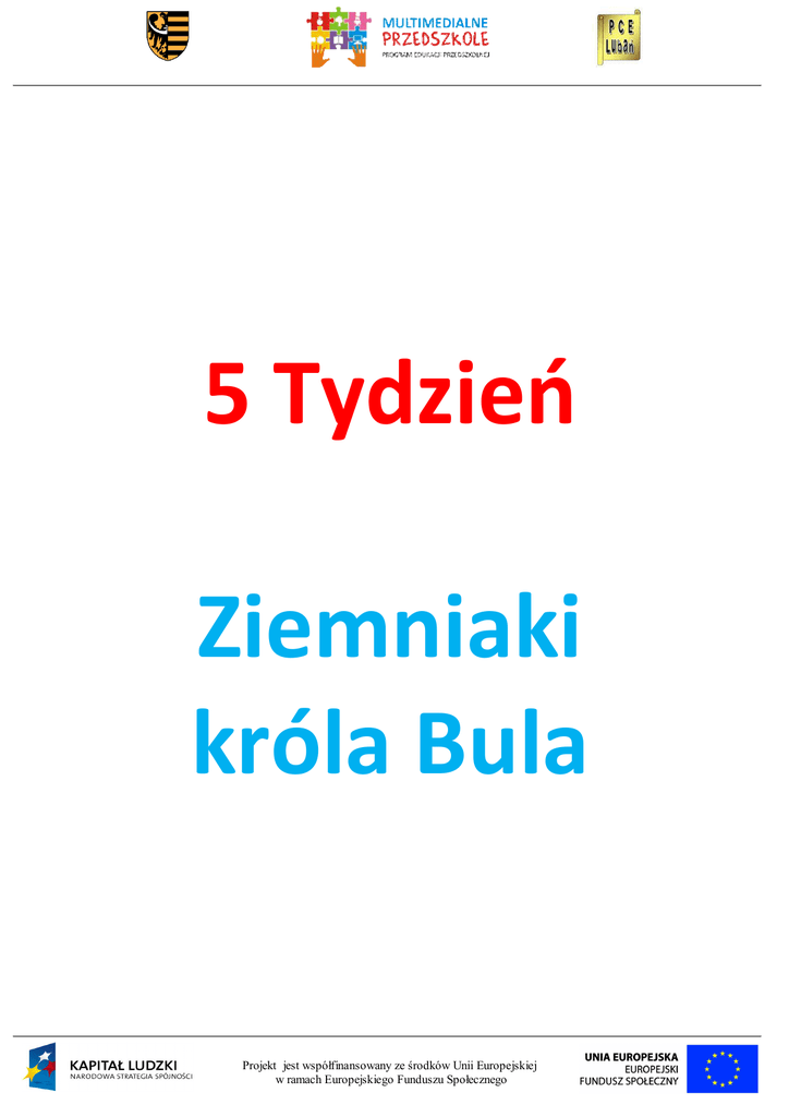 5 Tydzień Ziemniaki króla Bula Projekt jest współfinansowany ze środków Unii Europejskiej w ramach Europejskiego Funduszu Społecznego V. TEMAT TYGODNIA: ZIEMNIAKI KRÓLA BULA Dzień tygodnia: 1 Temat: Kariera ziemniaka Opowiadanie Krótka bajka o ziemniaku (autor nieznany). Dawno temu dobry król przywiózł z dalekiej wyprawy pewną roślinę, o której mówiono, że jest pożyteczna. Kazał król posadzić ją w przypałacowym ogrodzie i niecierpliwie czekał, co z tego wyrośnie. Po jakimś czasie pojawiły się badyle. Zakwitły, ale kwiatki nie były zbyt ładne. Zielone owocniki również nie były smaczne. Zagniewany król kazał roślinę wyrwać z korzeniami i spalić. Dworzanie rozkaz wykonali. Gdy ognisko się dopaliło, któryś ciekawy rozgarnął popiół, aby sprawdzić, co tak ładnie pachnie? Upieczone w żarze ogniska ziemniaki, nie tylko ładnie pachniały, ale też były bardzo smaczne. I tak zaczęła się wielka kariera ziemniaka, potocznie zwanego kartoflem. Dzień tygodnia: 3 Temat: Stempelkowe szlaczki Piosenka Ziemniaczki – muz. Marek Bychawski, słowa Piotr Anioł 1.Wszyscy jedzą kartofelki a ja robię z nich stempelki. ref. Ziemniaczki, ziemniaczki stemplowane znaczki. 2.Tata przytnie kartofelek i gotowy jest stempelek. ref. Ziemniaczki, ziemniaczki stemplowane znaczki. 3.Kółka, gwiazdki, muchomorki, różne śmieszne wzorki. ref. Ziemniaczki, ziemniaczki stemplowane znaczki. 4.Papier, farba i stempelki będzie obraz taki wielki. ref. Ziemniaczki, ziemniaczki stemplowane, kolorowe znaczki. Projekt jest współfinansowany ze środków Unii Europejskiej w ramach Europejskiego Funduszu Społecznego Dzień tygodnia: 4 Temat: Dzień ziemniaka Wiersz aut. G.Sajdolca pt. Wykopki Motyka oznajmiła, że wykopki rozpoczęła, kartofelkowe gody trwają już od środy. Wszyscy kopią kartofelki, jest ich kopiec bardzo wielki. Będzie, będzie placek, ślinkę łyka Jacek. Będą także kluski po skończeniu zwózki. Stos badyli grzeje, a iskierki wietrzyk sieje. Dzieci pchają się gromadą, kartofelki w ogień kładą, bo w popiele upieczone, szczyptą soli przyprawione, kartofelki tak smakują, same w usta im wskakują. Wiklinowe kosze o kartofle proszą, żeby ich było zawsze w bród, zwłaszcza wtedy, gdy dokucza mi głód Projekt jest współfinansowany ze środków Unii Europejskiej w ramach Europejskiego Funduszu Społecznego