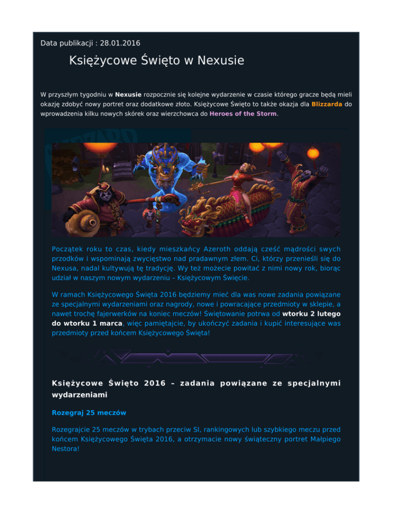 Data publikacji : 28.01.2016 Księżycowe Święto w Nexusie W przyszłym tygodniu w Nexusie rozpocznie się kolejne wydarzenie w czasie którego gracze będą mieli okazję zdobyć nowy portret oraz dodatkowe złoto. Księżycowe Święto to także okazja dla Blizzarda do wprowadzenia kilku nowych skórek oraz wierzchowca do Heroes of the Storm. Początek roku to czas, kiedy mieszkańcy Azeroth oddają cześć mądrości swych przodków i wspominają zwycięstwo nad pradawnym złem. Ci, którzy przenieśli się do Nexusa, nadal kultywują tę tradycję. Wy też możecie powitać z nimi nowy rok, biorąc udział w naszym nowym wydarzeniu – Księżycowym Święcie. W ramach Księżycowego Święta 2016 będziemy mieć dla was nowe zadania powiązane ze specjalnymi wydarzeniami oraz nagrody, nowe i powracające przedmioty w sklepie, a nawet trochę fajerwerków na koniec meczów! Świętowanie potrwa od wtorku 2 lutego do wtorku 1 marca, więc pamiętajcie, by ukończyć zadania i kupić interesujące was przedmioty przed końcem Księżycowego Święta! Księżycowe Święto 2016 – zadania powiązane ze specjalnymi wydarzeniami Rozegraj 25 meczów Rozegrajcie 25 meczów w trybach przeciw SI, rankingowych lub szybkiego meczu przed końcem Księżycowego Święta 2016, a otrzymacie nowy świąteczny portret Małpiego Nestora! Schwytaj Małpiego Nestora Codziennie, póki trwać będzie Księżycowe Święto, otrzymacie zadanie polegające na schwytaniu Małpiego Nestora. Jeśli któryś z graczy w waszych drużynach nie wykonał jeszcze danego dnia tego zadania, szansa, że to ciekawskie stworzenie pojawi się na początku meczu, wynosi 50%. A kiedy już to nastąpi, zostaniecie zmuszeni do szaleńczego pościgu! Kluczem do spowolnienia i schwytania Małpiego Nestora jest współpraca. Kiedy wreszcie uda wam się go złapać, upuści czerwoną kopertę, dzięki której każdy sojusznik z aktywnym zadaniem dotyczącym Małpiego Nestora otrzyma 100 sztuk złota. Nowe przedmioty powiązane z Księżycowym Świętem w sklepie gry W ramach świętowania nowego roku dodaliśmy także nowe skórki bohaterów, dwa zestawy powiązane z Księżycowym Świętem oraz nowego wierzchowca do wewnętrznego sklepu gry. Nie zwlekajcie, jeśli któryś z zestawów przypadnie wam do gustu – będą dostępne tylko podczas Księżycowego Święta! Nowy zestaw ● Zestaw Księżycowe Święto 2016 Illidan, Jaina, Skórka Księżycowy Illidan, Skórka Księżycowa Jaina, Wierzchowiec Księżycowy Smok. ❍ ❍ ❍ ❍ ❍ Powracający zestaw ● Zestaw: Księżycowe Święto 2015 Czen, Li Li, ❍ ❍ ❍ ❍ Skórka Księżycowy Czen, Skórka Księżycowa Li Li. Nowe skórki ● ● Księżycowa Jaina, Księżycowy Illidan. Nowy wierzchowiec ● Księżycowy Smok – dostępny tylko przy zakupie zestawu Księżycowe Święto 2016. Mamy nadzieję, że wspólnie z nami weźmiecie udział w obchodach tegorocznego Księżycowego Święta. Koniecznie pomóżcie towarzyszom w schwytaniu Małpich Nestorów – możecie potrzebować ich pomocy w przyszłości! Do następnego razu i do zobaczenia w Nexusie! Źródło: Battle.net Autor: Sigmar Liczba wyświetleń strony: 752 Data publikacji : 28.01.2016 Tagi: Lunar Festival, skórki, Księżycowe Święto Komentarz (0) dodaj komentarz Brak komentarzy dodaj komentarz Pozostałe nowości DreamHack Open: Valencia 2016 - Nerchio w półfinale - live! DreamHack Valencia to jedno z największych e-sportowych wydarzeń w Europie - dlatego nie mogło zabraknąć na nim StarCrafta II! W czasie rozgrywek 96 graczy będzie konkurować o 50 000 USD oraz 5 000 punktów WCS.Data publikacji: 16.07.20161 Aktualizacja 3.4 – Duże zmiany w rankingu StarCrafta II Na oficjalnym blogu Blizzarda pojawił się nowy wpis dotyczący tym razem zmian w rankingach: Ranking StarCrafta II jest areną dla niezwykle zaciętej rywalizacji. Do walki rusza wielu uczestników, ale tylko nieliczni awansują do ścisłej czołówki.Data publikacji: 03.07.20160 Rozpoczęcie trzeciego sezonu rankingowego 2016 Trzeci sezon tegorocznych rozgrywek ligowych w StarCrafta II uważamy za otwarty! Zresetowano pulę punktów premiowych oraz rankingi i przyznano nagrody za sezon drugi roku 2016.Data publikacji: 26.06.20160 Filmowy „Warcraft” już wkrótce w księgarniach! Powieść „Warcraft”, której wydanie zbiega się z polską premierą filmu „Warcraft. Początek” w reżyserii Duncana Jonesa, do księgarń trafi już 15 czerwca. Na kartach książki czytelnicy wkroczą w nowy wymiar emocji towarzyszących bohaterom fikcyjnych światów Azeroth i Draenor. Za sprawą Christie Golden, pisarki od lat cenionej przez fanów świata Warcraft, konflikt ludzi i orków nabierze jeszcze większej intensywności.Data publikacji: 13.06.20160 Blokada obecnego sezonu i darmowa zmiana nazwy postaci Jak czytamy na oficjalnym blogu Blizzarda: Obecny sezon rankingowy zbliża się ku końcowi i wkrótce zamknięte zostaną wszystkie ligi i dywizje. Kilka dni przed rozpoczęciem nowego sezonu, darmowa zmiana nazwy postaci w StarCraft II zostanie ponownie dodana do wszystkich kont, dla których funkcja ta nie jest obecnie dostępna.Data publikacji: 12.06.20160 Wszystkie nowości