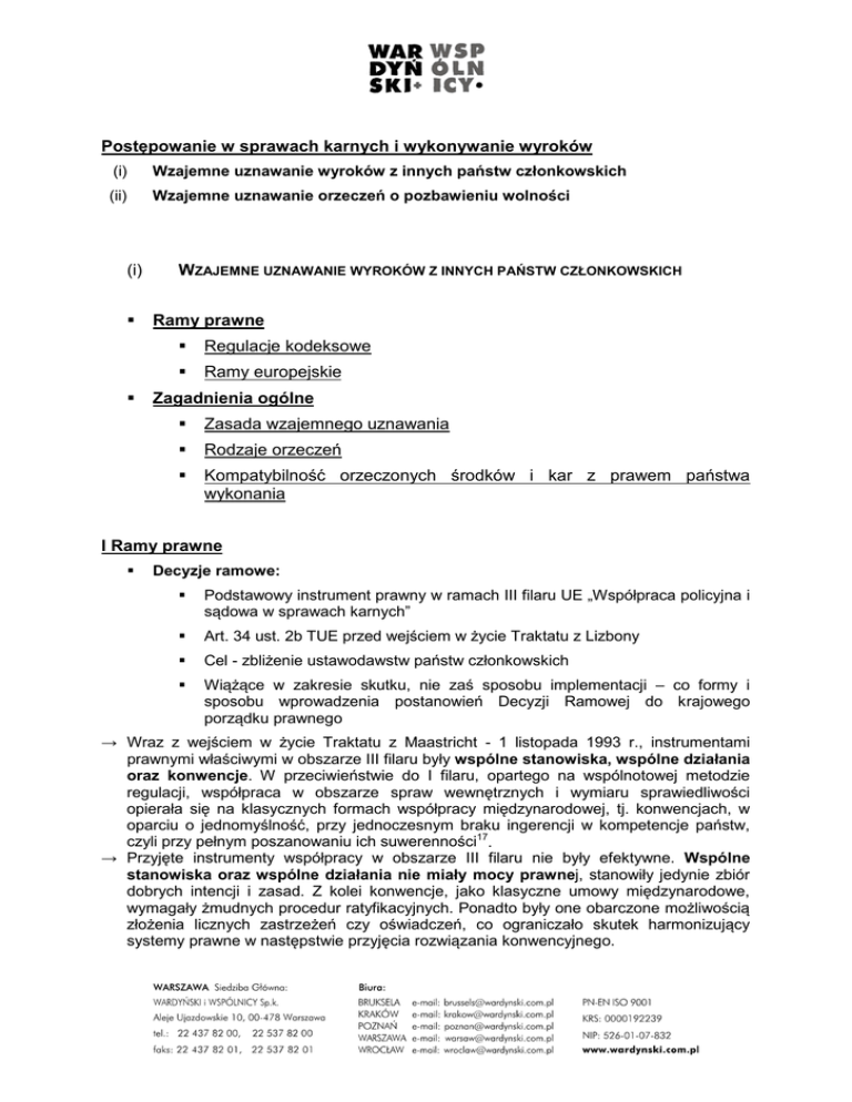 Postępowanie w sprawach karnych i wykonywanie wyroków (i) Wzajemne uznawanie wyroków z innych państw członkowskich (ii) Wzajemne uznawanie orzeczeń o pozbawieniu wolności (i) WZAJEMNE UZNAWANIE WYROKÓW Z INNYCH PAŃSTW CZŁONKOWSKICH Ramy prawne Regulacje kodeksowe Ramy europejskie Zagadnienia ogólne Zasada wzajemnego uznawania Rodzaje orzeczeń Kompatybilność orzeczonych środków i kar z prawem państwa wykonania I Ramy prawne Decyzje ramowe: Podstawowy instrument prawny w ramach III filaru UE „Współpraca policyjna i sądowa w sprawach karnych” Art. 34 ust. 2b TUE przed wejściem w życie Traktatu z Lizbony Cel - zbliżenie ustawodawstw państw członkowskich Wiążące w zakresie skutku, nie zaś sposobu implementacji – co formy i sposobu wprowadzenia postanowień Decyzji Ramowej do krajowego porządku prawnego → Wraz z wejściem w życie Traktatu z Maastricht - 1 listopada 1993 r., instrumentami prawnymi właściwymi w obszarze III filaru były wspólne stanowiska, wspólne działania oraz konwencje. W przeciwieństwie do I filaru, opartego na wspólnotowej metodzie regulacji, współpraca w obszarze spraw wewnętrznych i wymiaru sprawiedliwości opierała się na klasycznych formach współpracy międzynarodowej, tj. konwencjach, w oparciu o jednomyślność, przy jednoczesnym braku ingerencji w kompetencje państw, czyli przy pełnym poszanowaniu ich suwerenności17. → Przyjęte instrumenty współpracy w obszarze III filaru nie były efektywne. Wspólne stanowiska oraz wspólne działania nie miały mocy prawnej, stanowiły jedynie zbiór dobrych intencji i zasad. Z kolei konwencje, jako klasyczne umowy międzynarodowe, wymagały żmudnych procedur ratyfikacyjnych. Ponadto były one obarczone możliwością złożenia licznych zastrzeżeń czy oświadczeń, co ograniczało skutek harmonizujący systemy prawne w następstwie przyjęcia rozwiązania konwencyjnego. → Do poprawy sytuacji przyczynił się Traktat Amsterdamski. Dokonał on istotnych zmian w zakresie III filaru o nowo brzmiącej nazwie "współpraca policyjna i sądowa w sprawach karnych", którego zakres objął zapobieganie i zwalczanie przestępczości, współpraca policyjna i współpraca sądowa w sprawach karnych; włączono tu także zagadnienie zwalczania ksenofobii i rasizmu. → Na mocy art. 34 TUE przyjęto nowe formy działania w obszarze III filaru. Z katalogu instrumentów prawnych usunięto wspólne działania, zaś na plan pierwszy wysunęły się wspólne stanowiska – miały charakter zobowiązań politycznych a ich celem było określenie sposobu postępowania Unii Europejskiej w konkretnej sprawie. → Kolejnym instrumentem były decyzje ramowe podejmowane "w celu zbliżania przepisów ustawowych i wykonawczych państw członkowskich". Wiążą one państwa członkowskie w odniesieniu do rezultatu, który ma być osiągnięty, pozostawiają jednak organom krajowym tych państw swobodę wyboru formy i środków. Choć państwa członkowskie UE mają autonomię przy wyborze formy implementacji, to jednak są ograniczone zasadami jednolitego prawa wspólnotowego, wymogiem pełnej skuteczności postanowień decyzji ramowej oraz ustaleniem jej celu w oparciu o wykładnię wszystkich przepisów decyzji ramowej i jej preambuły. "Dokonujący wykładni sąd, stosując prawo krajowe, ma obowiązek dokonać wykładni tego prawa, na ile to tylko możliwe, w świetle brzmienia i celów tej decyzji ramowej" (wyrok w sprawie Pupino). → Decyzje jako trzeci instrument prawny III filaru - charakter wiążący, choć nie wywołuje skutku bezpośredniego. → Ostatnim źródłem prawa trzeciofilarowego, które zostało wskazane w art. 34 ust. 2 TUE, są konwencje. Co do zasady wchodzą one w życie po przyjęciu ich przez co najmniej połowę państw członkowskich i obowiązują między tymi państwami, które do nich przystąpiły. Odegrały one istotną rolę w "erze" przed Amsterdamem, bowiem wówczas brak było środków prawnych wiążących państwa członkowskie26. → Na mocy art. 34 dawnego TUE decyzje ramowe, obok wspólnych stanowisk, decyzji, oraz konwencji był instrumentem regulacji prawnej UE w ramach III filaru tj. Współpracy sadowej i policyjnej w sprawach karnych”. → Służyły one regulacji w tej dziedzinie UE do dnia 1 grudnia 2009 r. kiedy to w życie wszedł Traktat z Lizbony, który zniósł strukturę filarową UE. Postanowienia dotyczące współpracy policyjnej i sądowej w sprawach karnych zostały włączone do Traktatu o Funkcjonowaniu Unii Europejskiej (TFUE). Po wejściu w życie Traktatu z Lizbony nastąpiło objęcie dotychczasowego III filaru UE jednolitym unijnym reżimem prawnym. Celem jest sprawniejsze i łatwiejsze podejmowanie działań w tym zakresie i wyeliminowanie elementów ograniczających rozwój tej dziedziny prawa zarówno w aspekcie proceduralnym jak i instytucjonalnym. → Po wejściu w życie Traktatu z Lizbony, instrumentem regulacji prawnej zakresie współpracy sądowej w sprawach karnych są dyrektywy. Dyrektywy: Współpraca sądowa i policyjna w sprawach karnych – unijny reżim prawny od 1 grudnia 2009 r. – wejście w życie Traktatu z Lizbony Art. 82 ust. 2 i 83 ust. 1 TFUE Stanowienie norm minimalnych Artykuł 82 (dawny artykuł 31 TUE) 1. Współpraca wymiarów sprawiedliwości w sprawach karnych w Unii opiera się na zasadzie wzajemnego uznawania wyroków i orzeczeń sądowych oraz obejmuje zbliżanie przepisów ustawowych i wykonawczych Państw Członkowskich w dziedzinach, o których mowa w ustępie 2 i w artykule 83. 2 Parlament Europejski i Rada, stanowiąc zgodnie ze zwykłą procedurą ustawodawczą, przyjmują środki mające na celu: a) ustanowienie zasad i procedur zapewniających uznawanie w całej Unii wszystkich form wyroków i orzeczeń sądowych; b) zapobieganie sporom o jurysdykcję między Państwami Członkowskimi i ich rozstrzyganie; c) wspieranie szkolenia sędziów i innych pracowników wymiaru sprawi